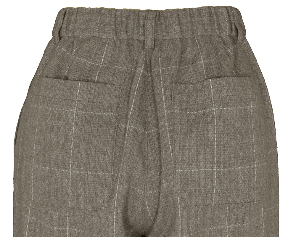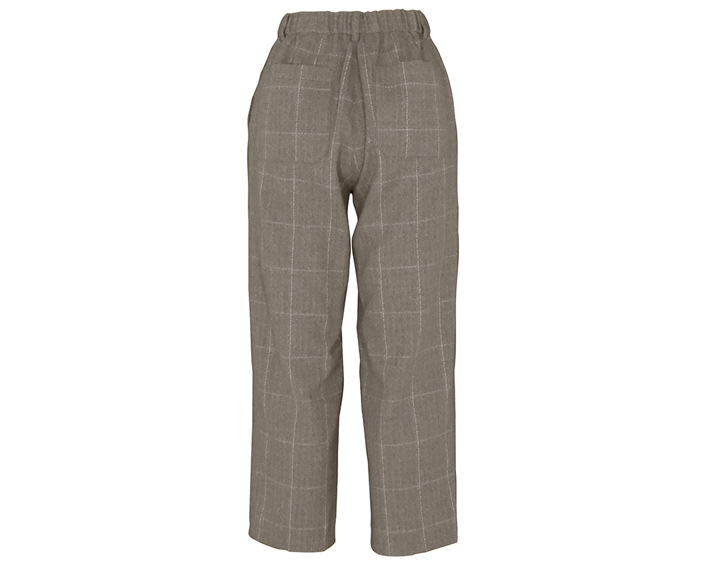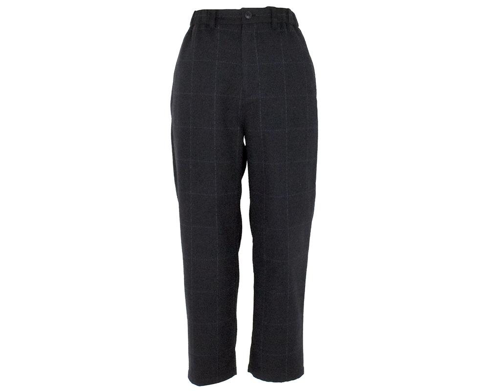 ・脇から後ろウエストにかけてゴムを入れた仕様のテーパードパンツです。前中心付近にはゴムを入れずにすっきり見えるサイズ感で仕立てました。前開き、両脇、後ろポケットあり。