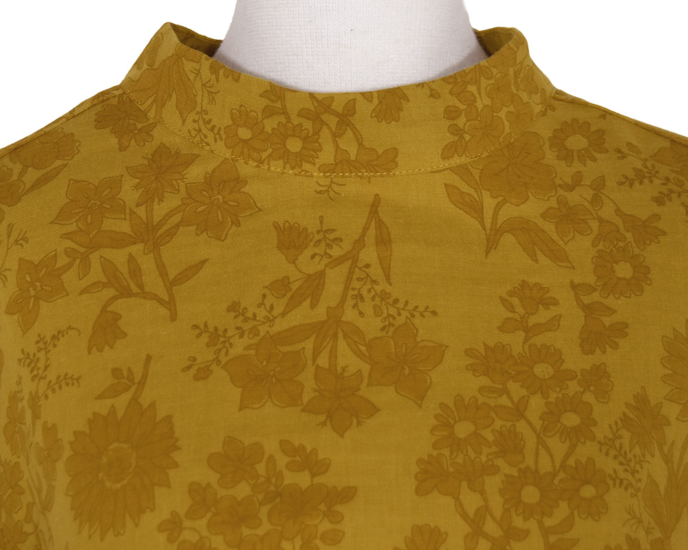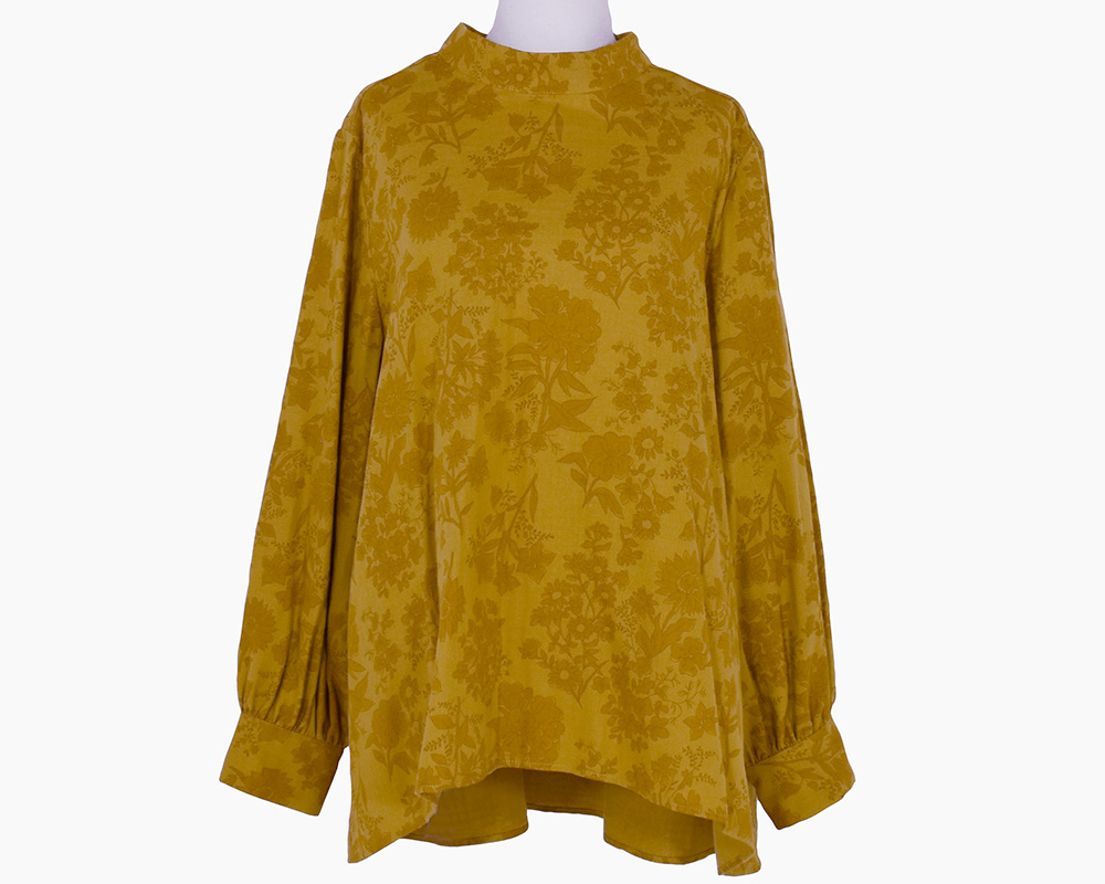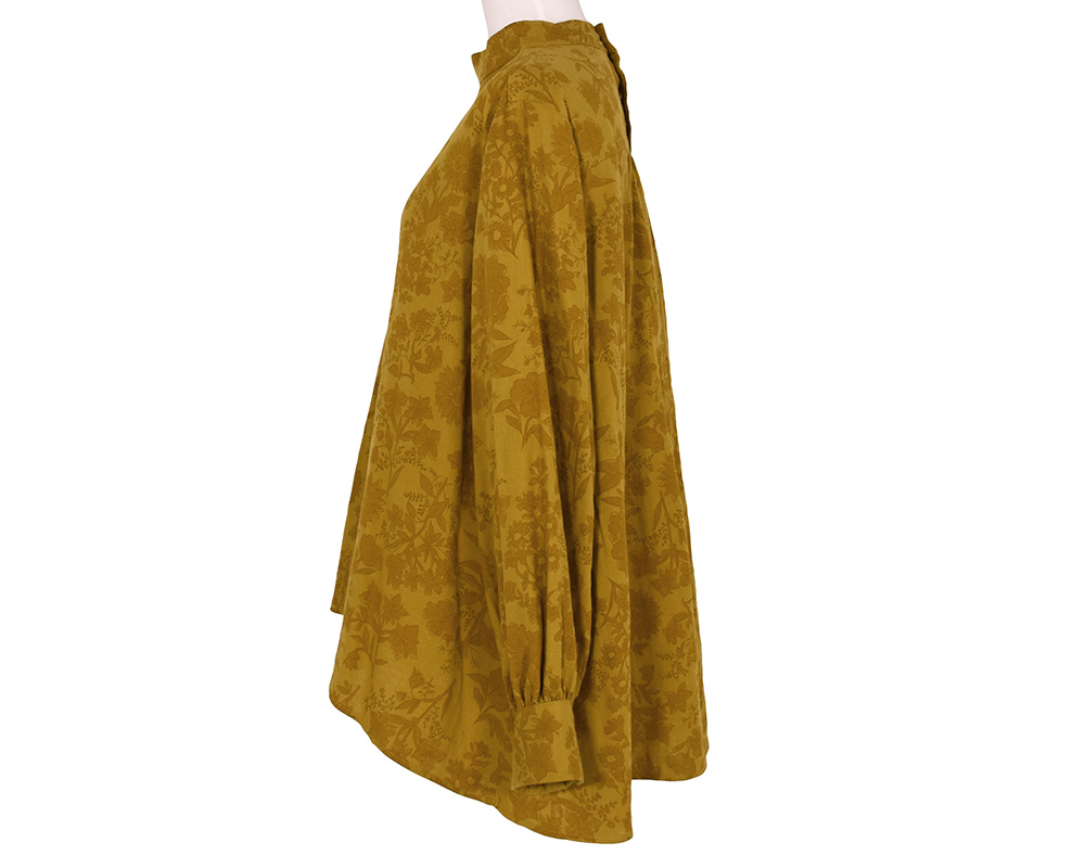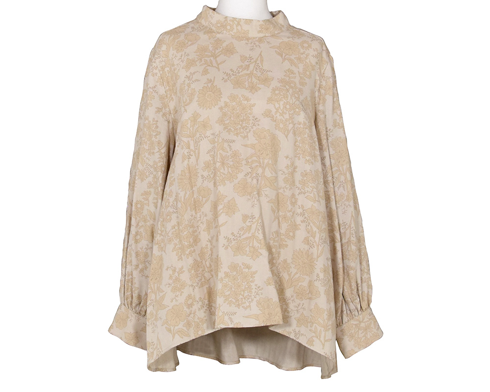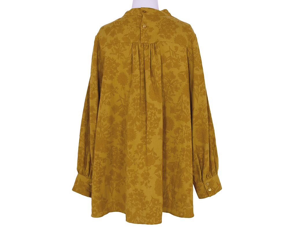 ・首元に沿うスタンドカラーと、前後差のある着丈、女性らしい印象のシルエットフラワーが特徴のプルオーバーブラウスです。顔まわりにほどよいボリュームと華やかさを添え、ボトムインした際もバランスよく着こなせます。スカートからパンツまで幅広いコーディネートに合う一枚です。