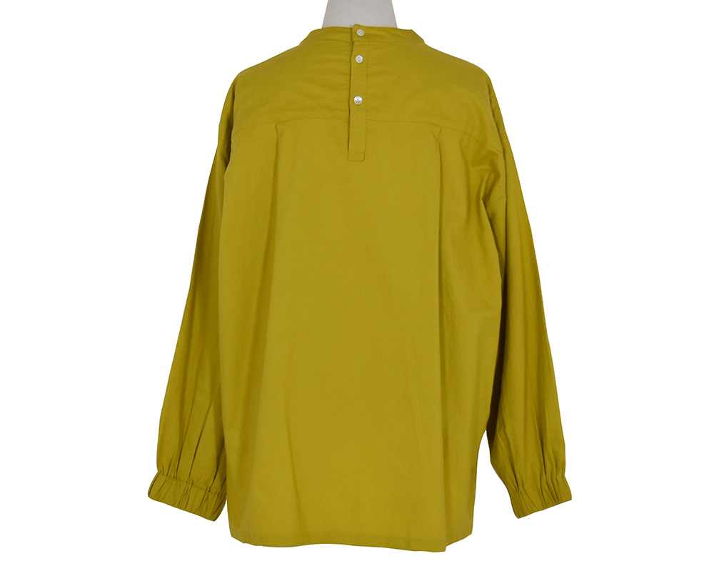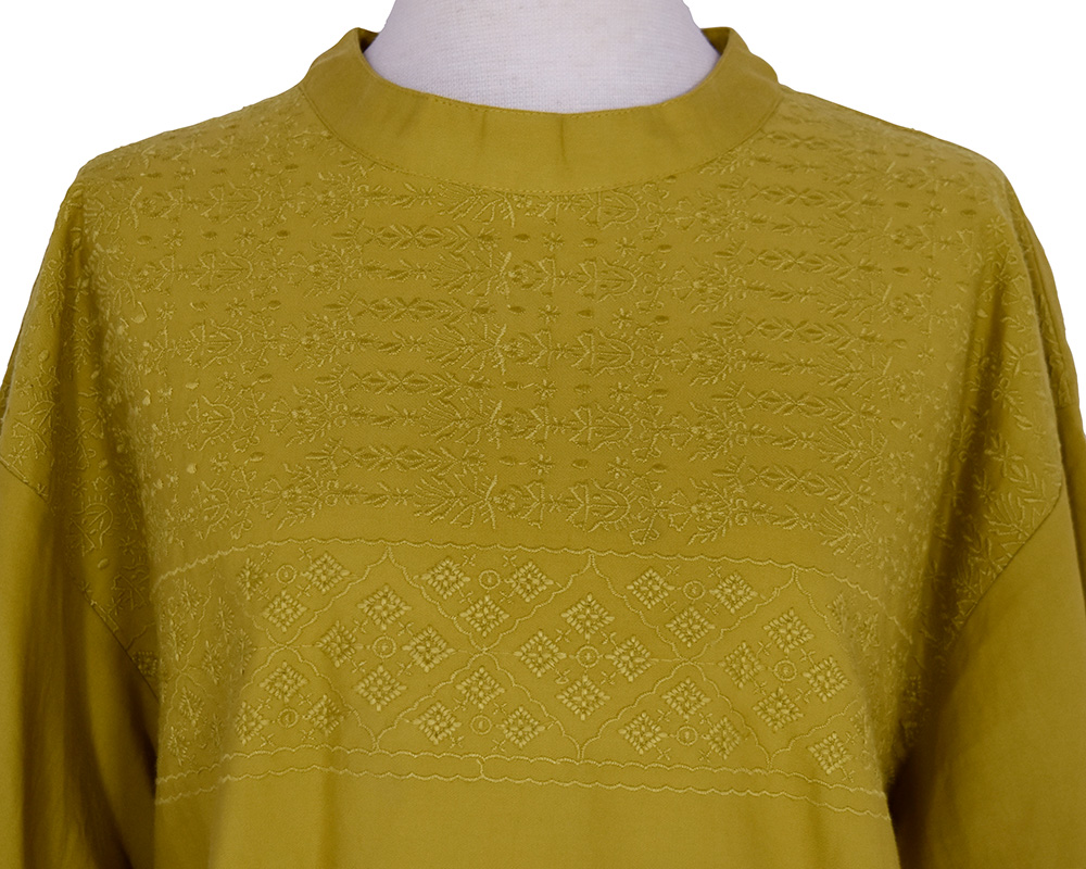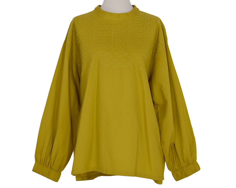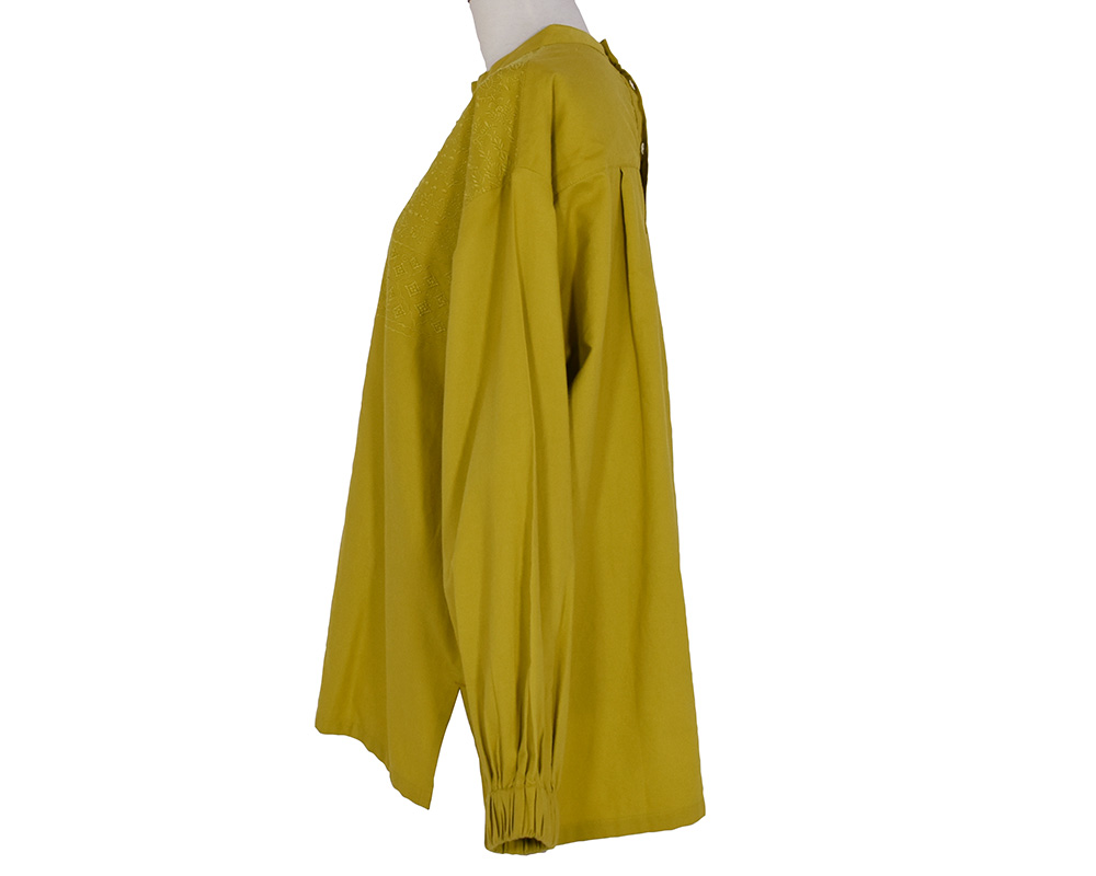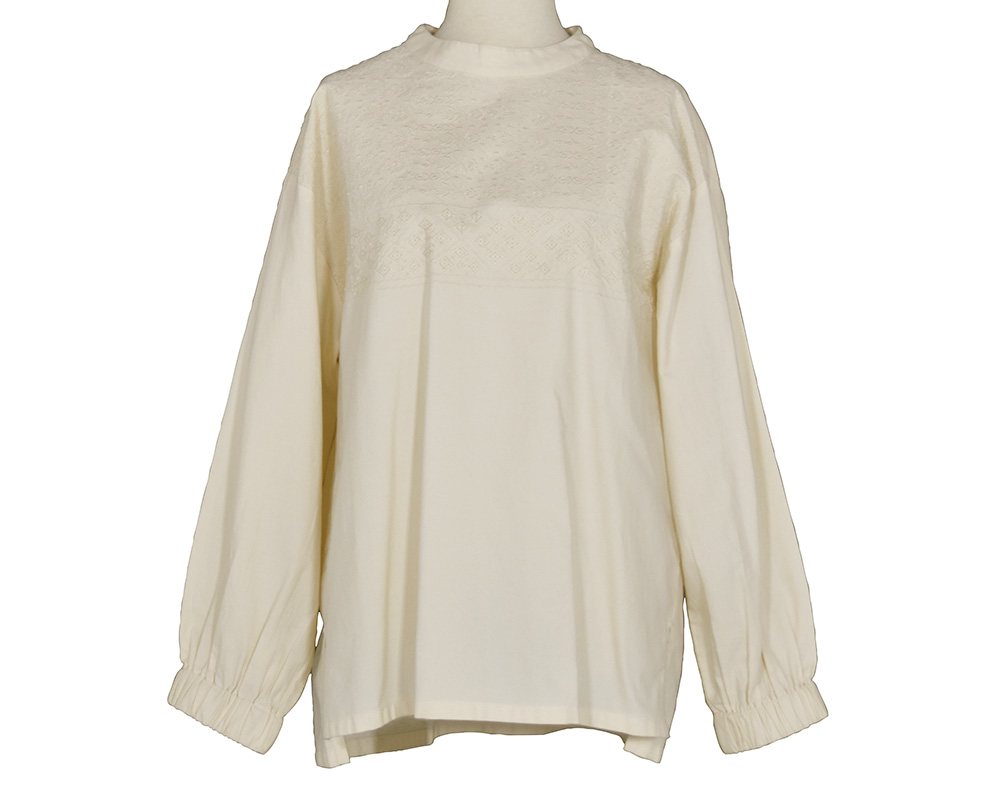・フロントに草花(※タイム・エキナセア)モチーフのバンダナ風刺繍を施したプルオーバーブラウスです。繊細な刺繍が上品で、カーディガンなどを重ねてもフロント刺繍が目をひき、華やかな印象です。袖口はブラウジングができるゴム仕様です。
