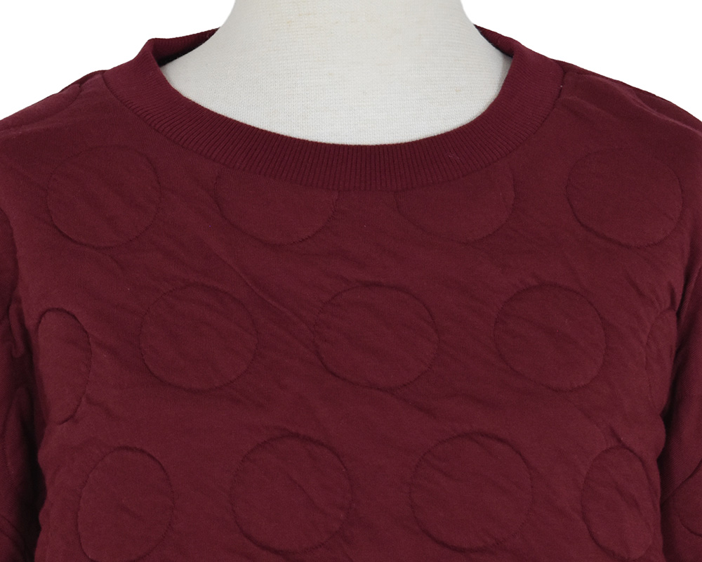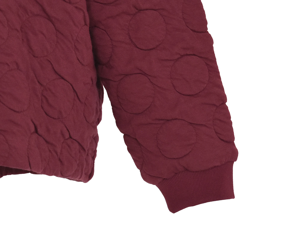 ・ドット柄が浮き出るように編み立てた、ふくれニットジャカード素材です。薄いワタを入れることで、生地に膨らみを出した、柔らかい着心地の暖かい素材です。