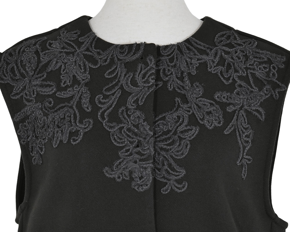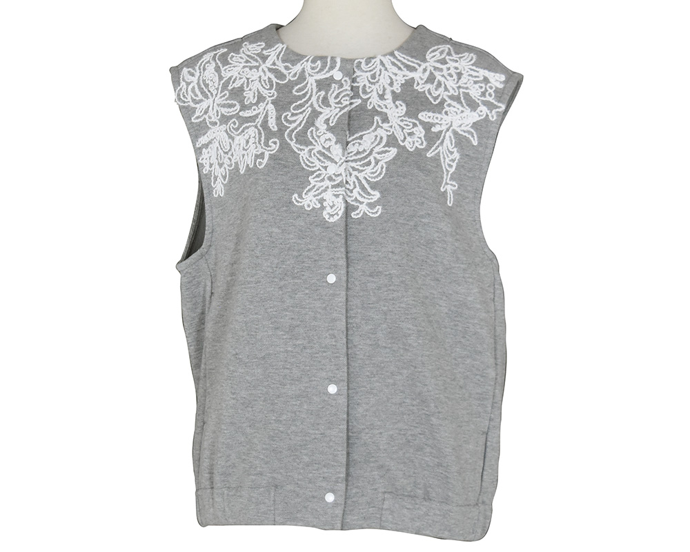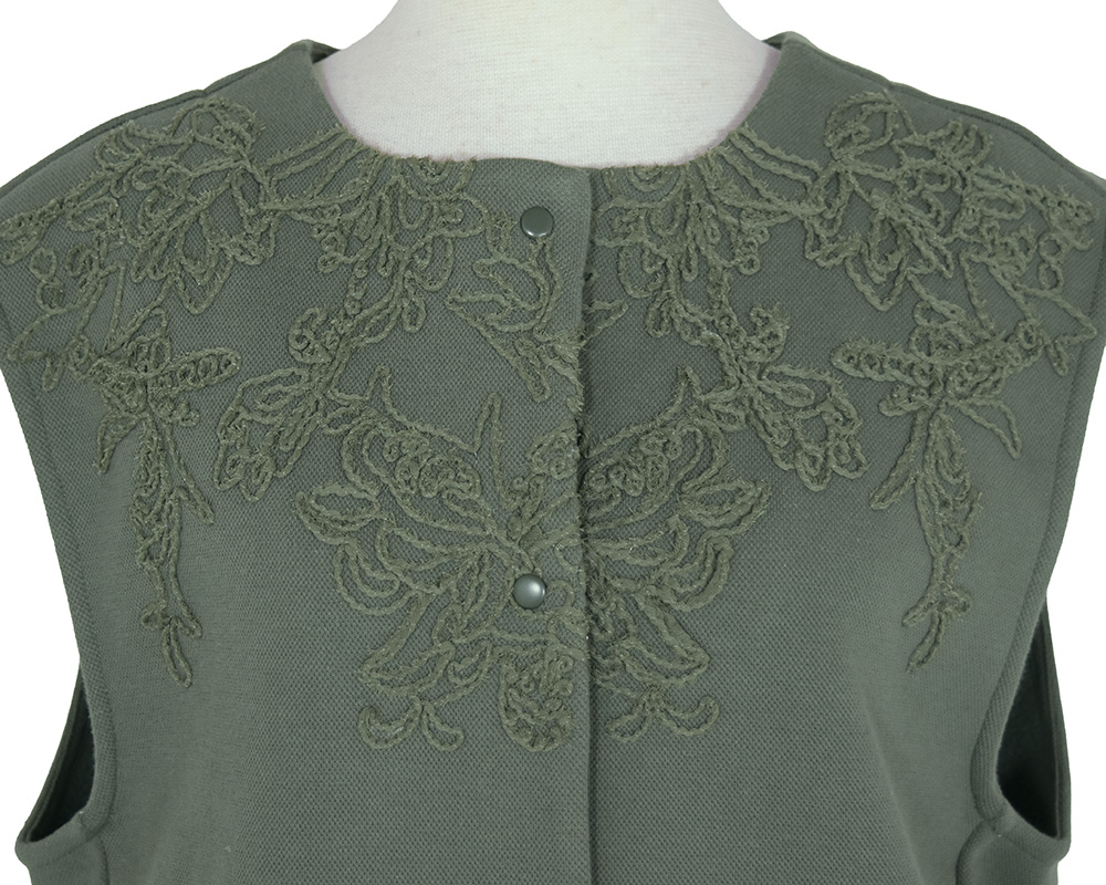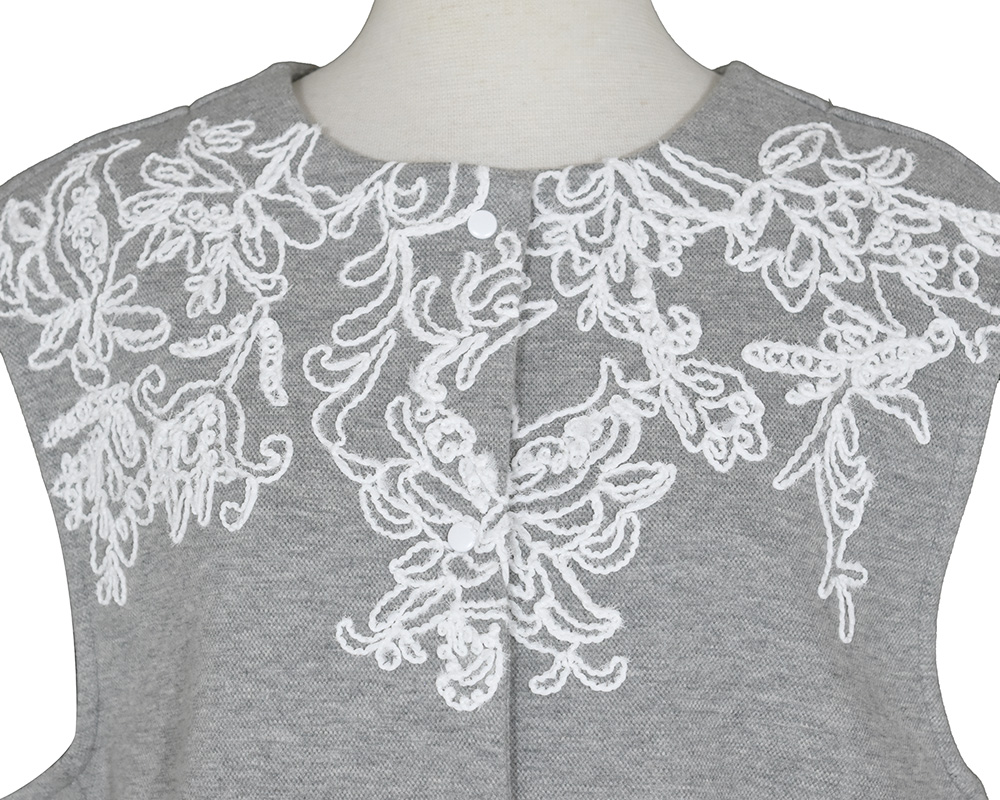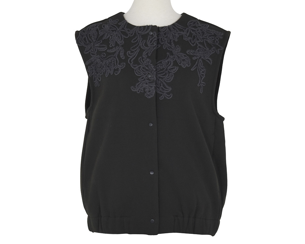 ・ヨーク部分にあしらった刺繍が目を引くジレです。柔らかな生地テープに、ダイヤモンドリリーの花をテープ刺繍で表現し、ウォーム感のあるニュアンスをプラスしています。ブラウスやカットソーに重ねるだけで華やかさが加わるアイテムです。
