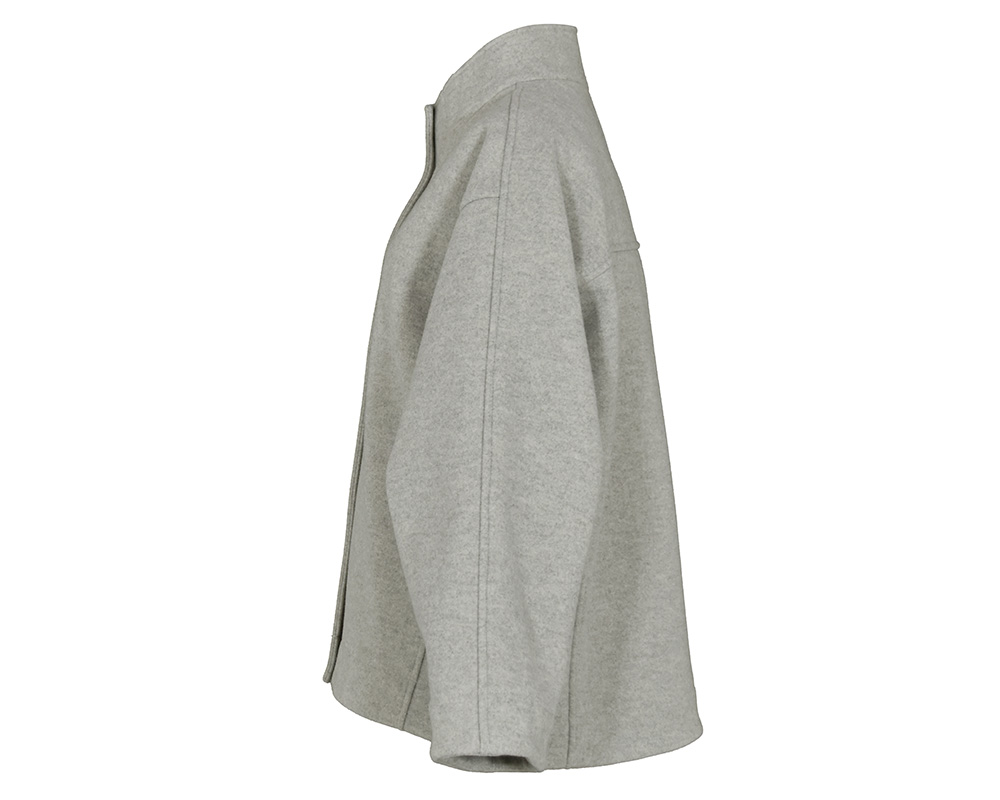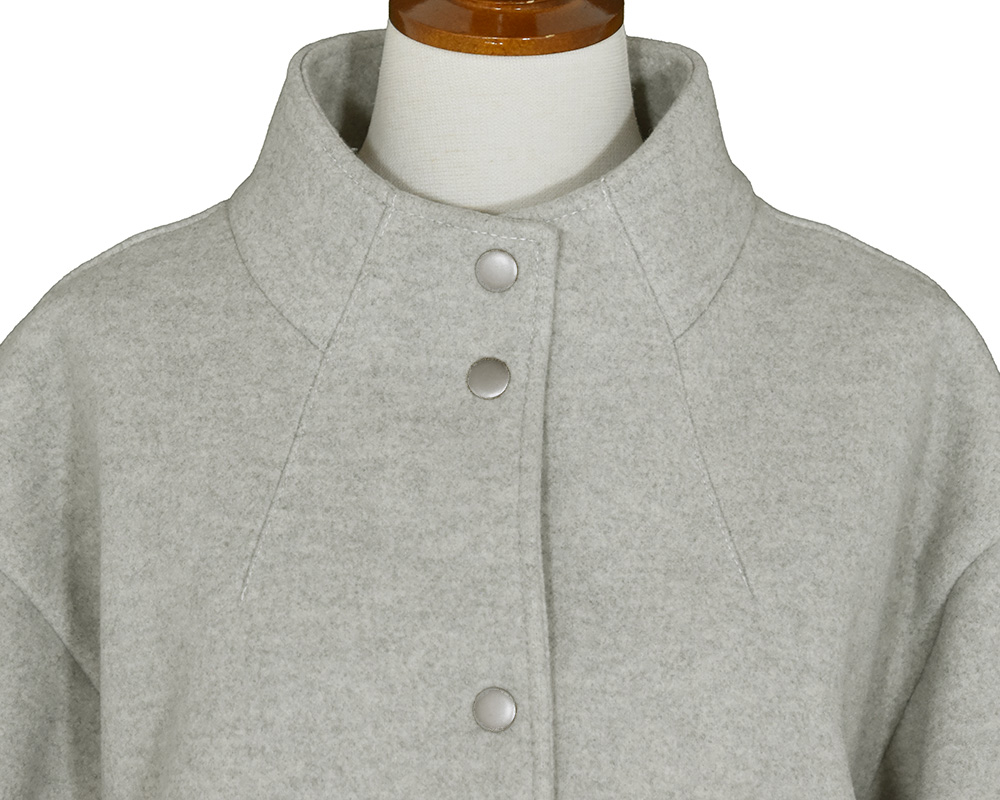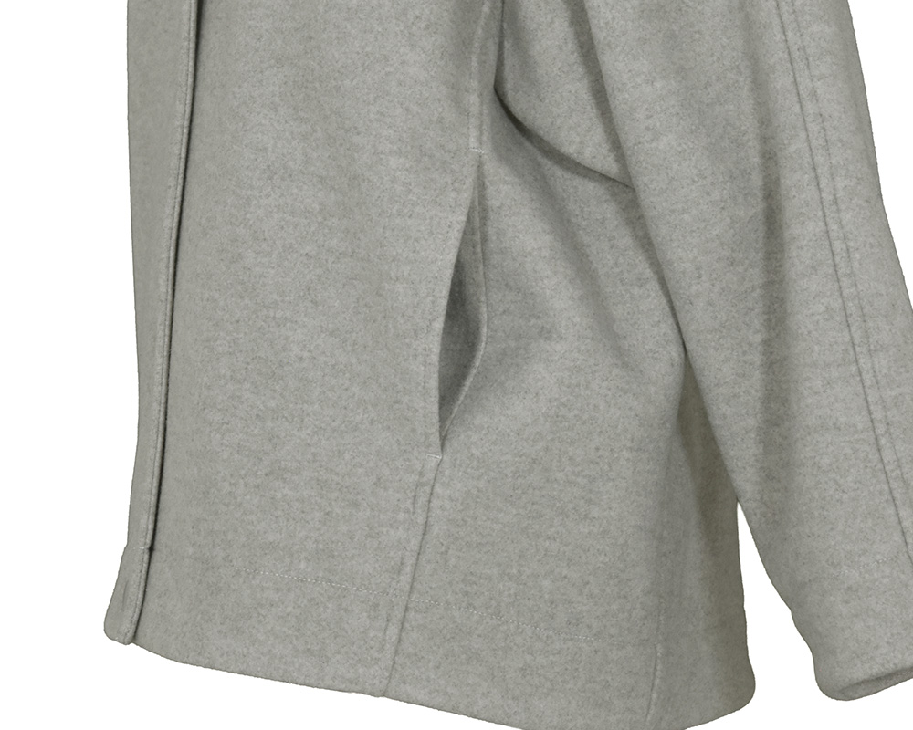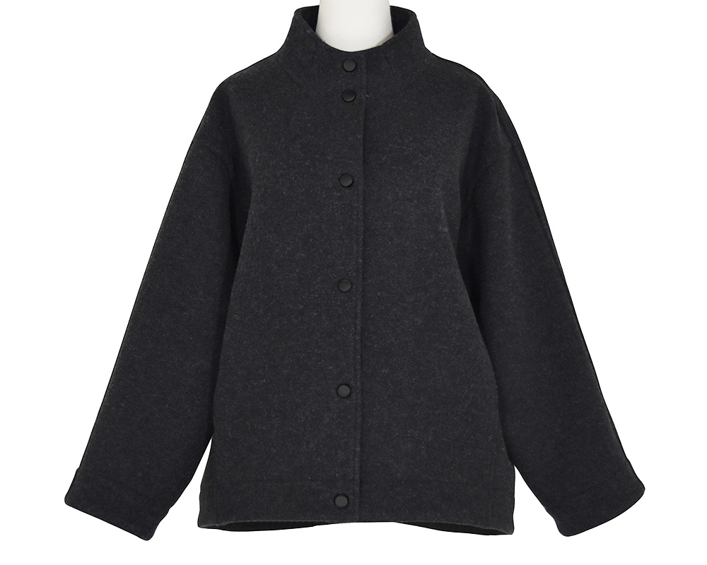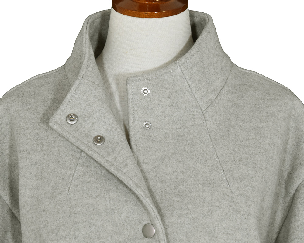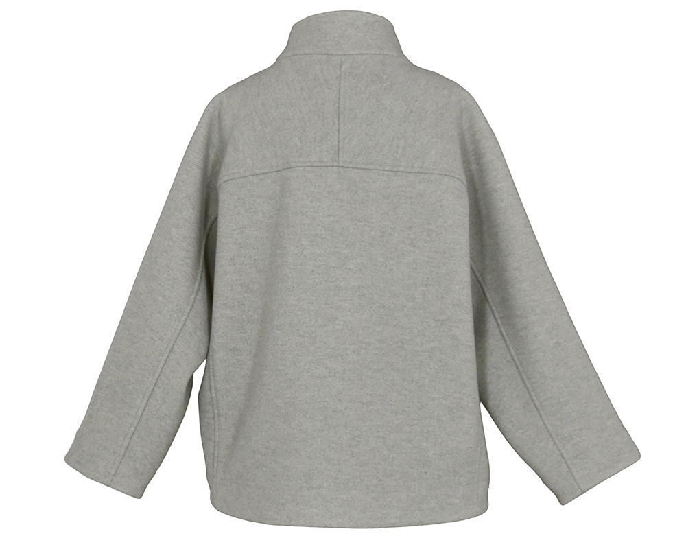・表はメルトンライクで、裏にフリースをボンディングしたショートコートです。ゆったりとしたサイズ感でリラックスして着用でき、ハリのある素材なので型崩れしにくいのが特徴です。スタンドカラーは防寒性があり、衿を開けてもバランスよく見えるパターンに仕上げています。両脇にポケット付き。