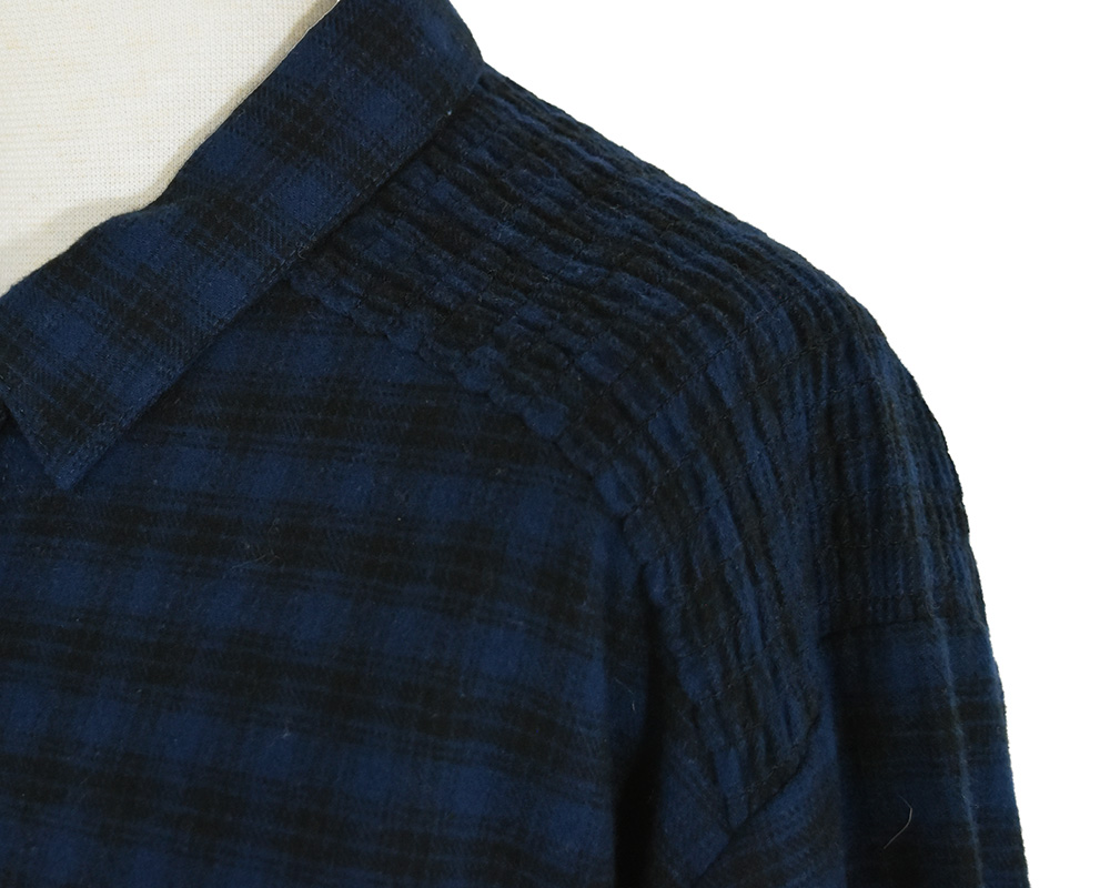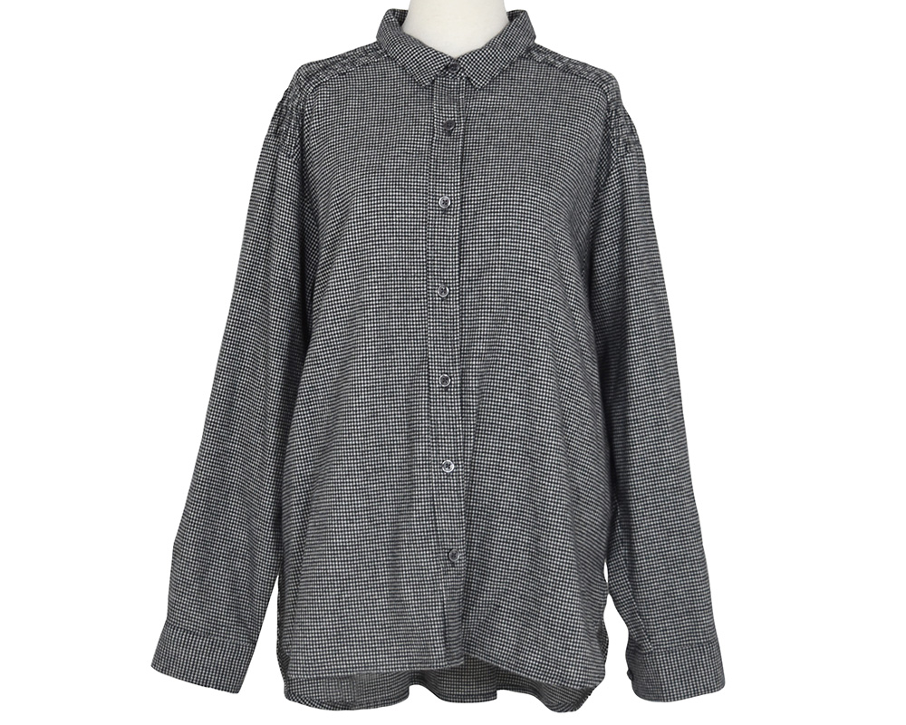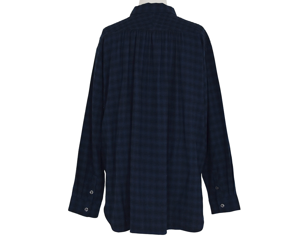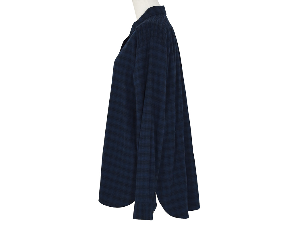 ・ショルダーヨークにシャーリング加工を施したブラウスです。スタンダードなシルエットのブラウスながら、シャーリングギャザーのデザインで柔らかい雰囲気が加わり女性らしさのある一枚です。