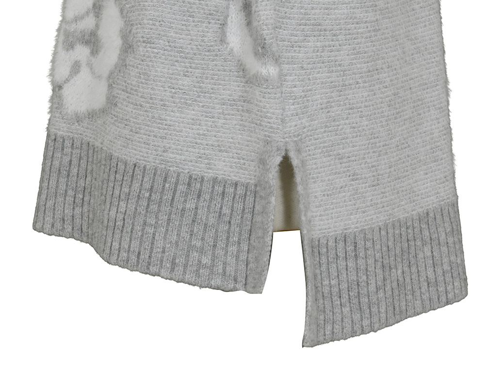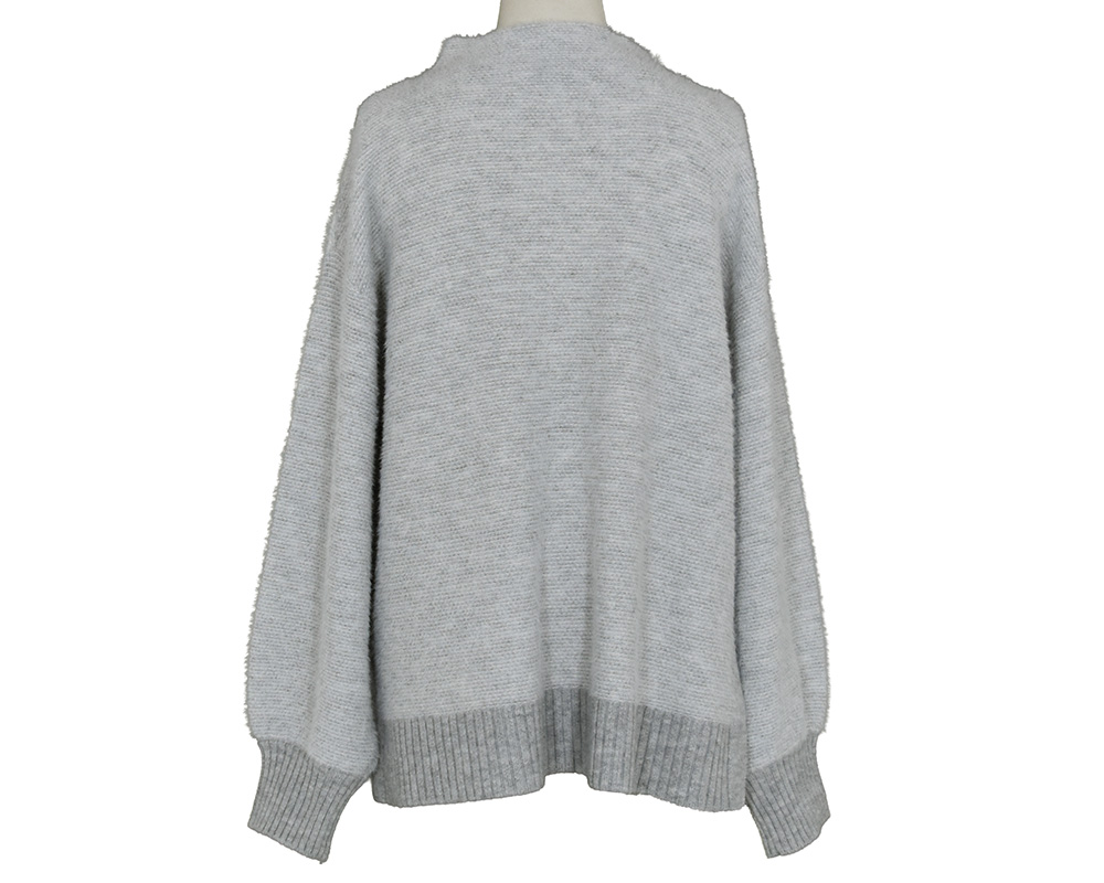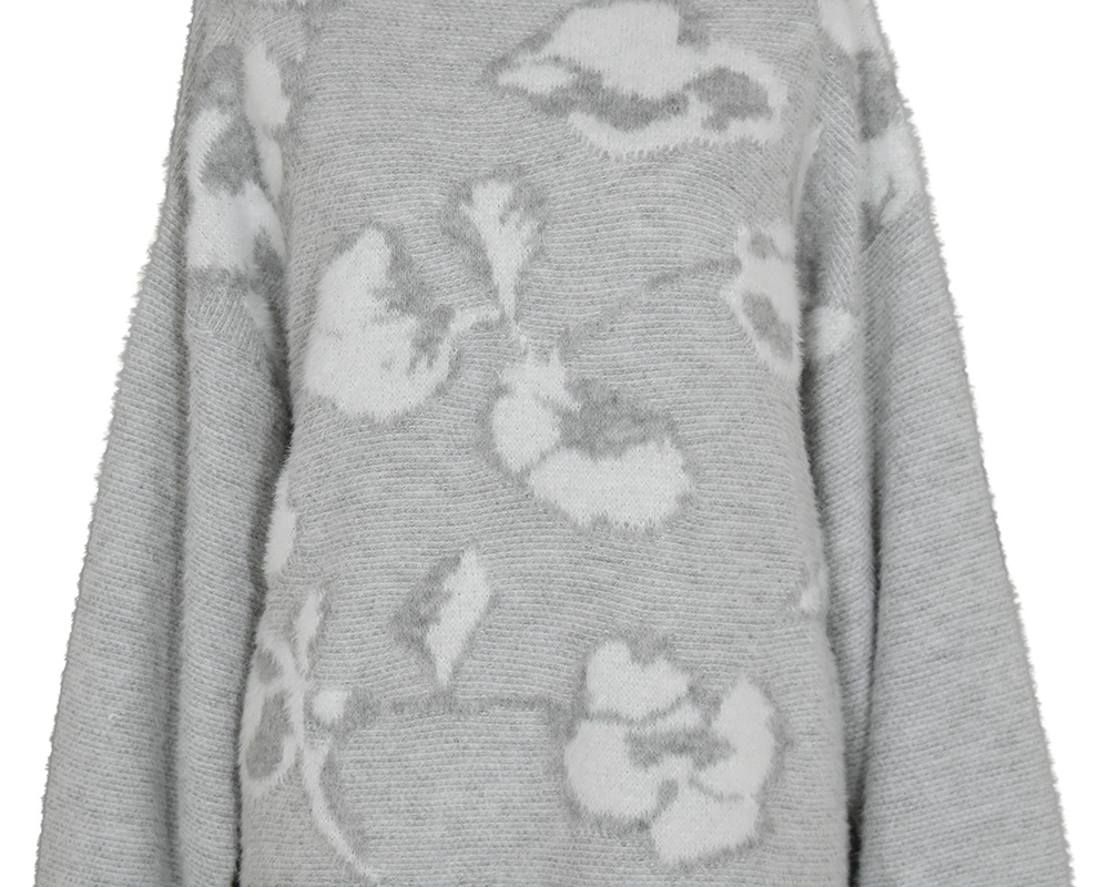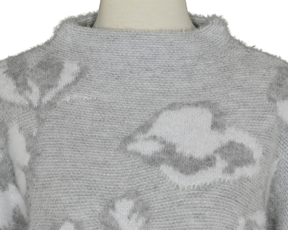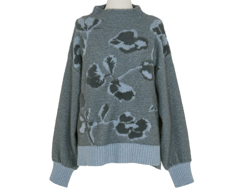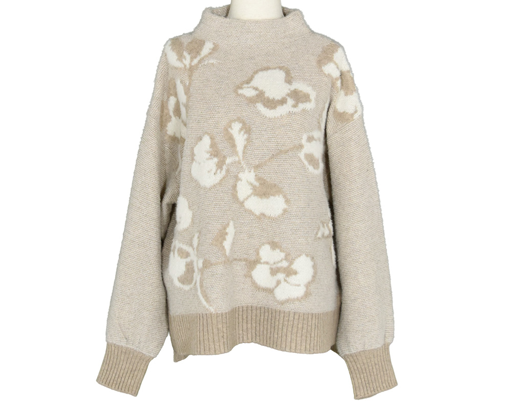 ・軽くふわふわと柔らかい素材で、前身頃が花柄ジャカード編みのプルオーバーです。立体感のあるボトルネックやボリュームのある袖が女性らしく、一枚で華やかに着ていただけます。花柄はこの季節に咲く、山茶花をイメージしています。