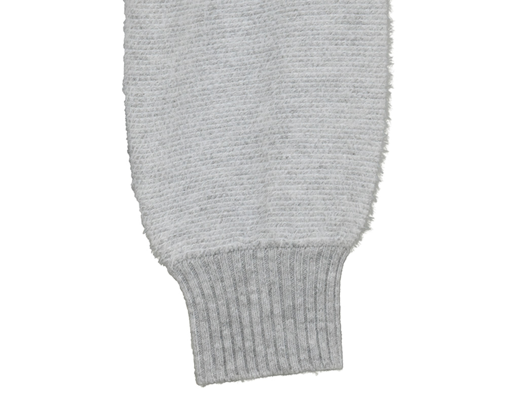 ・フェザー糸を使用したジャカード編みです。色の違う二種類の糸を使用することで、柄に立体感を出しています。とても軽く柔らかな、肌触りの良い素材です。