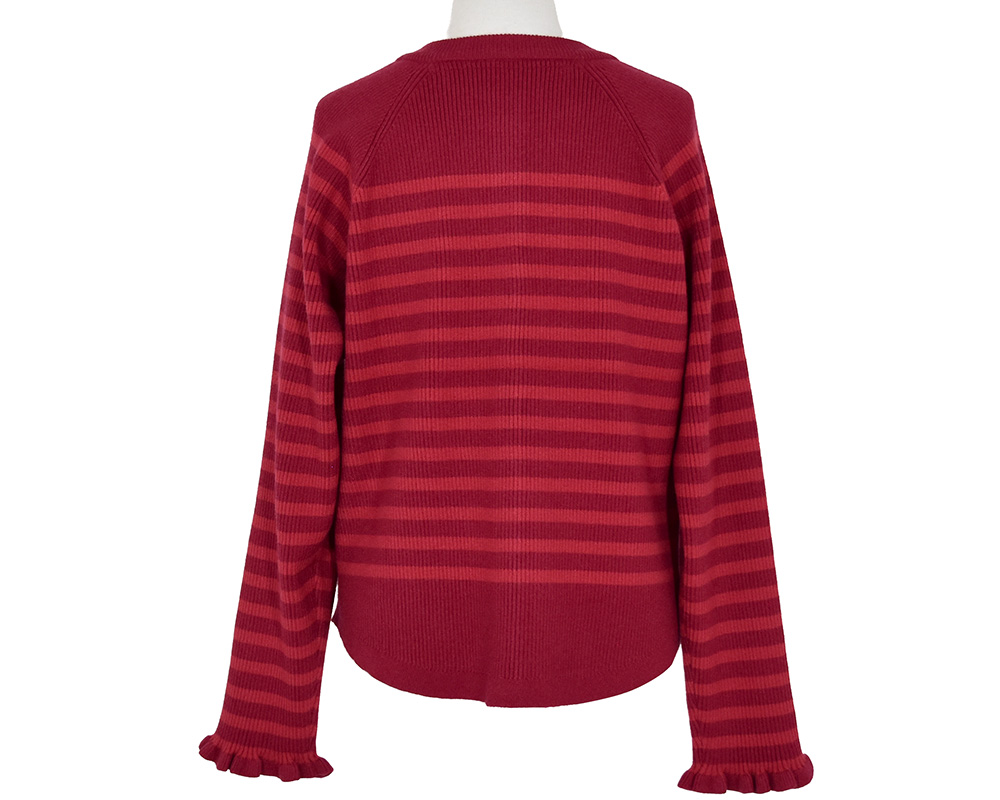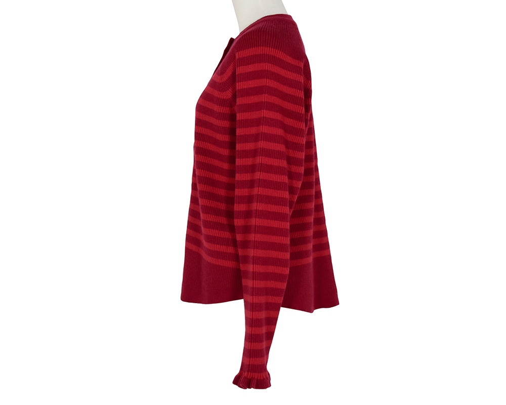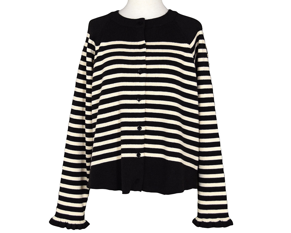・もっちりとした肌触りとストレッチ性が魅力のリブニットカーディガンです。明るい印象のボーダー柄に袖口のフリルやラウンドヘムがポイントです。羽織にもプルオーバーにも着用できます。