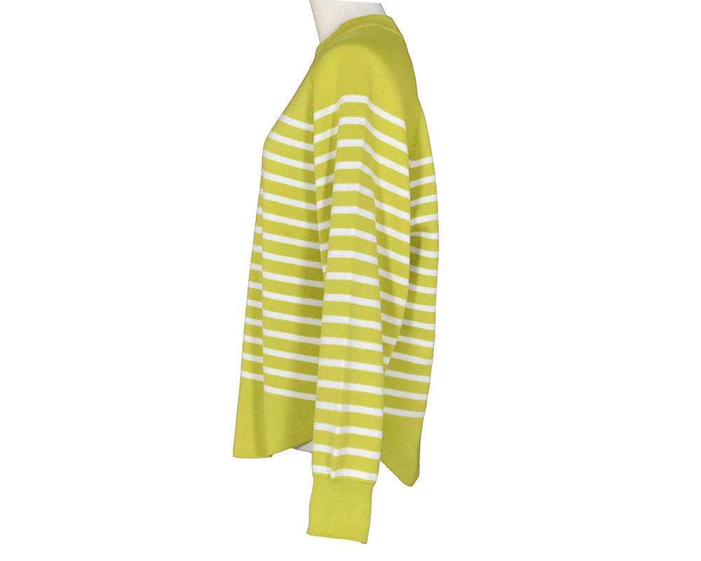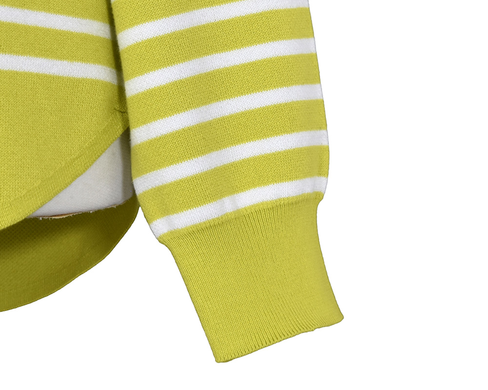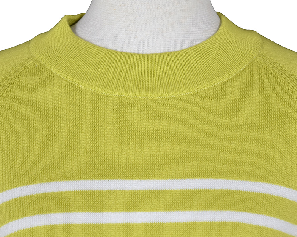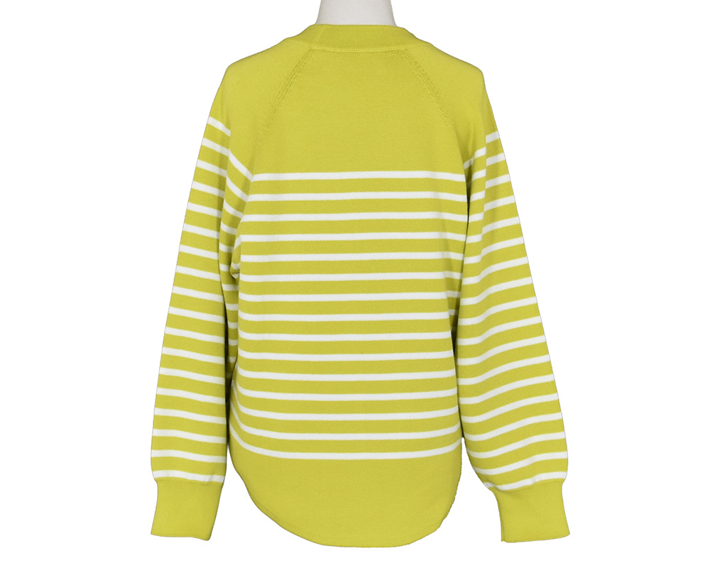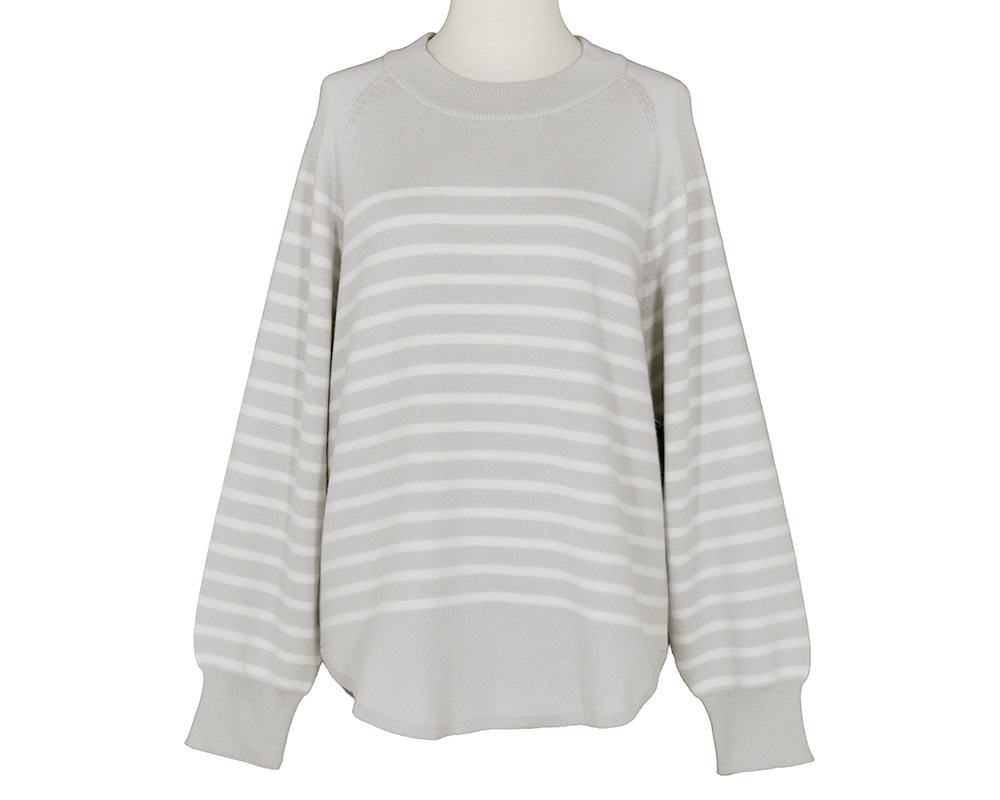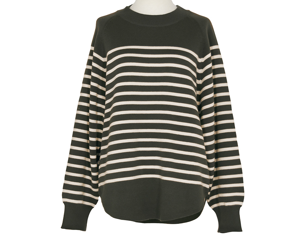 ・目の詰まったダブルジャカード編みのプルオーバーです。スタイリングに華やかな印象をプラスするボーダーデザインです。裾はラウンドヘム仕様で、ラグランスリーブにより動きやすさも備えたデザインです。