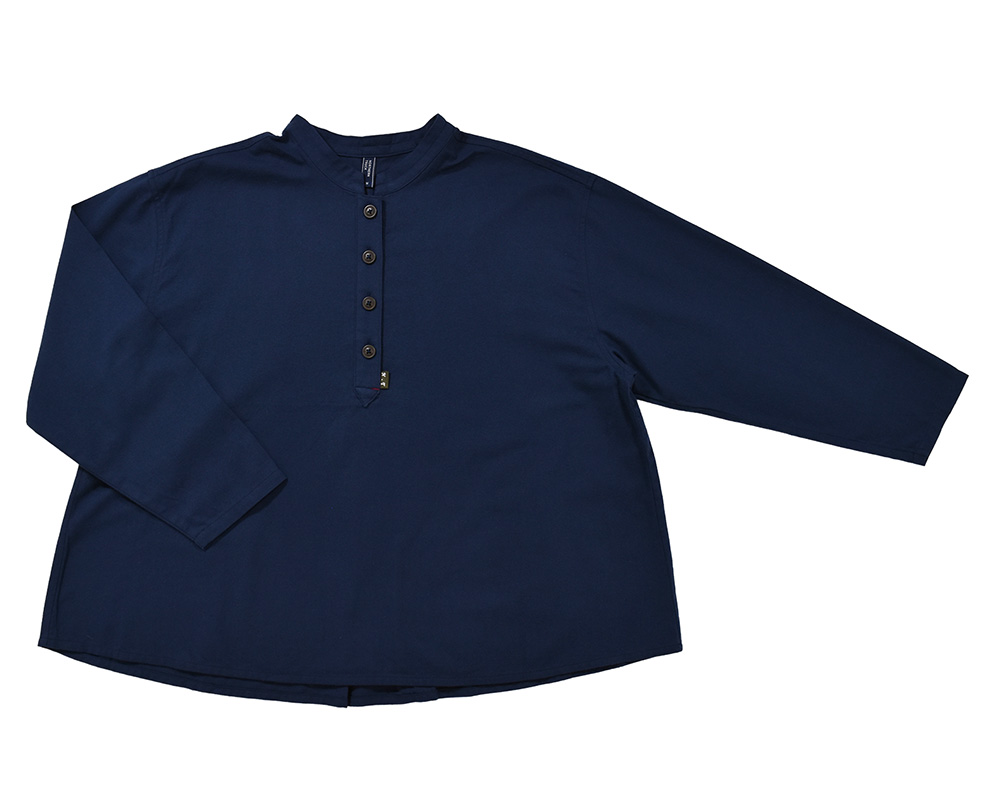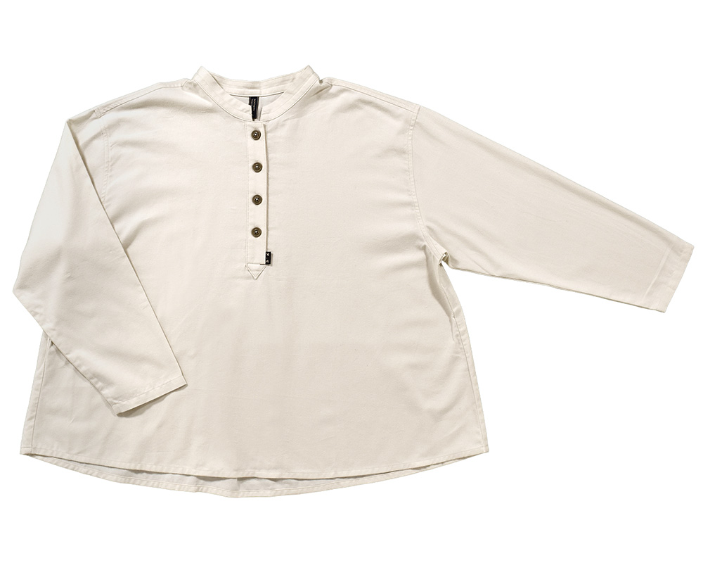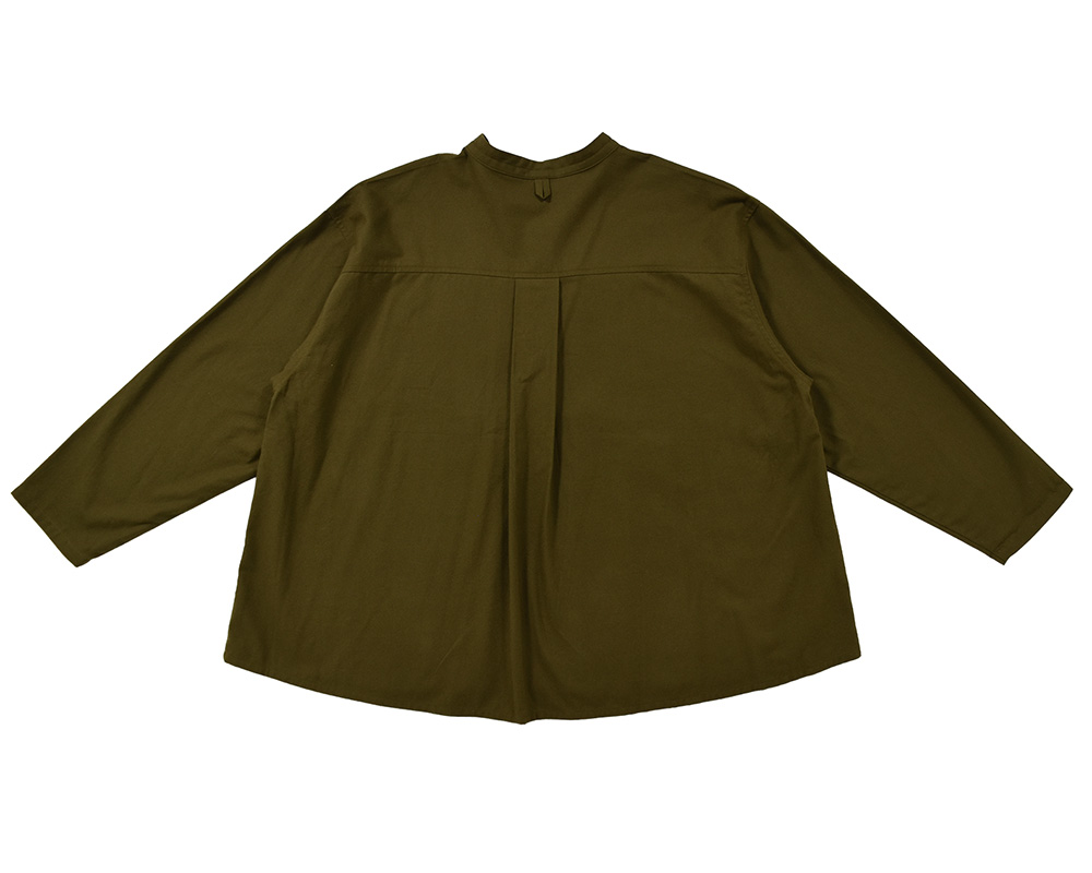 肌ざわりがよく、温かみのあるフランネル素材のプルオーバー。スタンドカラーで首元をカバーしてくれ、スタンドカラーに入れたステッチや刻印の入ったボタンでカジュアル感を出しています。オーバーサイズで少しAラインのシルエットにし、女性らしさをプラス。ボトムを選ばず合わせやすいアイテムです。