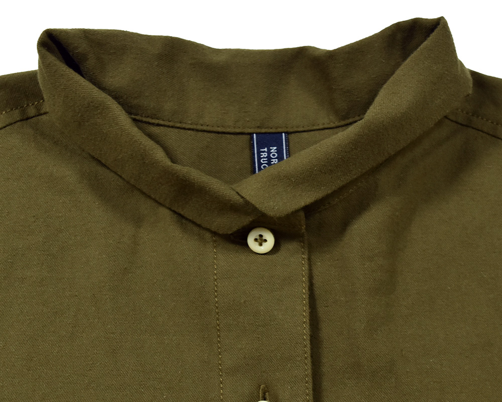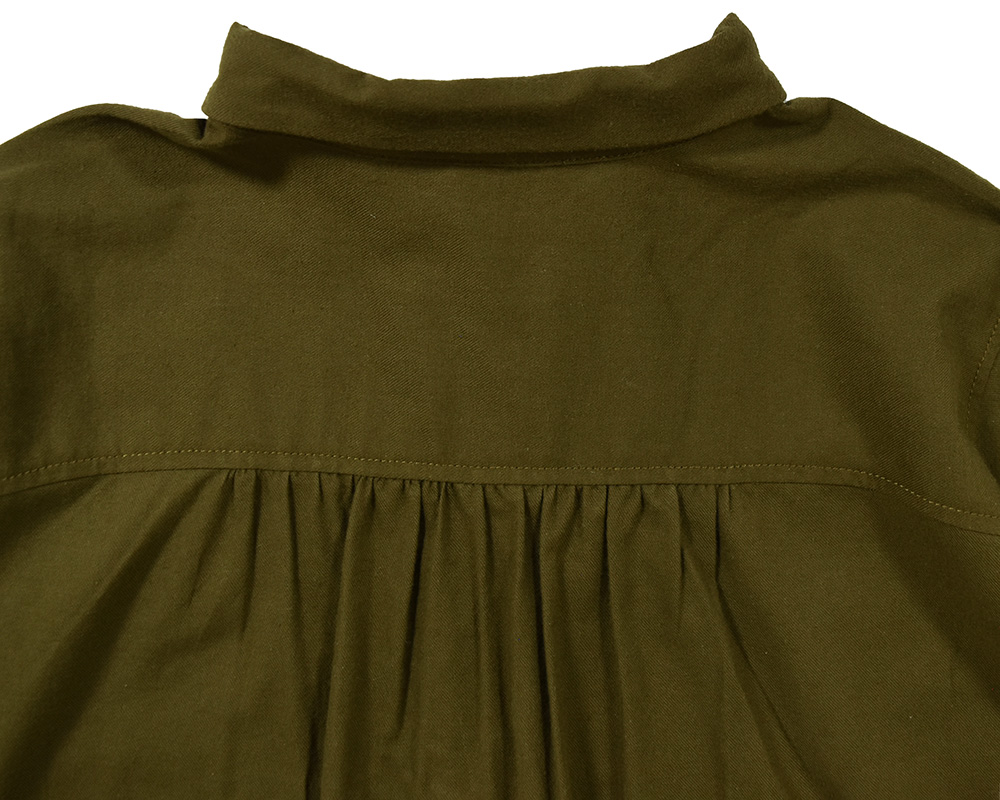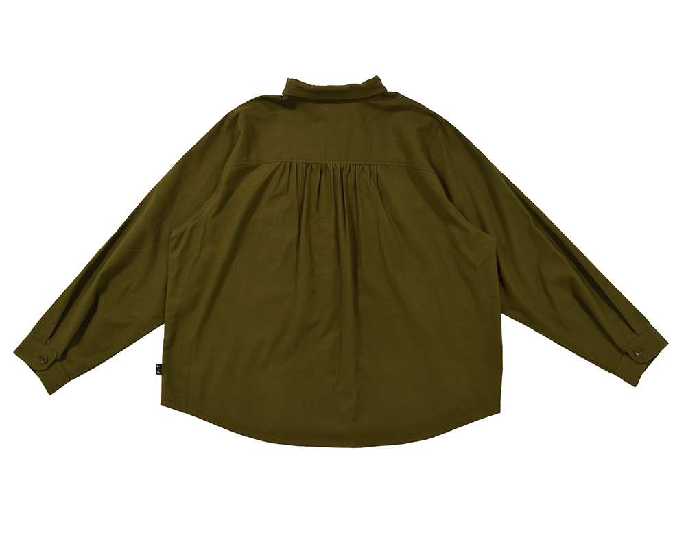 やわらかなフランネル生地を使用した、小さめの変形カラーのシャツ。優しい肌ざわりと、ふんわりとした温かさが魅力です。後ろの切替にはギャザーを入れ女性らしさをプラス。シンプルなデザインで1枚での着用はもちろん、ニットやアウターのインナーとしても活躍してくれるアイテムです。