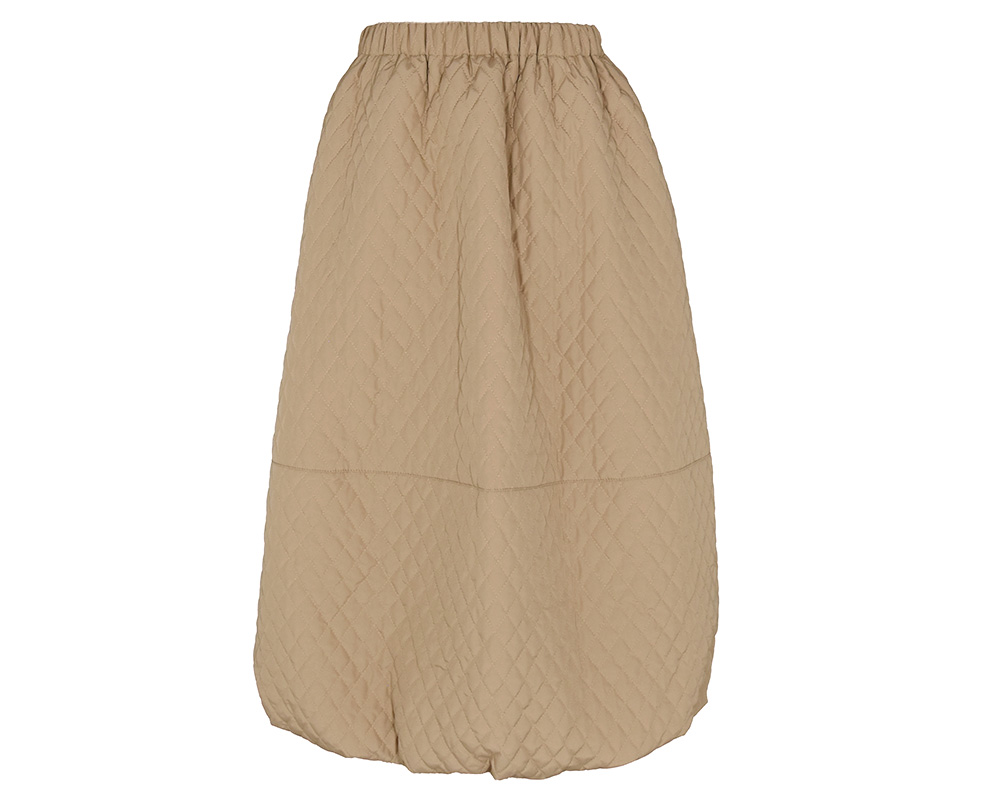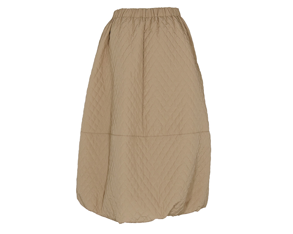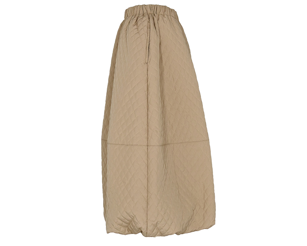 ・裾にゴムを入れたバルーンスカートです。ヒップまわりはすっきりと見せつつ、裾切り替えを入れて立体的なフォルムに仕上げました。スタイリングのアクセントになるボトムアイテムです。ウエストはゴム仕様で、楽な着心地です。両脇ポケットあり。ウエスト紐入り。