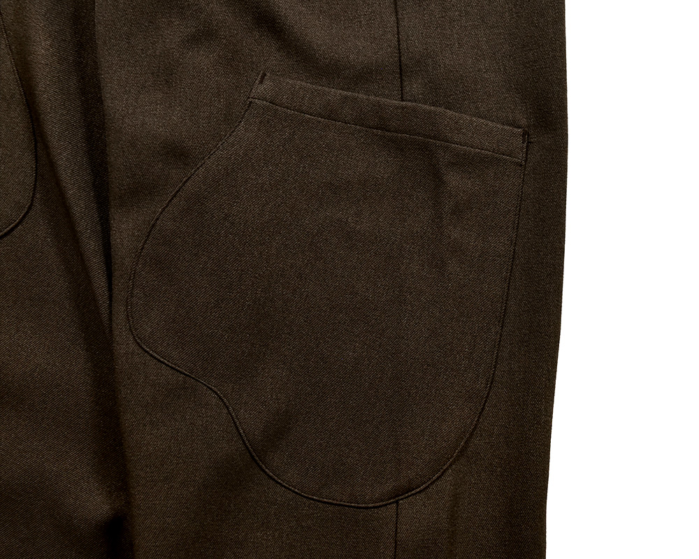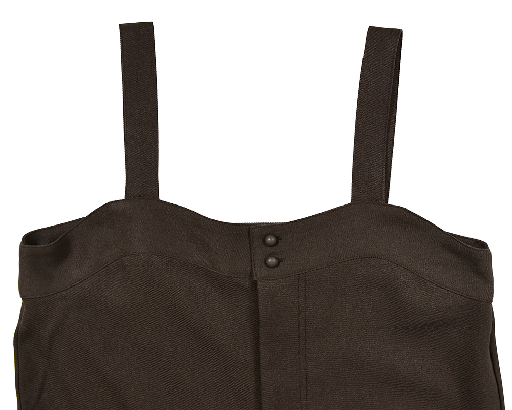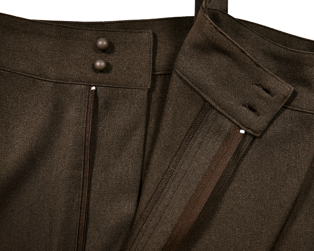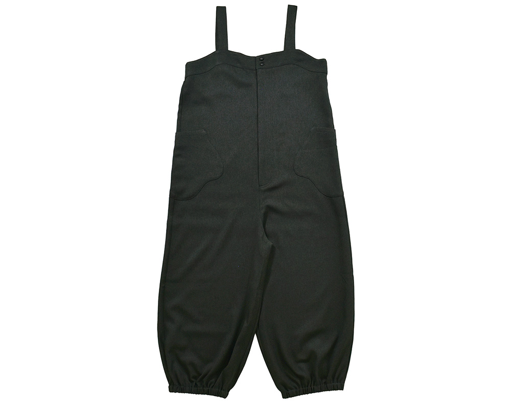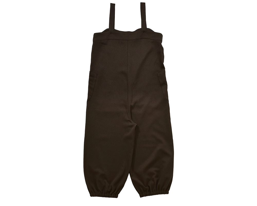 きれいめな素材感が上品な印象を与える、ゆったりシルエットのサロペットです。裾絞りのデザインと、手づくり風のミトン型ポケットが遊び心を添えます。綾織りの生地に起毛を施し、やわらかなぬくもりと上品な風合いに仕上げました。装い展の作品をイメージして、手しごとのあたたかさを感じられるミトン型ポケットを脇にあしらっています。フロントのボタンは、くるみボタンのような見た目ながら、留め外しがしやすいプラスチックボタンを使用しています。