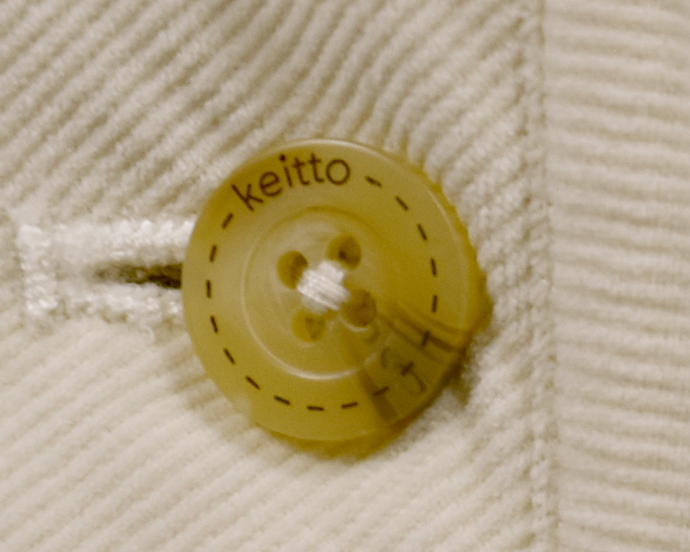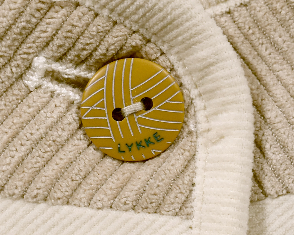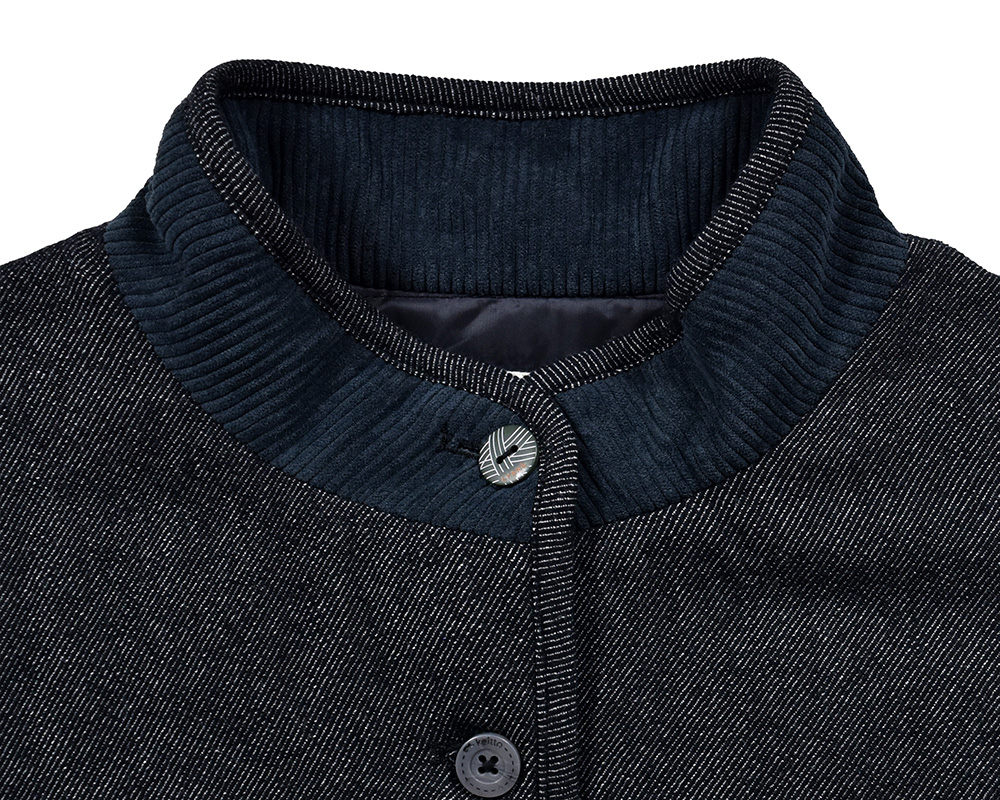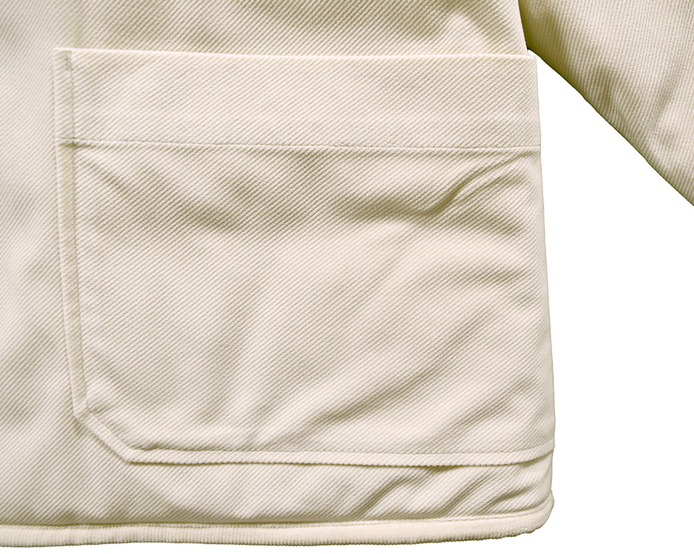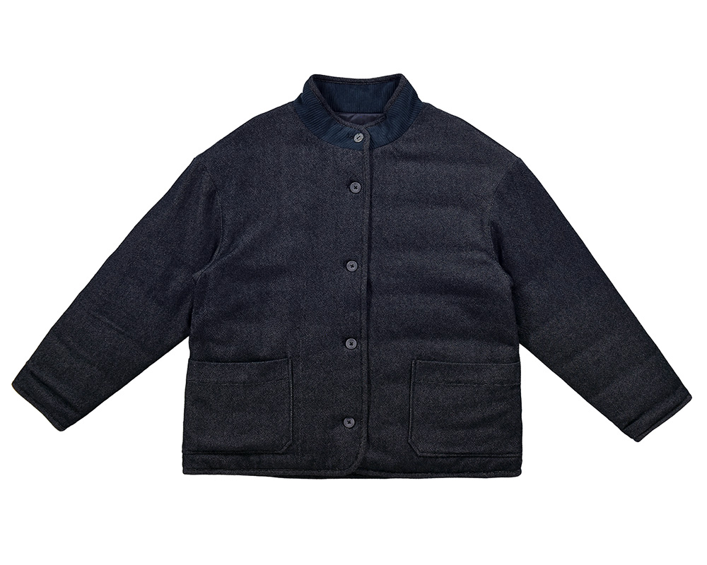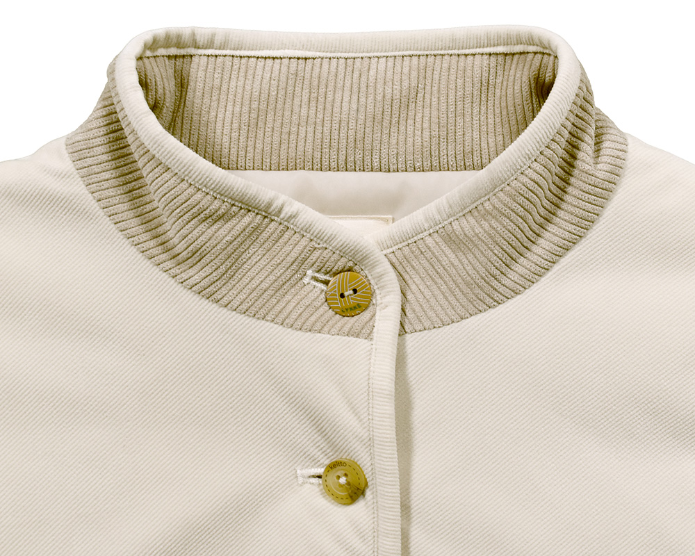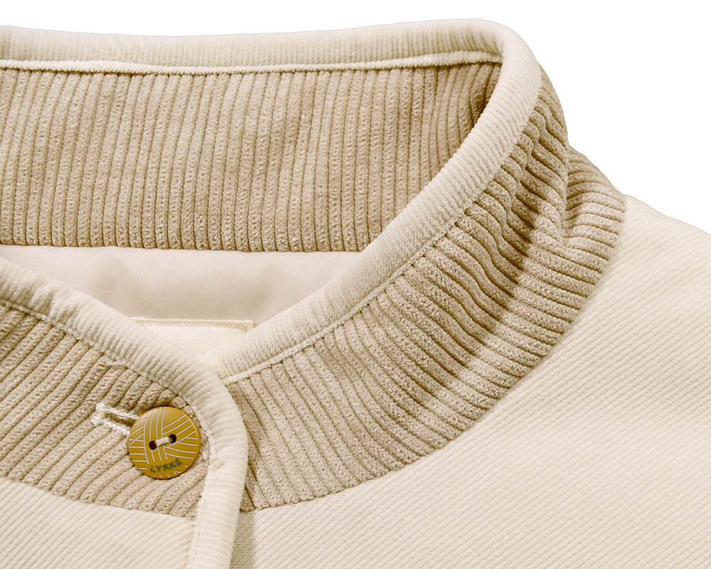 カラーごとに異なる雰囲気を楽しめる、中わた入りのジャケット。アイボリーはカットソーコーデュロイならではのやさしい肌ざわりと暖かみのある風合い。ツイル生地はデニムのような表情を持ちつつ、軽やかでさらりとした質感が特徴です。襟と見返しに微配色のコーデュロイ生地を使用し、控えめながらも目を引くディテールに。ボタンには毛糸玉とハンドステッチ調の彫り柄を入れ、クラフト感を添えました。