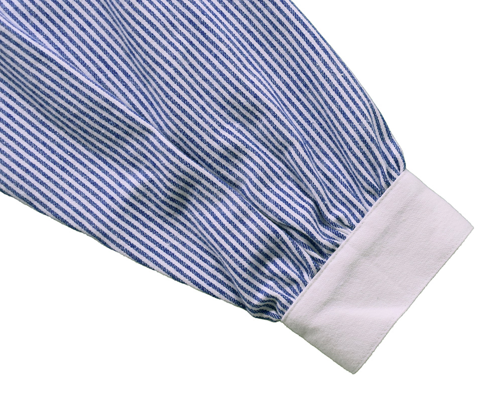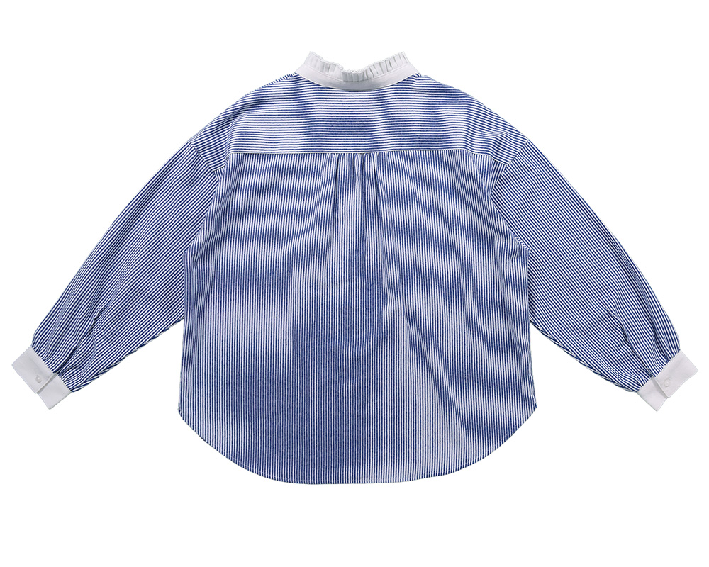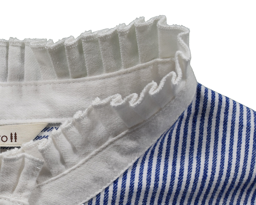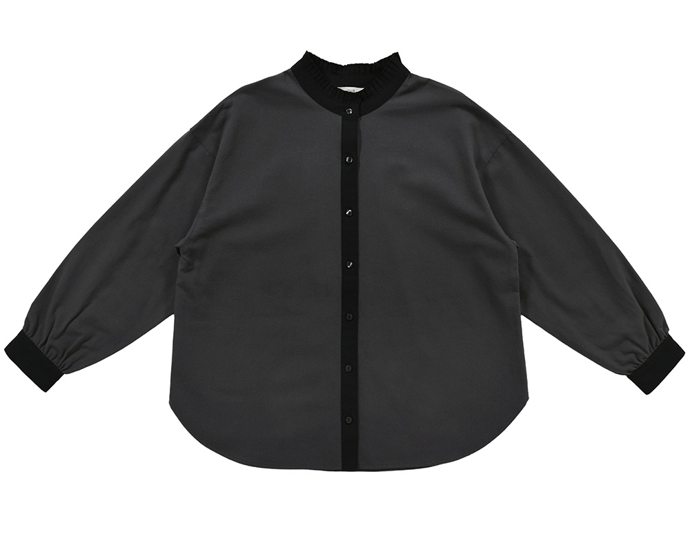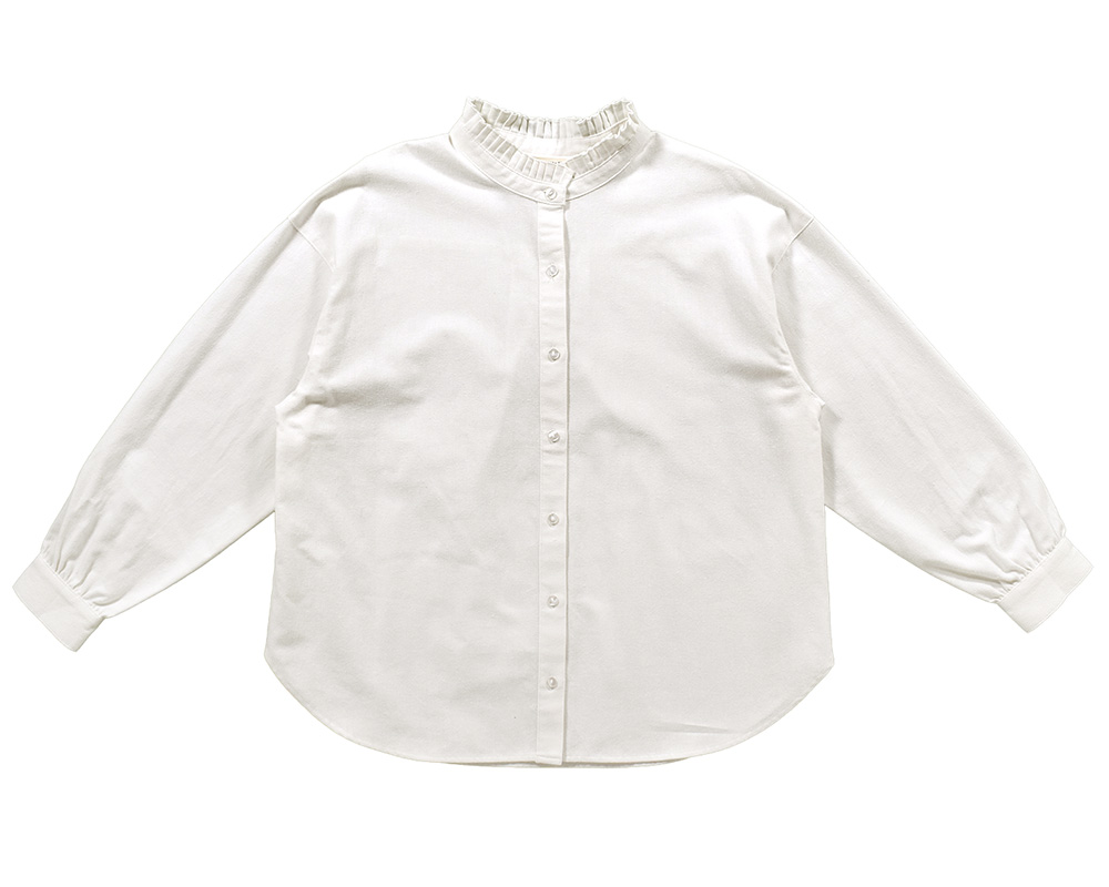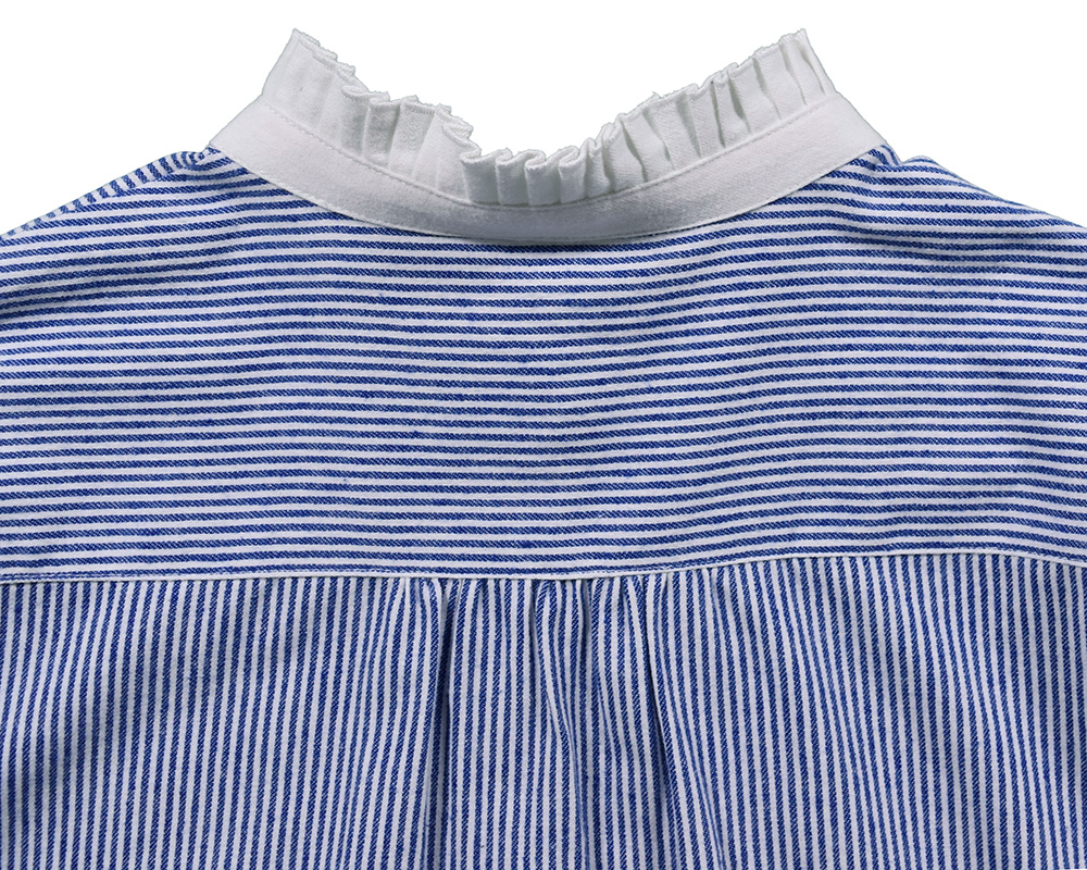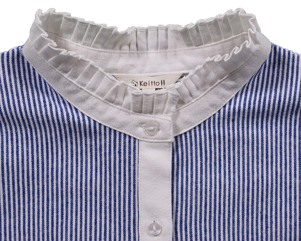 この時期のニットやカットソーとのコーディネートにぴったりな上品な仕上がりの襟フリルのシャツ。微起毛で優しい肌触りのビエラ生地を使用しています。第1ボタンとカフスには、シーンにちなんだ「ちいさなLYKKEの装い展」のロゴと、FIKAをしながらものづくりを楽しむイメージでコーヒーカップの図案を入れました。色によって配色や微配色などちょっとした違いをつけたカラーリングです。