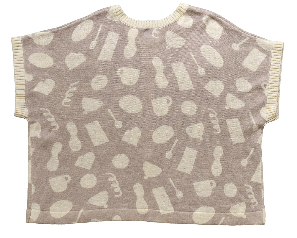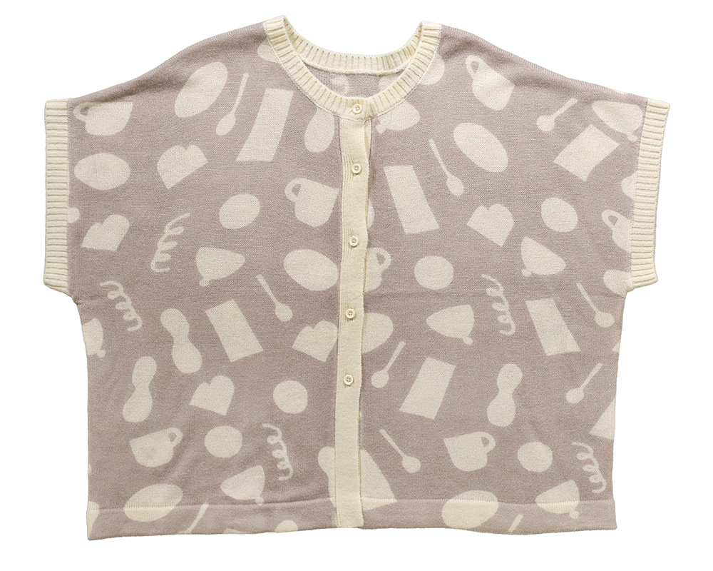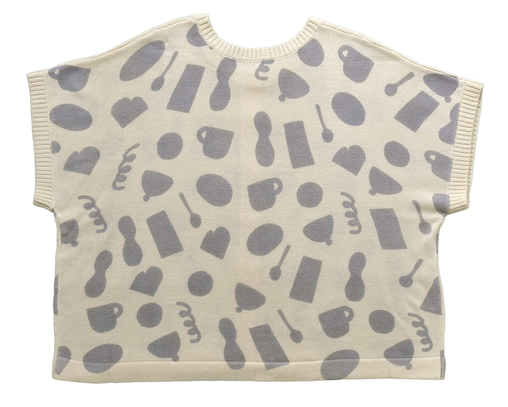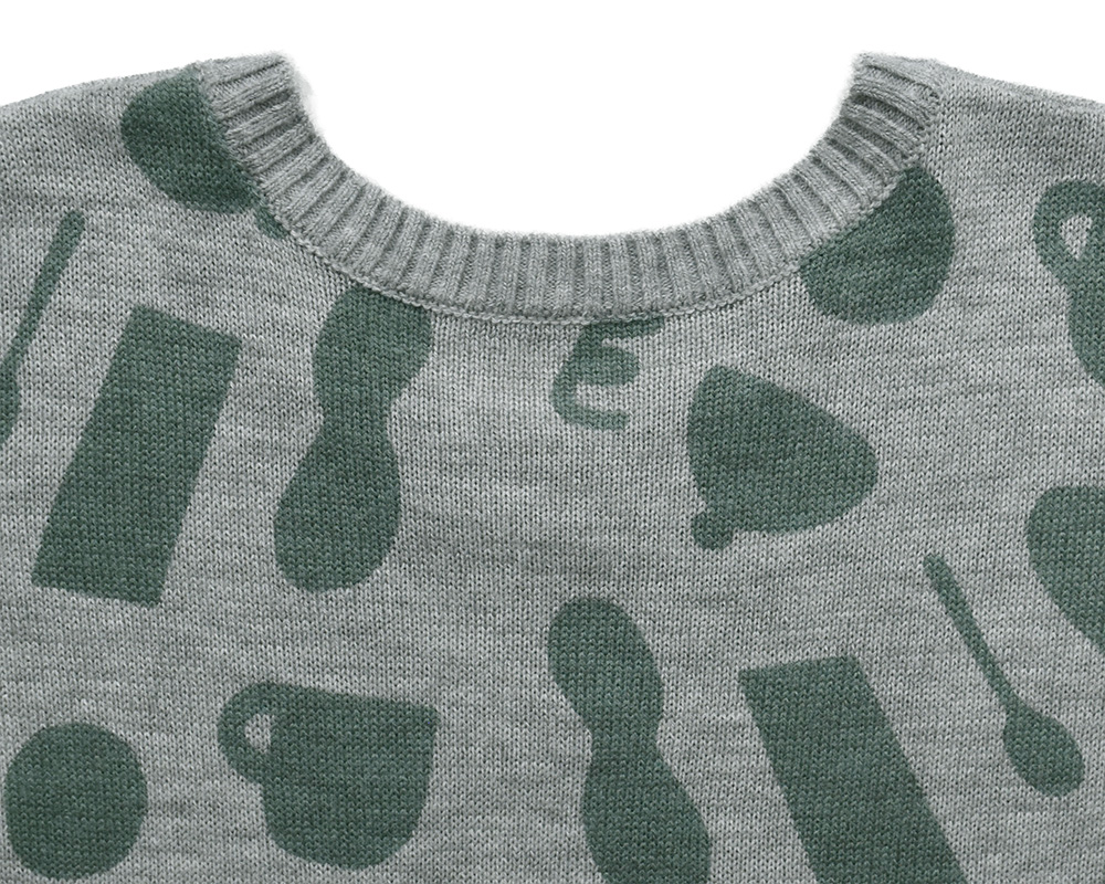 着こなしの幅が広がる前後着用可能なデザイン。ゆったりとしたワイドシルエットで、リラックス感のある着心地です。アクリルナイロンの糸を使用し、ふんわりとした柔らかい風合いに仕上げました。LYKKE(リュッケ)なひとときを思わせる、毛糸やミトン、ニット帽、マグカップ、スプーンなどのモチーフを散りばめた温もりのあるプリント柄です。
