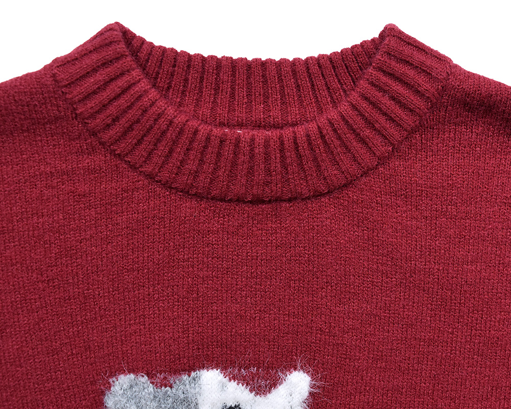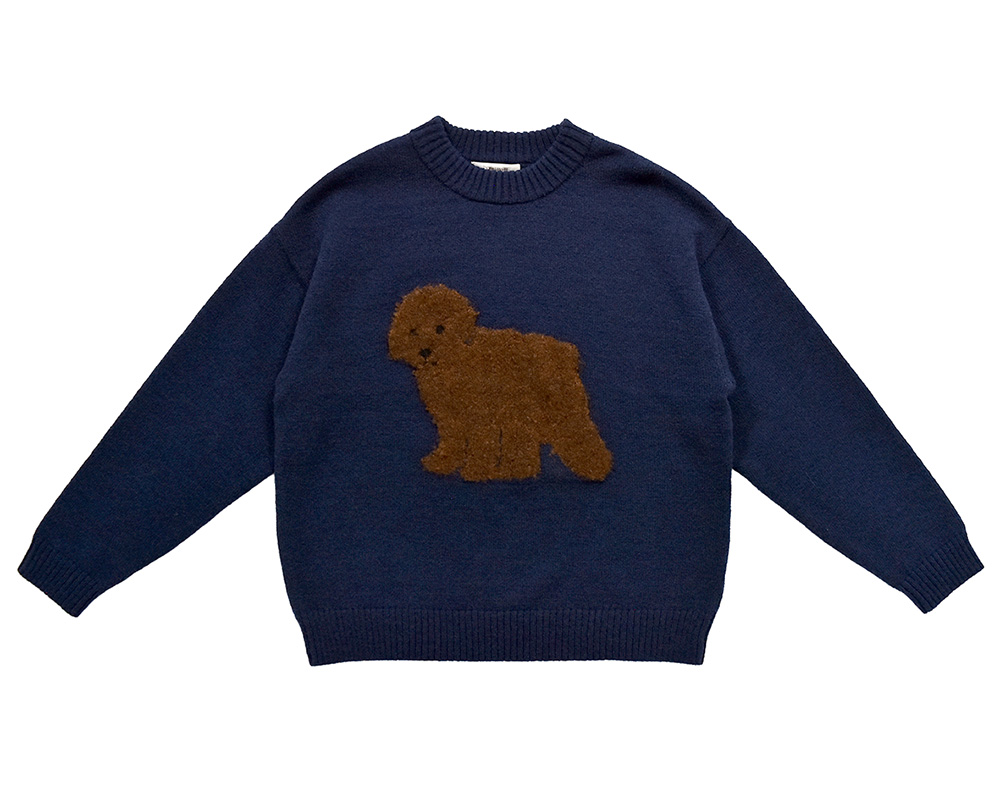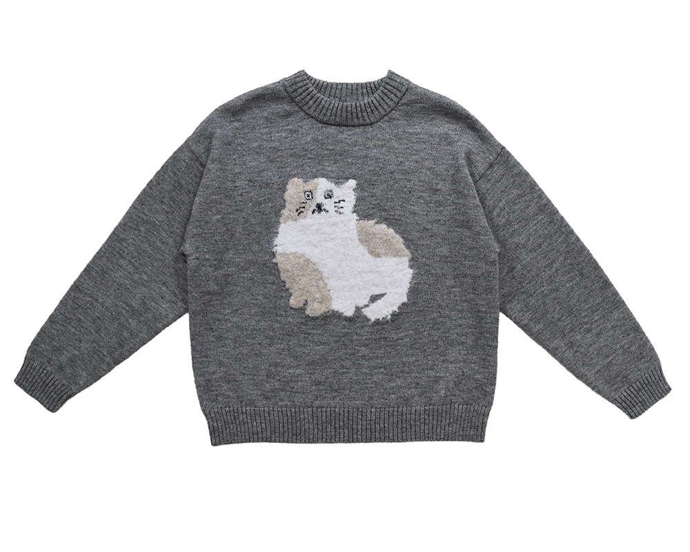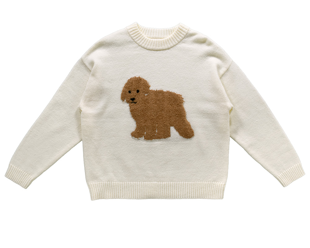 アニマル柄が目を引くニットプルオーバーは、コーデの主役になるアイテム。着るだけで楽しくなる1枚です。もっちりした肉感の糸を使用しています。犬柄はトイプードル、猫柄は毛足の長いセルカークレックスをイメージしました。毛の色によって糸の種類を変えてモフモフ感を表現しています。※ピリングが起きにくいよう抗ピル加工を施してあります。