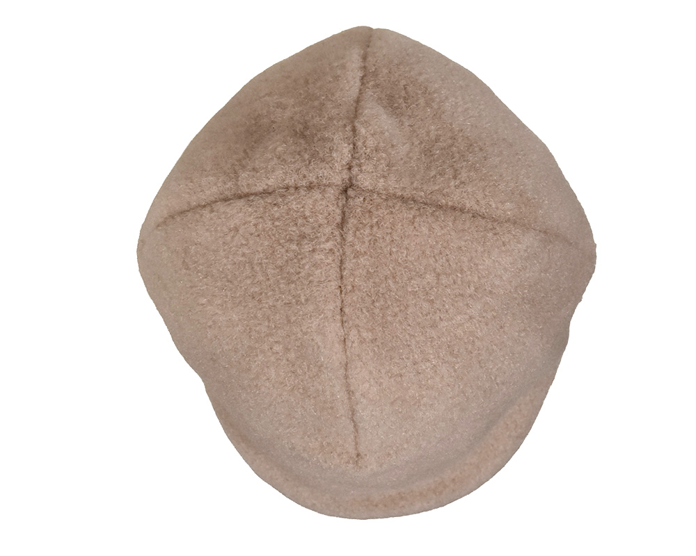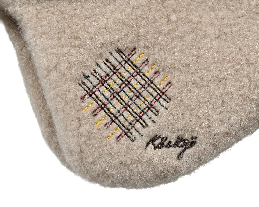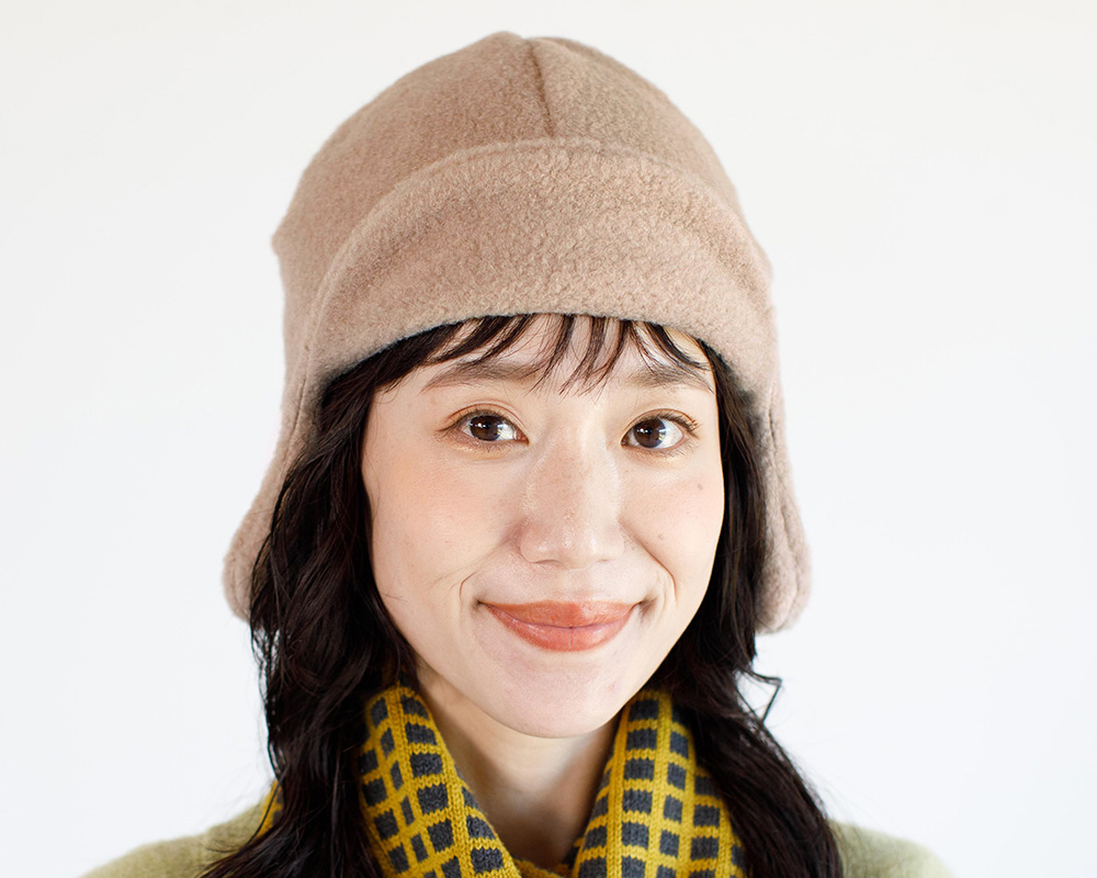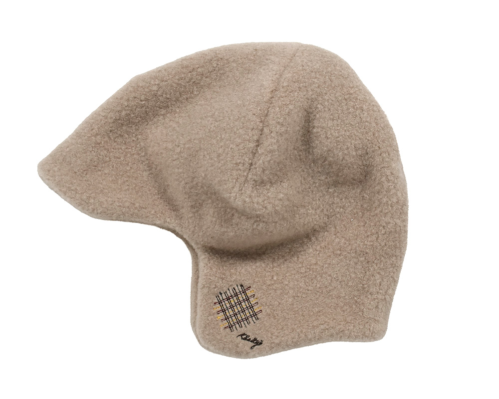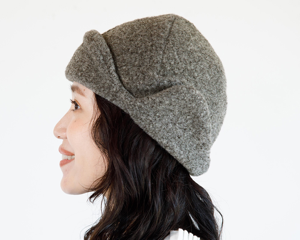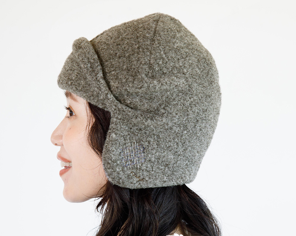 上から見るとつぼみのような形のキャップ。かぶり口を折り返しても伸ばしても着用していただけます。あたたかくて軽いメルトン生地を使用。ダーニング風の刺繍がポイント。フィンランド語で「手しごと」という意味のロゴ刺?を添えました。