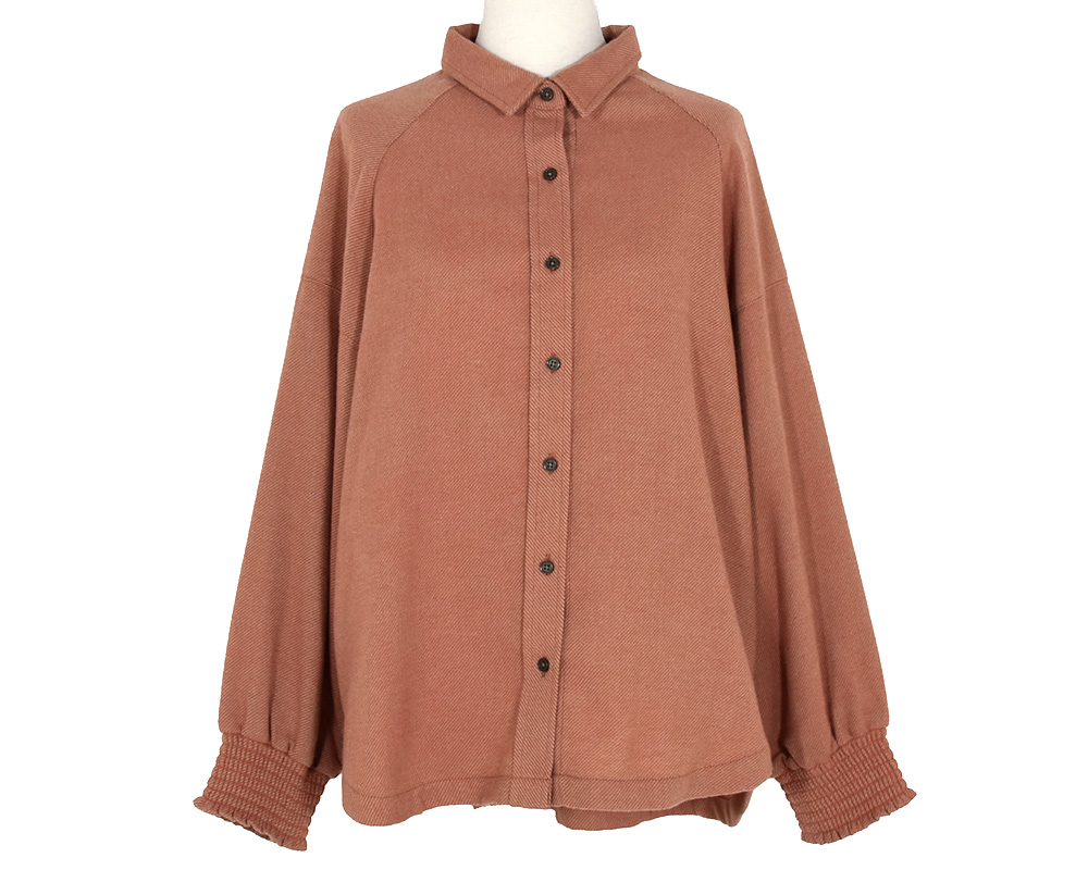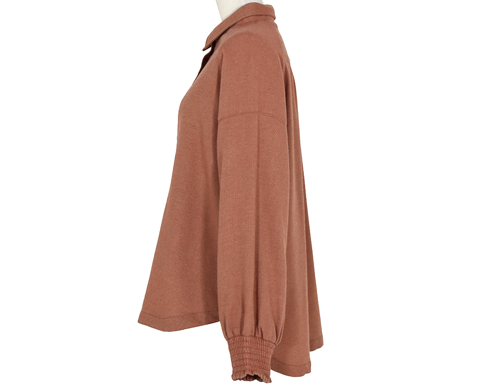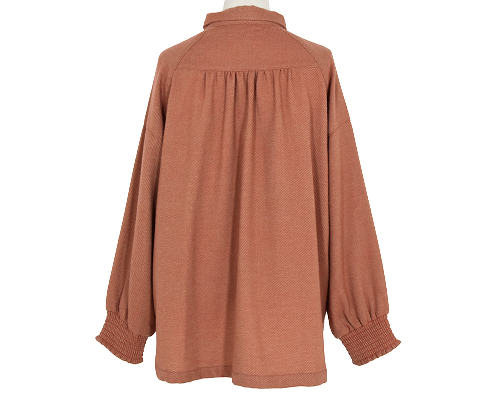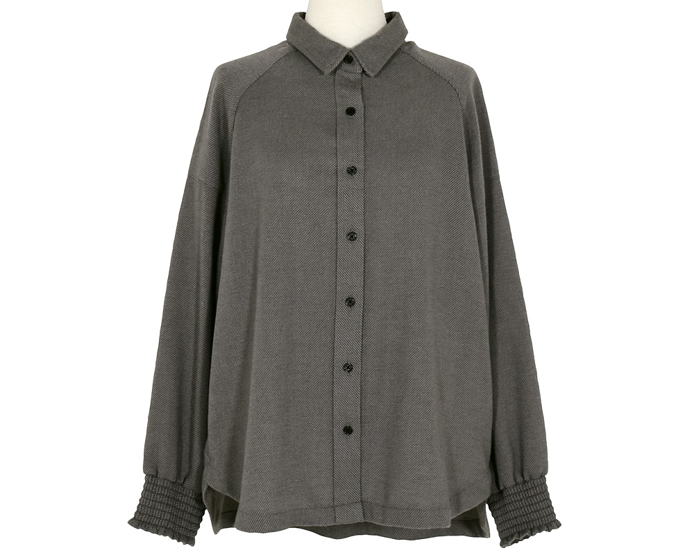 ・小さめの襟とやや広めの身幅で、着用時に程よい抜け感のある雰囲気のシャツです。ニットやジャケットのインナーとしても重宝し、スタイリングにさりげない女性らしさをプラスします。袖口はゴム仕様で、袖丈のアレンジもしやすいデザインです。