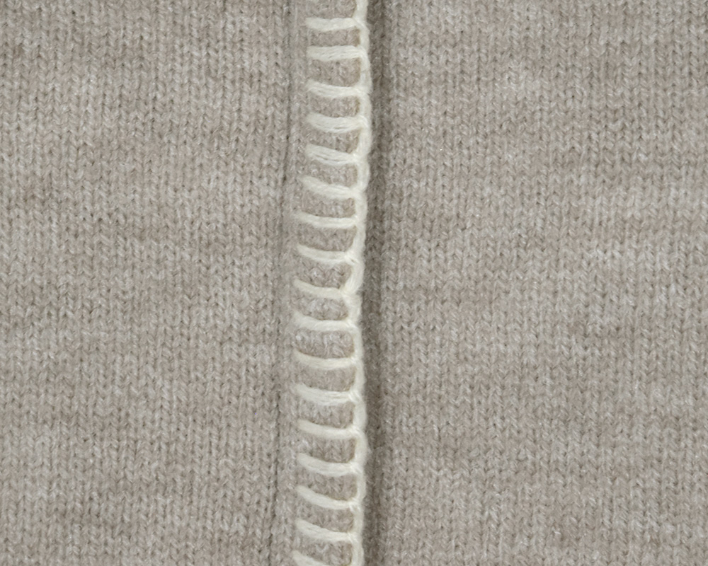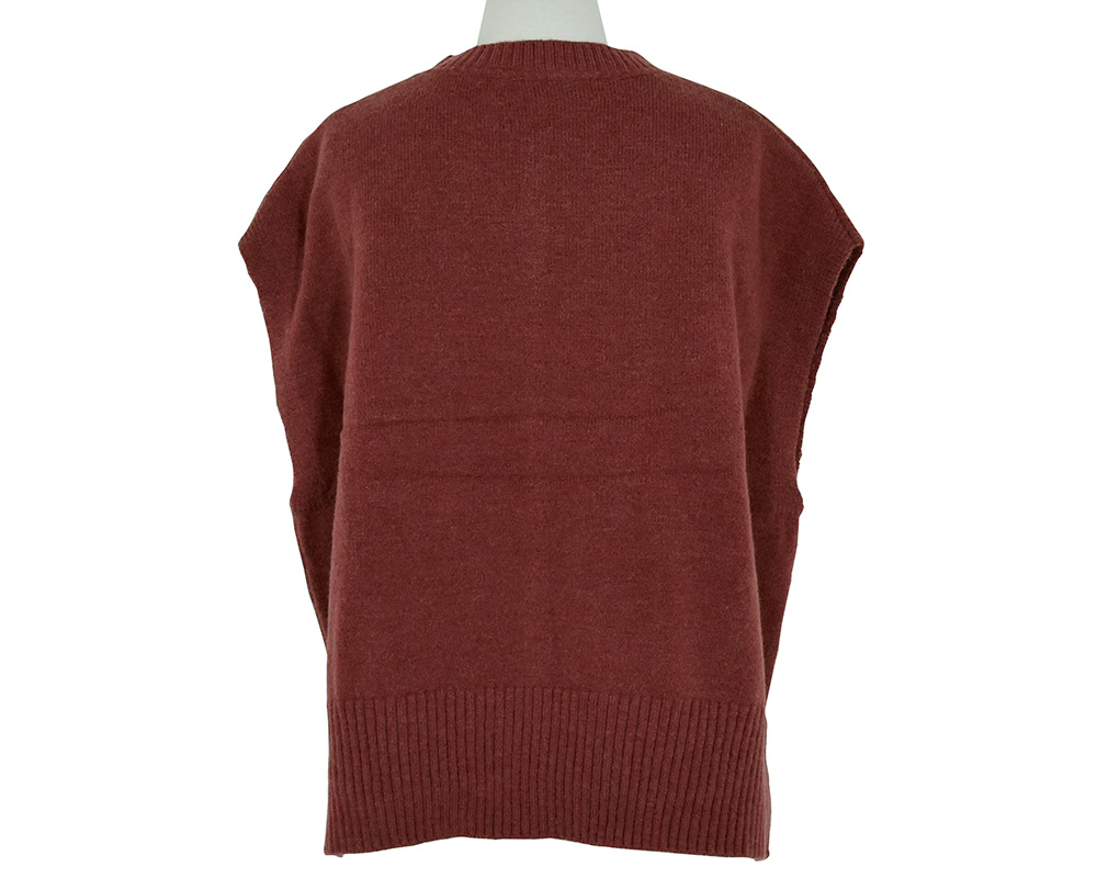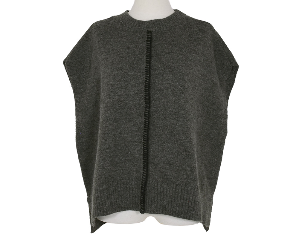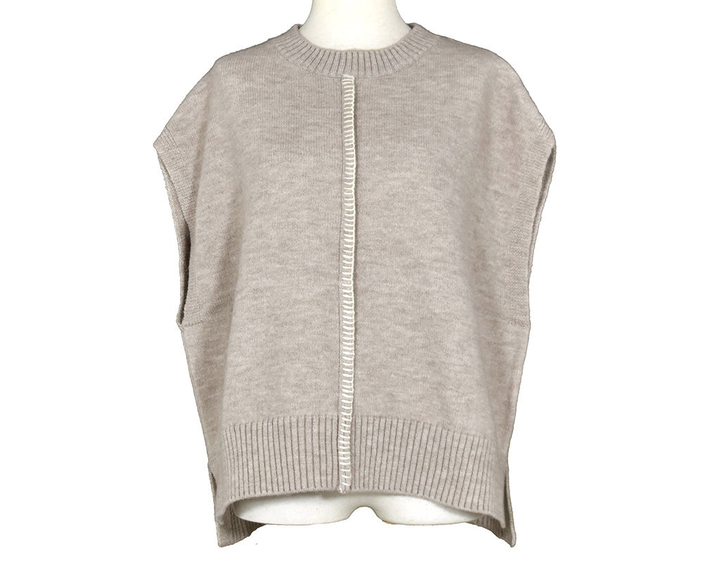 ・シンプルな天竺編みのボディにゆったりサイズのニットベストです。センターフロントには、ハンドステッチのようなあしらいを施し、シンプルながらもさりげないアクセントをプラスしています。シャツやカットソーとのレイヤードに重宝する一枚です。