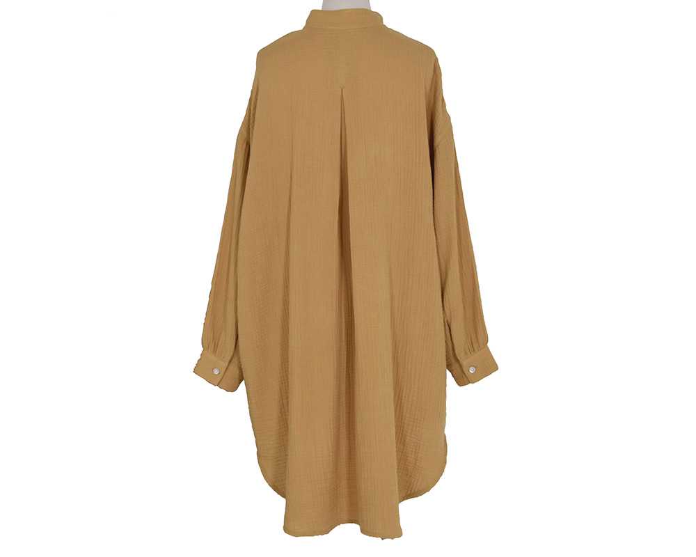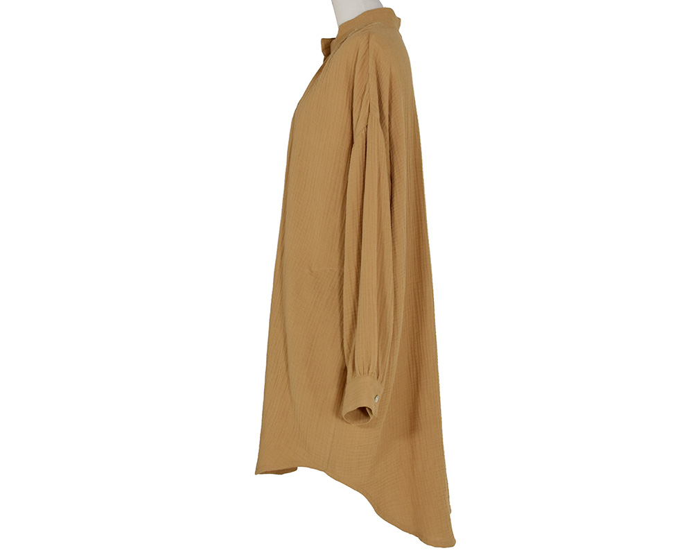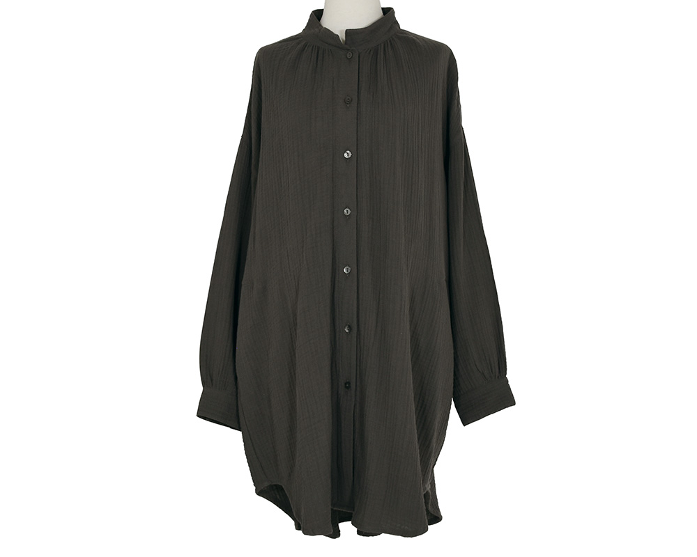 ・ややAラインに広がるシルエットのロングシャツです。衿元と袖口のギャザーと大きくカーブしたヘムラインの曲線が女性らしさのあるデザインです。春先は軽いアウターとしても着用でき、長く活躍する1枚です。両脇シームポケットあり。