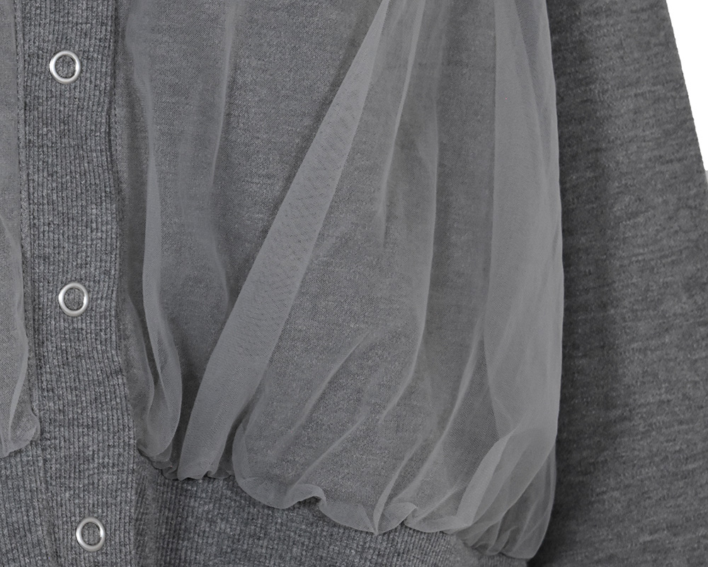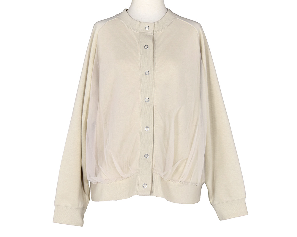 ・裏起毛カットソーの身頃にチュールを重ねたカーディガンです。同色系のチュールなので馴染みがよく、トレンド感がありつつ着こなしにニュアンスを加えてくれるアイテムです。両脇シームポケットあり。
