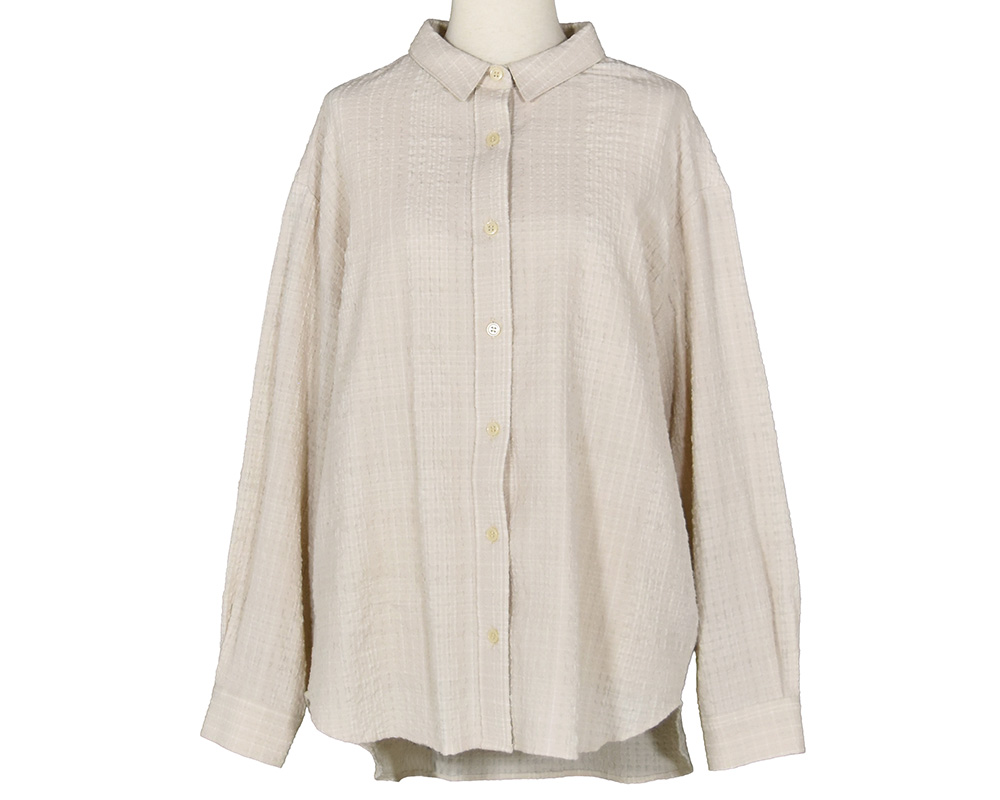 ・コットン素材にストレッチ糸を織り込むことで凹凸のある風合いに仕上げています。アイロンいらずの扱いやすい素材です。