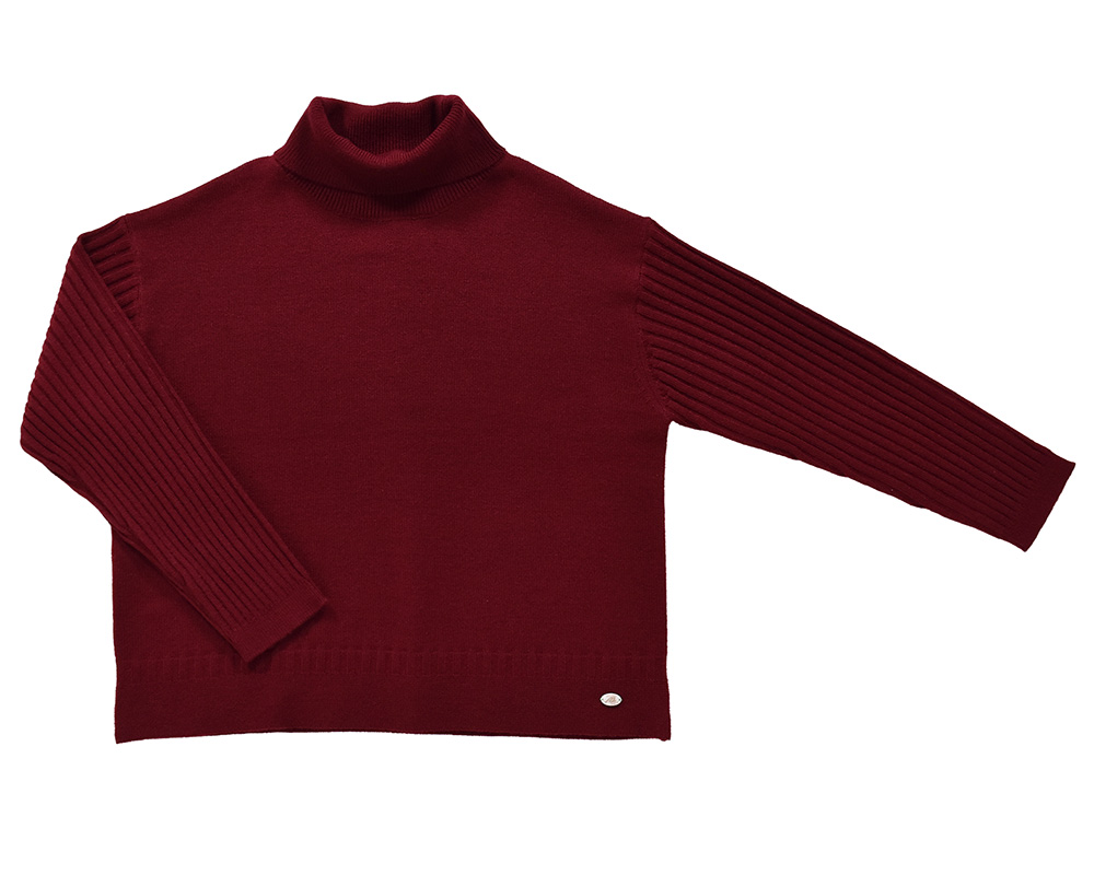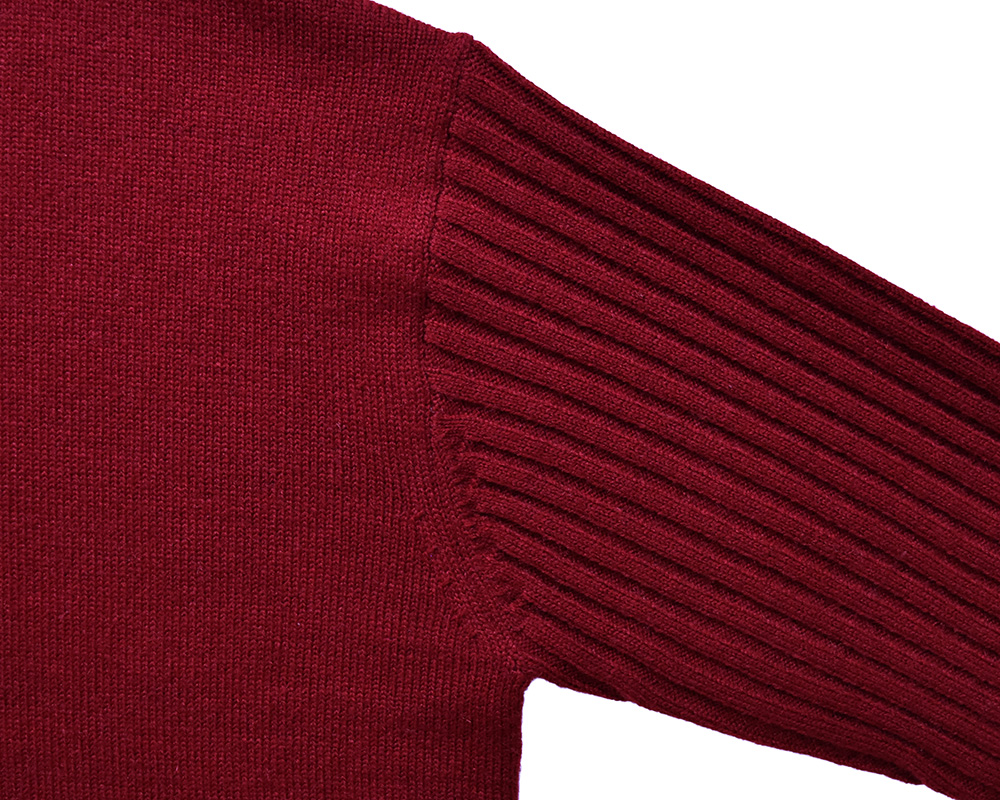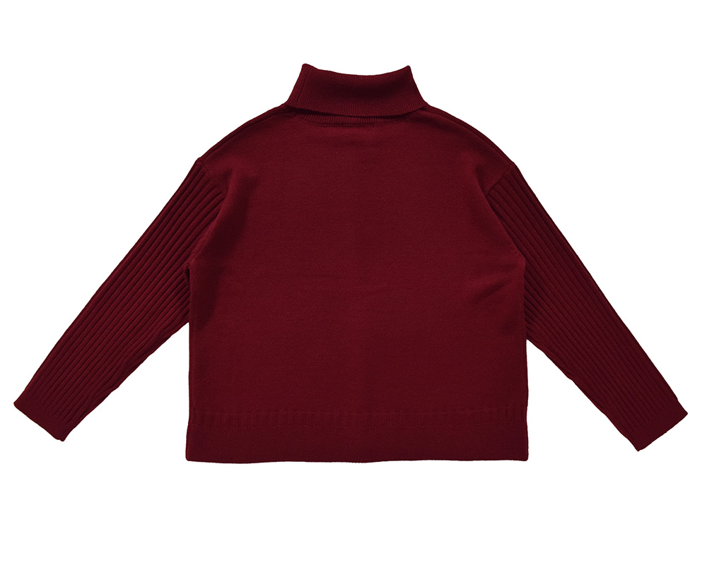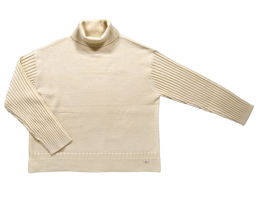 首元をしっかり包み込むタートルネックプルオーバー。袖は太めのリブ編みで切り替え、シンプルな中にも表情をプラスしました。裾にはガンジーニットを思わせる編地を取り入れ、手仕事感のある表情でアクセントに。左裾のプレートもさりげないポイントとなり、着こなしを引き締めてくれます。