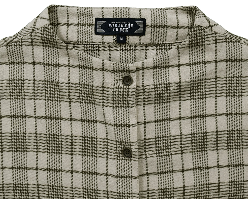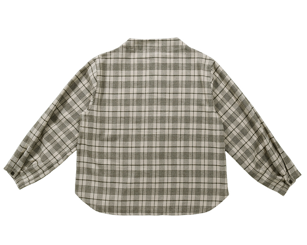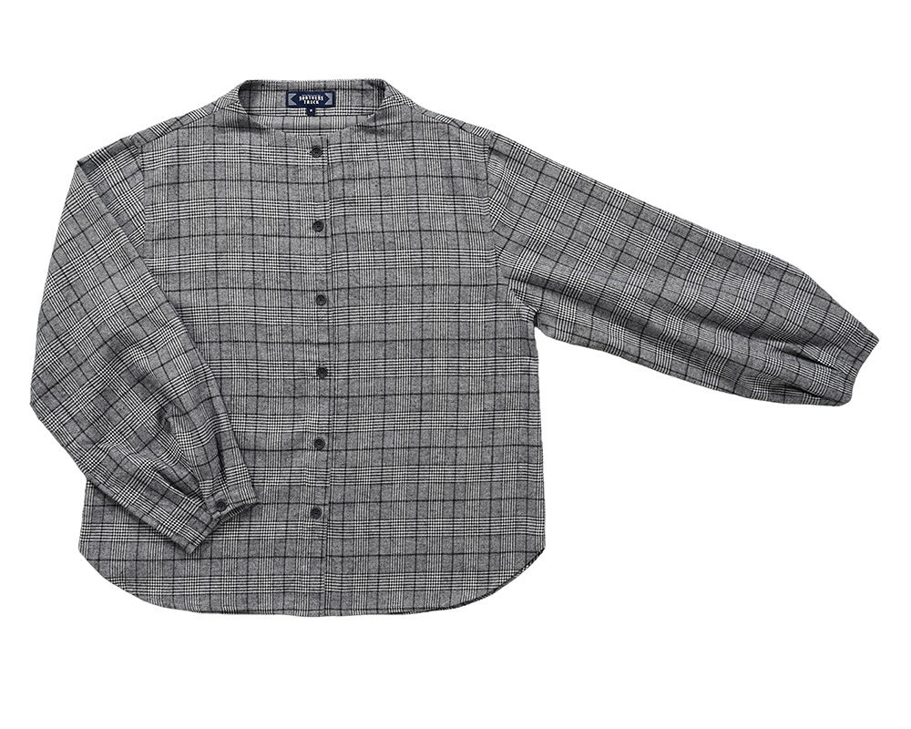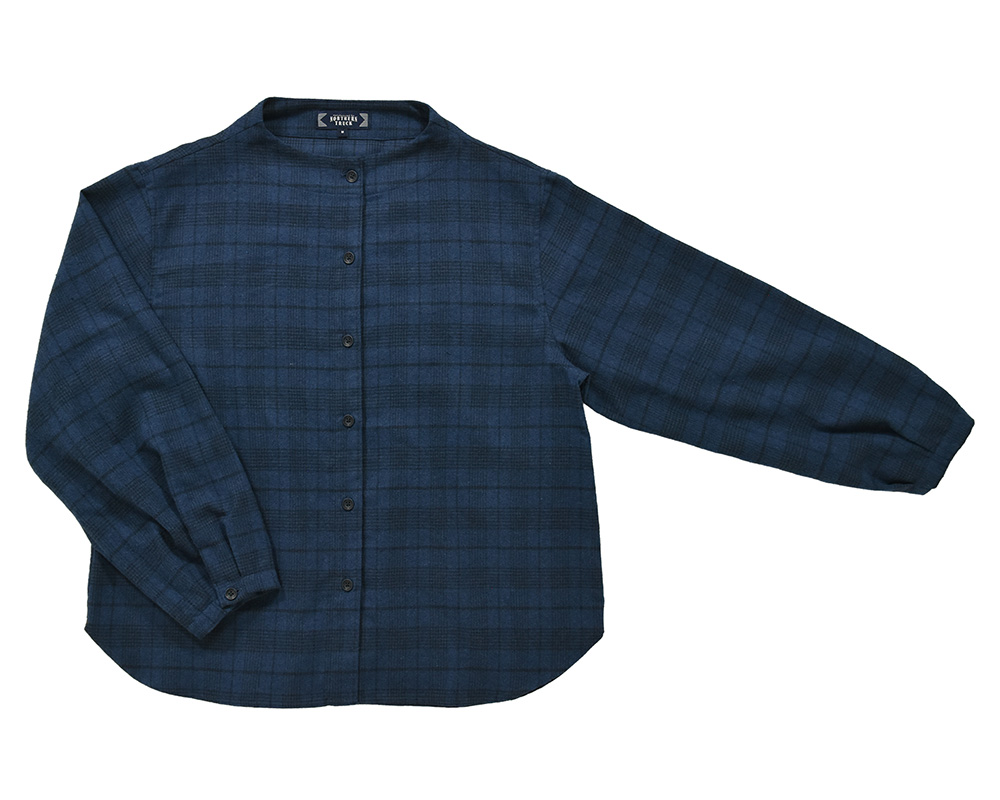 起毛素材を使用したあたたかみのあるシャツ。モックネックのデザインは首元をカバーしてくれスッキリとみせてくれます。裾のカーブや袖口にタックを入れふんわりとさせたデザインはシャツとしてはもちろん羽織りとしても活躍してくれるアイテムです。刻印入りのボタンや配色のカン止めでアクセントをプラスしました。NKBV5706スカートと共通の素材を使用しています。