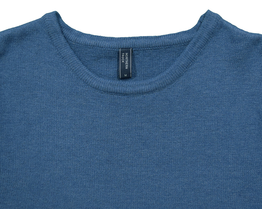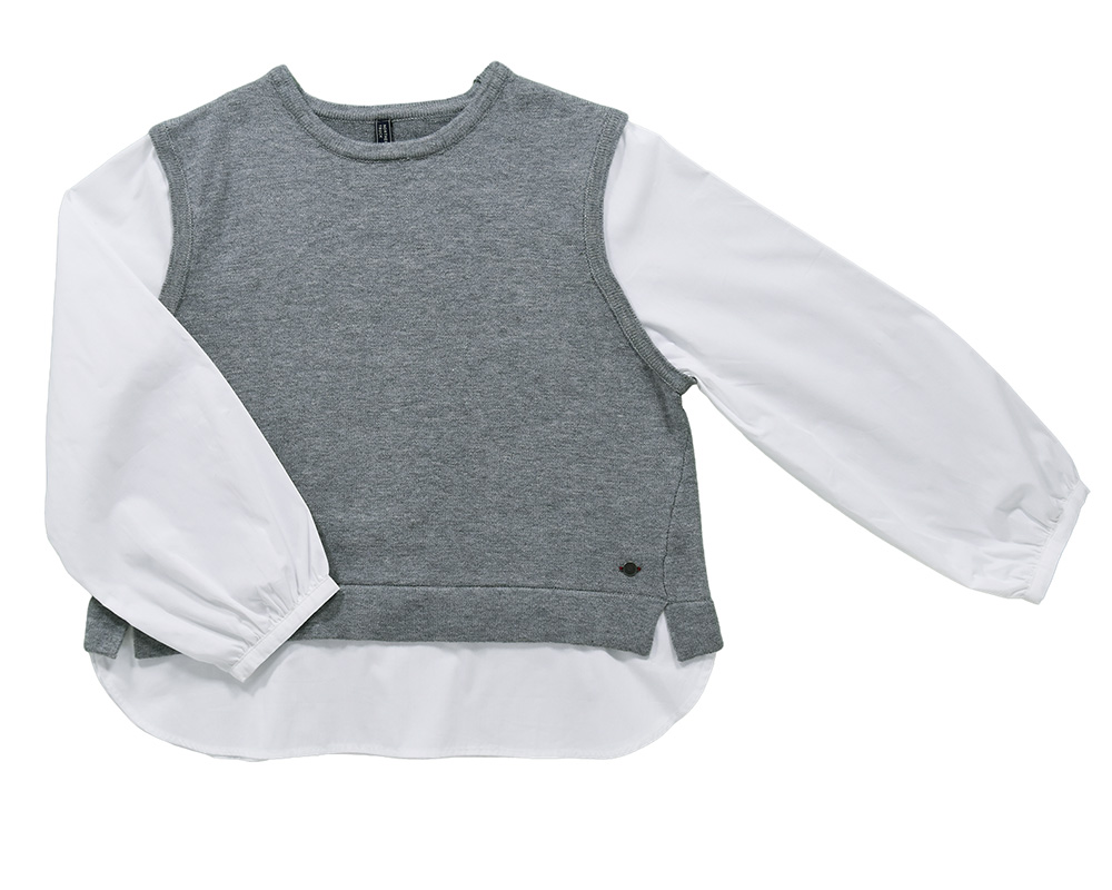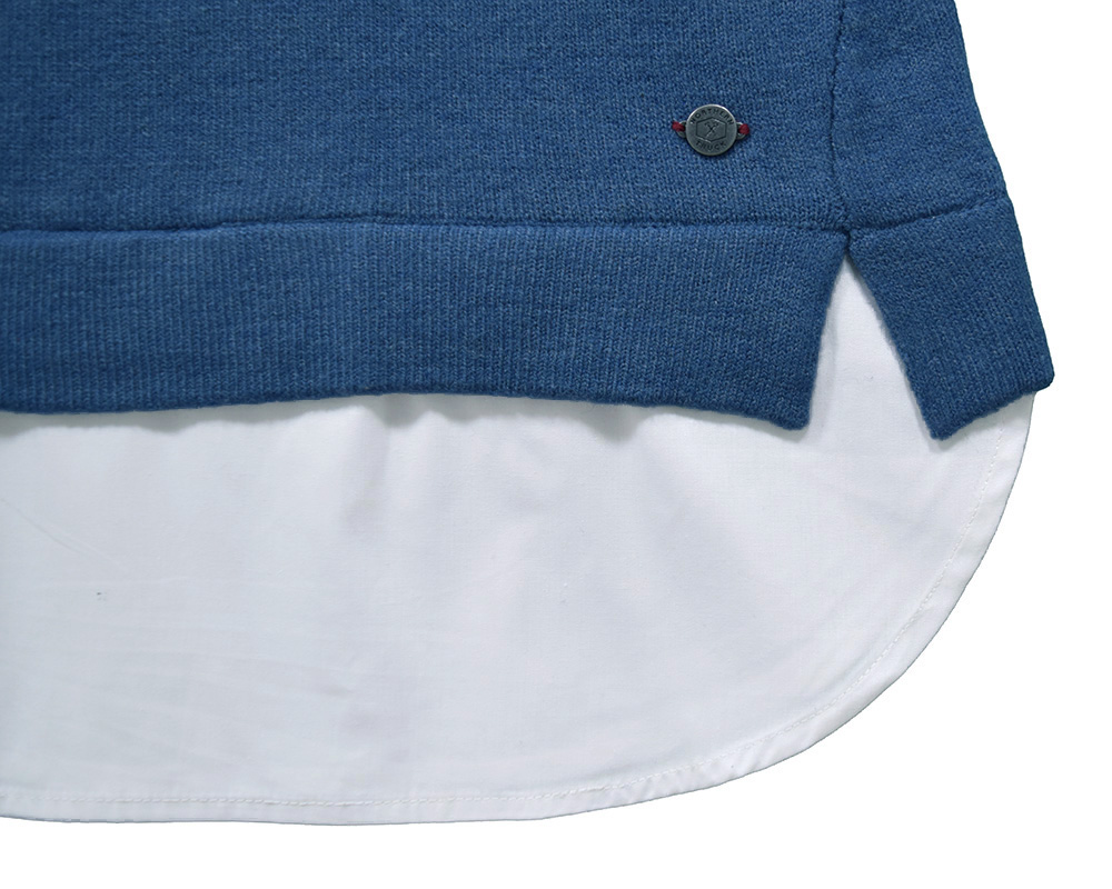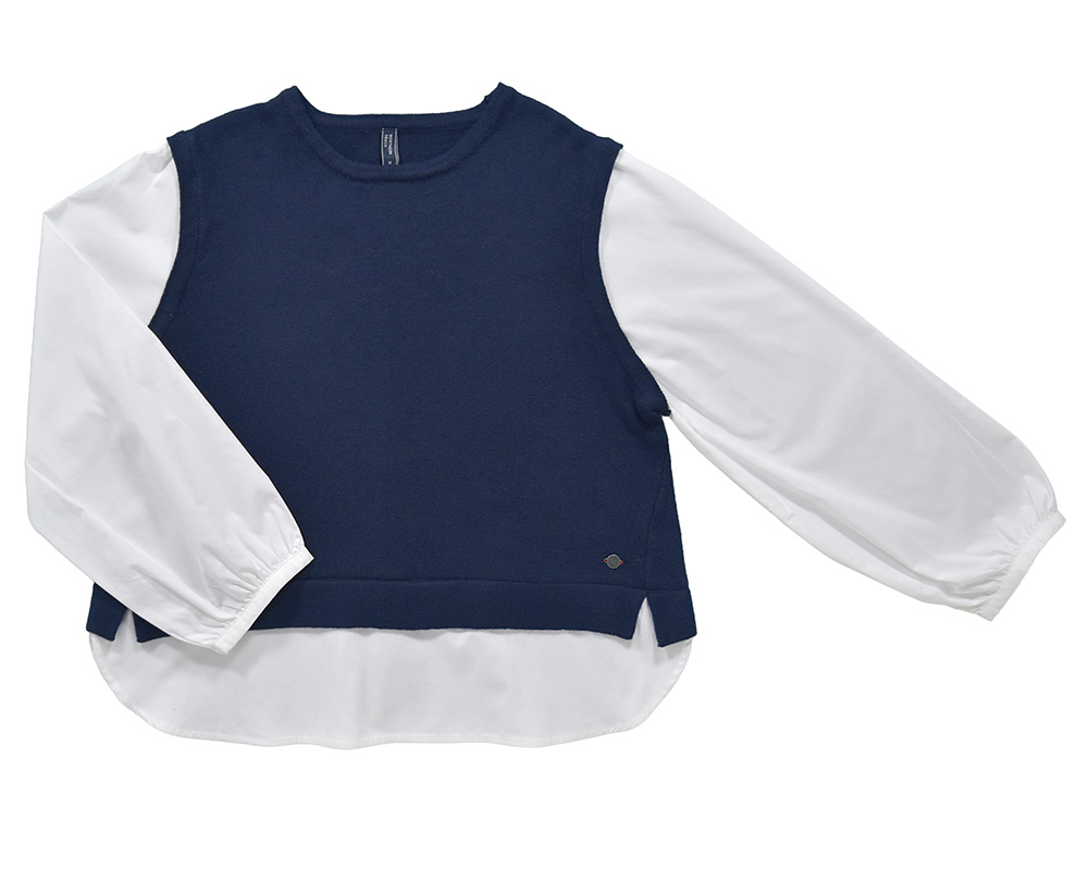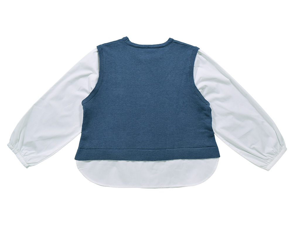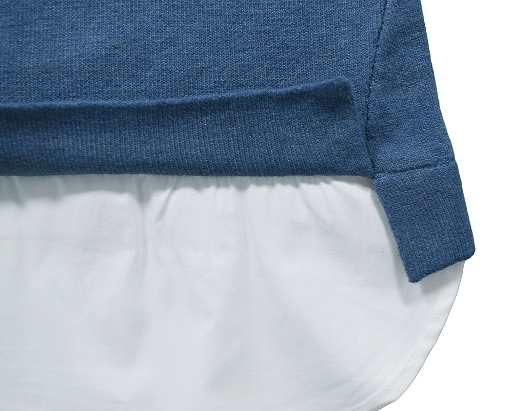 袖と裾に布帛生地を使用し、身頃はあたたかいニット素材のプルオーバー。袖口にギャザーを入れ女性らしく、裾はラウンドさせシャツとのレイヤード風に仕上げました。裾にスリットやプレートをつけポイントをプラス。この1枚で完結するコーディネート要らずの便利なアイテムです。