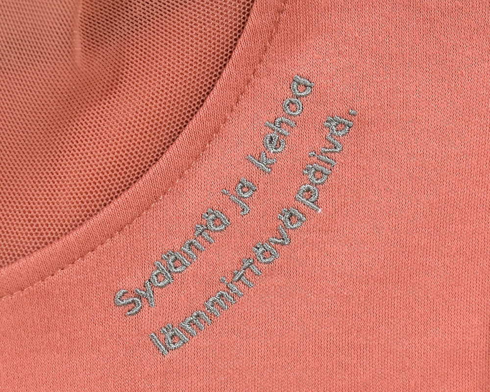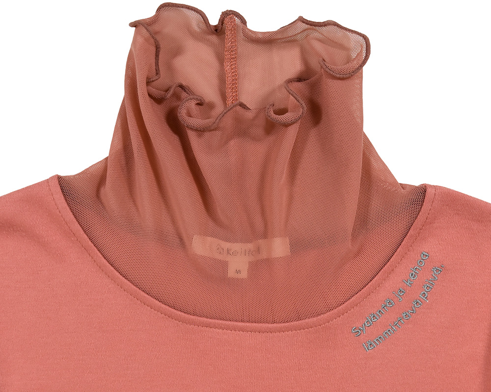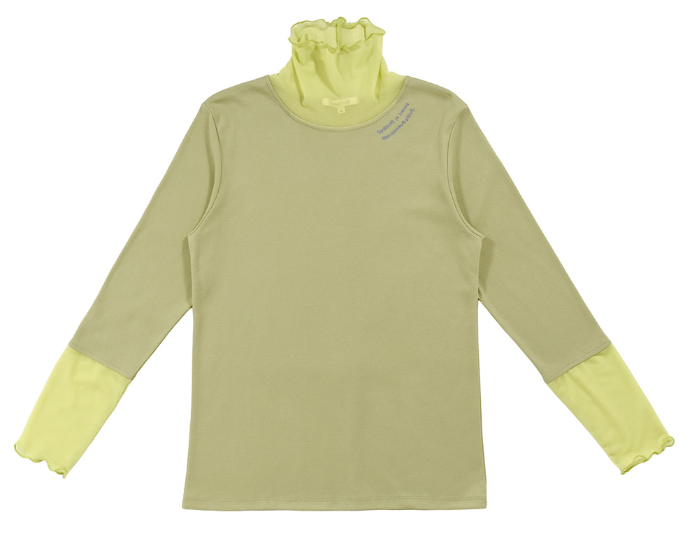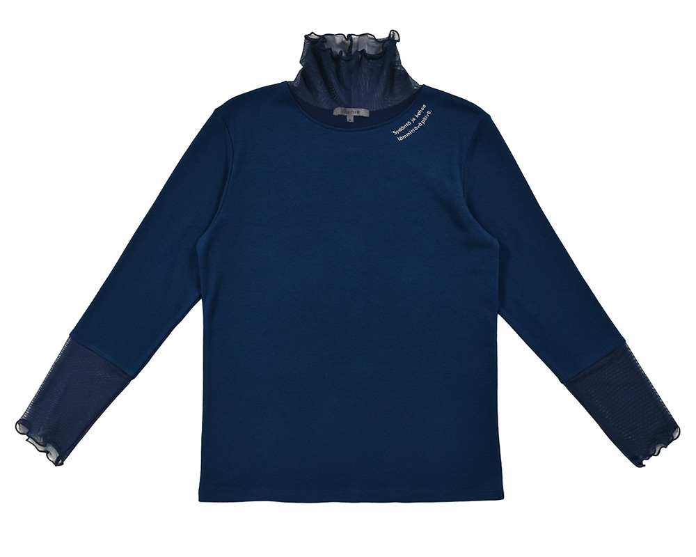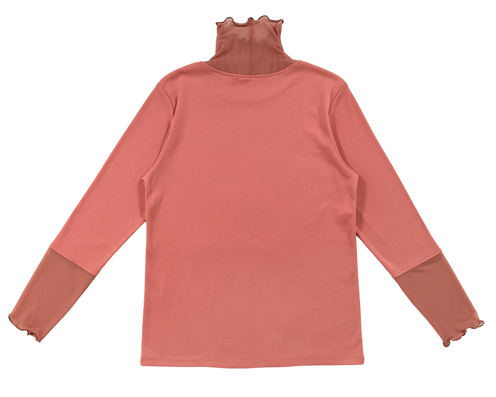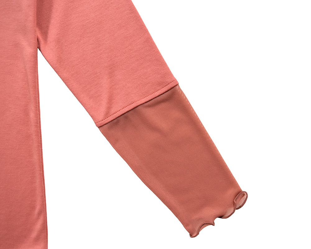 昨年も人気だった素材切り替えインナー。レイヤードコーデのアクセントになる、襟口と袖口のシアー感がポイントです。身頃と袖は肌あたりの良いコーマスムース、襟口と袖口は伸縮性のあるパワーネットを使用。襟ぐりのロゴ刺繍は「心も体も温まる一日」を意味するフィンランド語を入れ、あたたかなおうち時間をイメージしました。