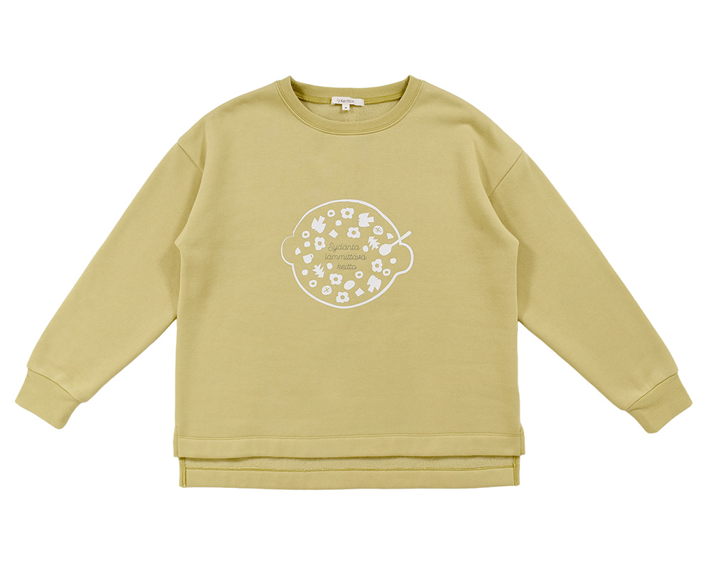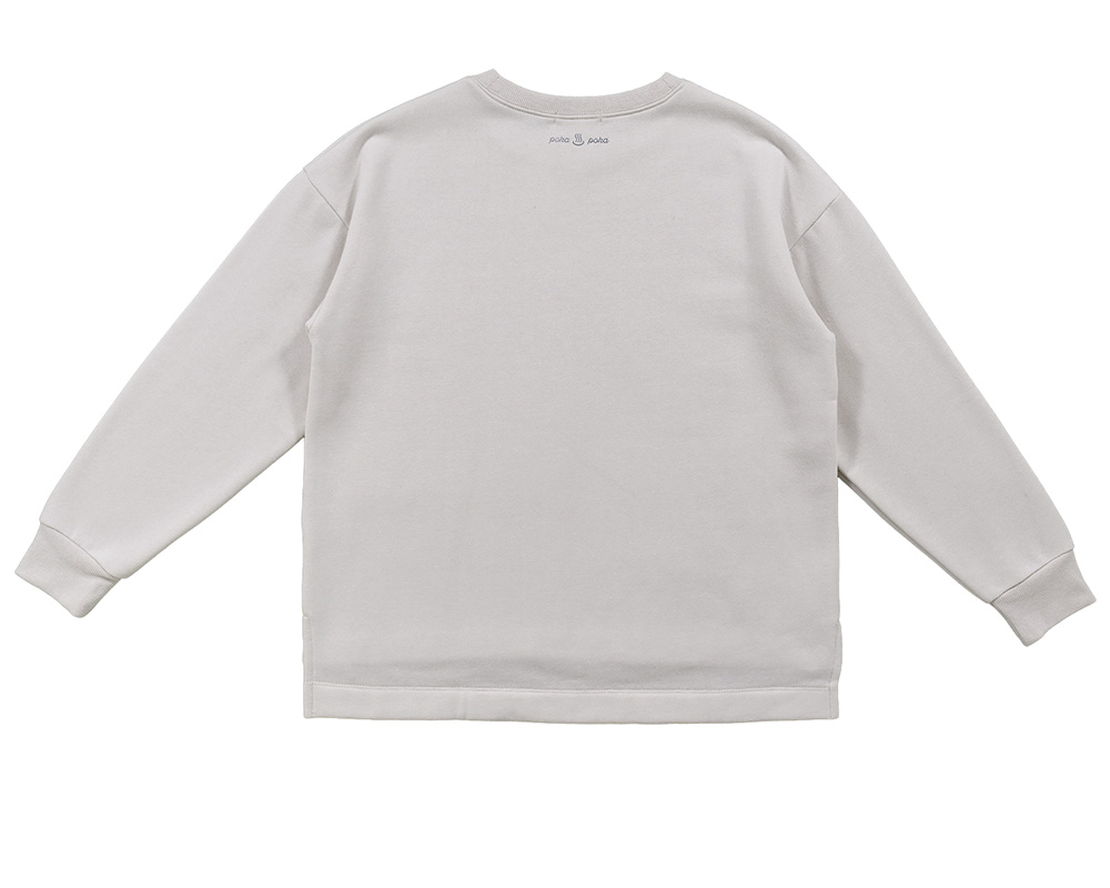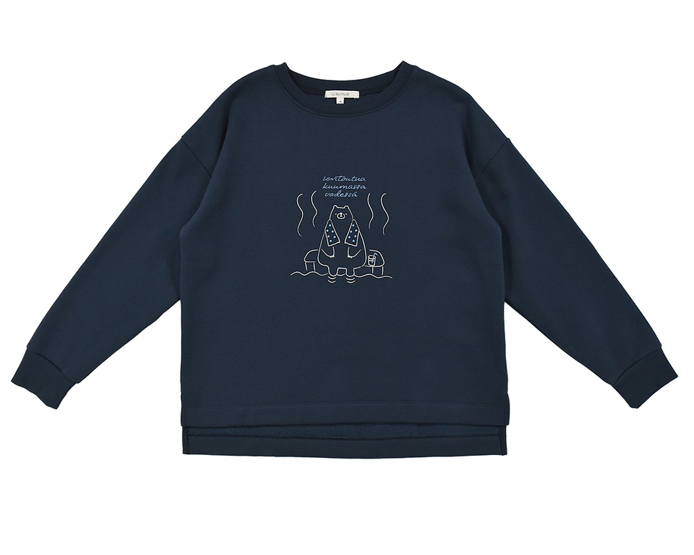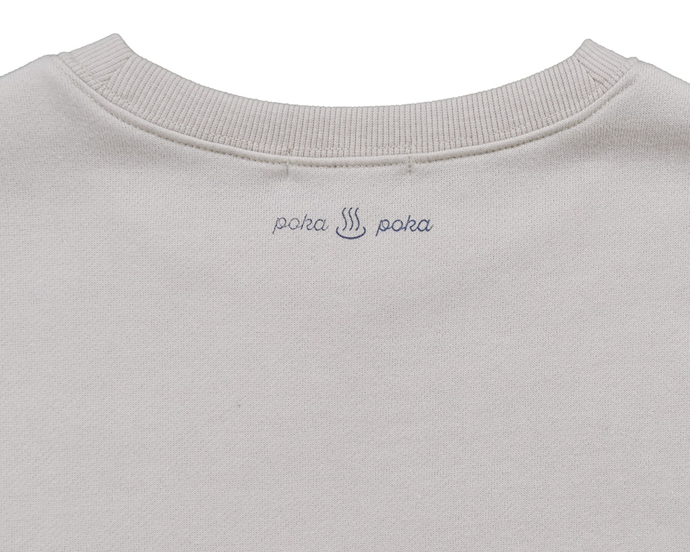 前後差のある丈感がポイント。ふわふわの裏起毛でやさしい肌触りです。足湯でほっこりとくつろぐシロクマや、むすびつながるイベントをスープに見立てたプリントで、心も体もぽかぽかあたたまる世界観を表現しました。