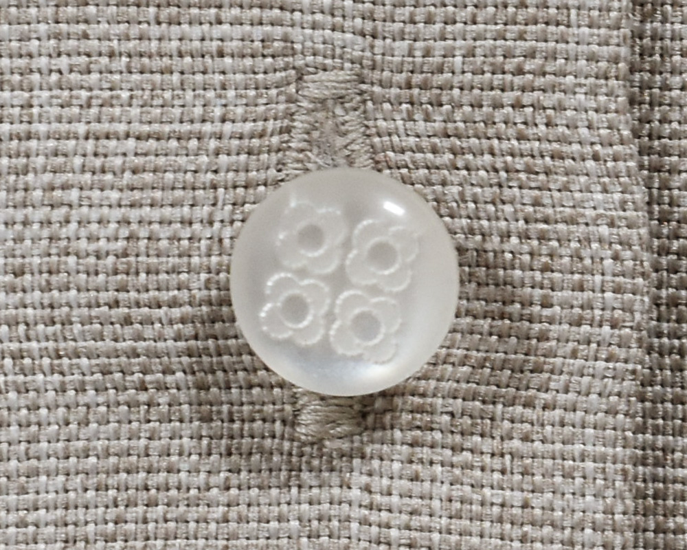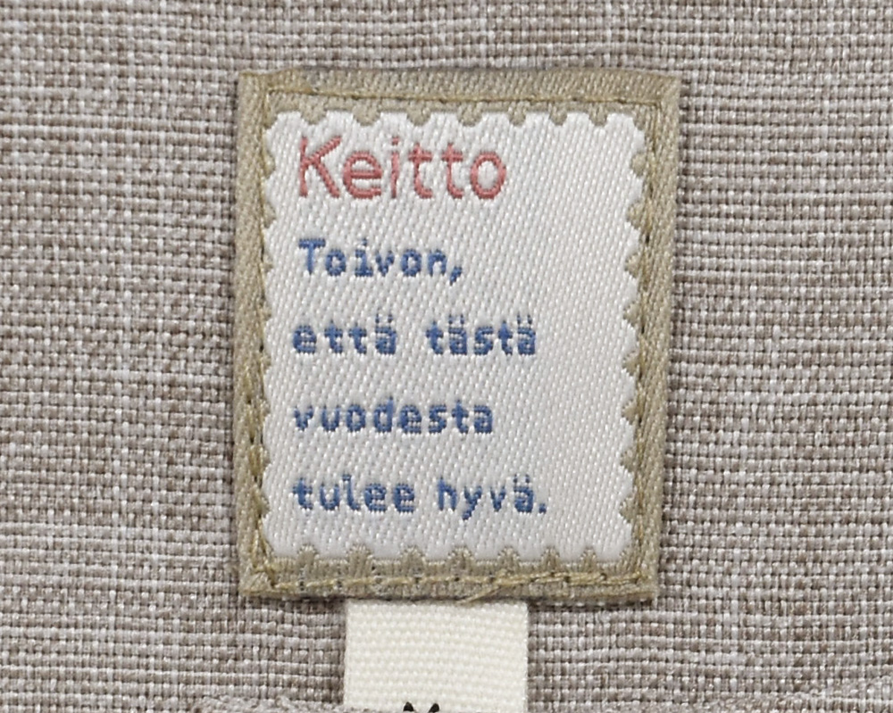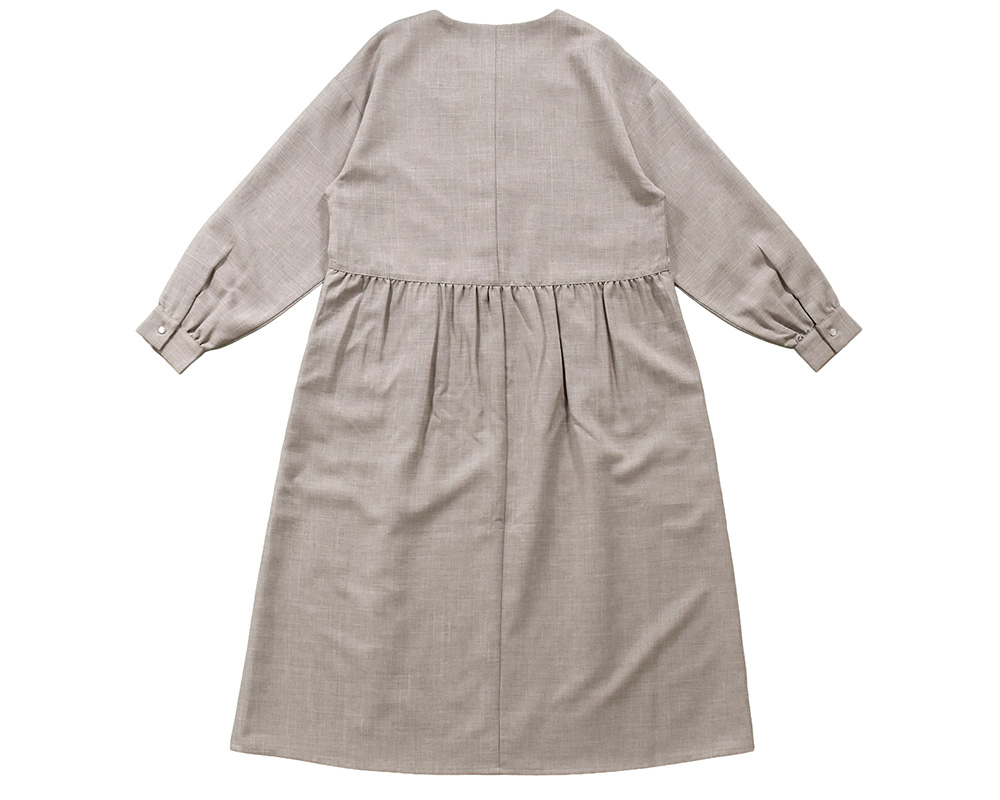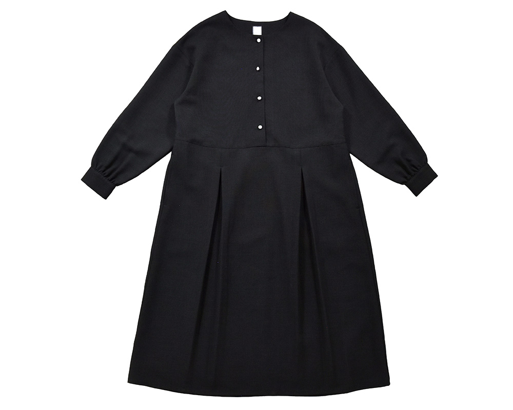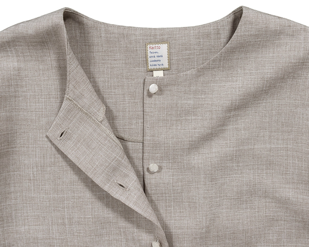 スカート部分にタックを入れたワンピースは、きれいめにもカジュアルにも対応できる万能デザイン。落ち感のきれいなポリエステル生地を使用し、上品に仕上げました。ブランドネームには、フィンランド語で「今年もいい年になりますように」という意味のロゴを入れました。前あきのボタンには、花の彫り柄をあしらいました。