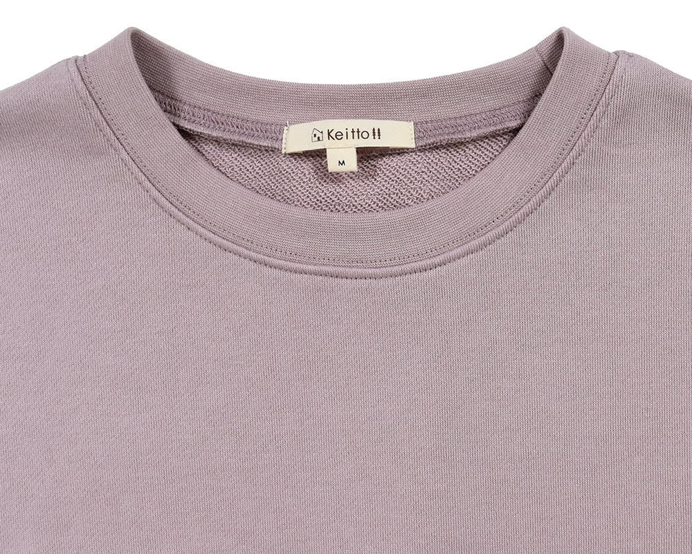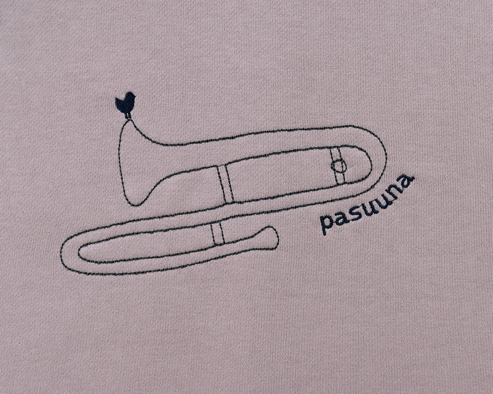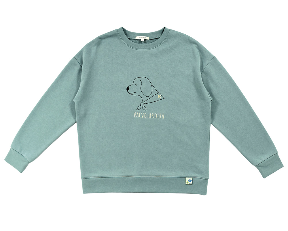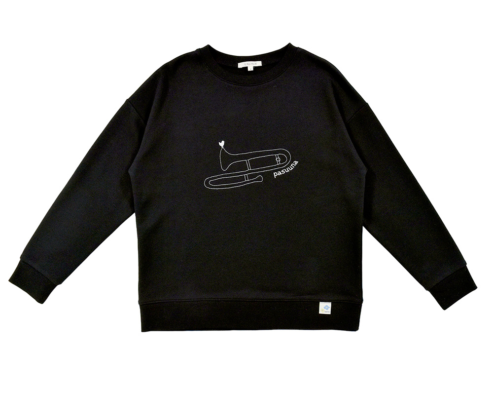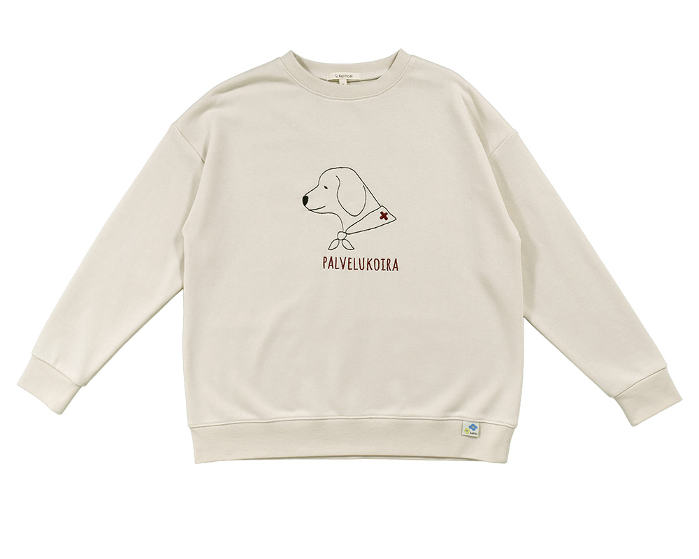裾をリブで切り替えたカジュアルなスウェットプルオーバーです。起毛なしの裏毛生地で、春まで長く着られます。胸には春待ち市のシーンをイメージした介助犬と、北欧音楽祭のトロンボーンの刺繍。裾には北欧らしい花のピスネームをあしらい、遊び心をプラスしました。