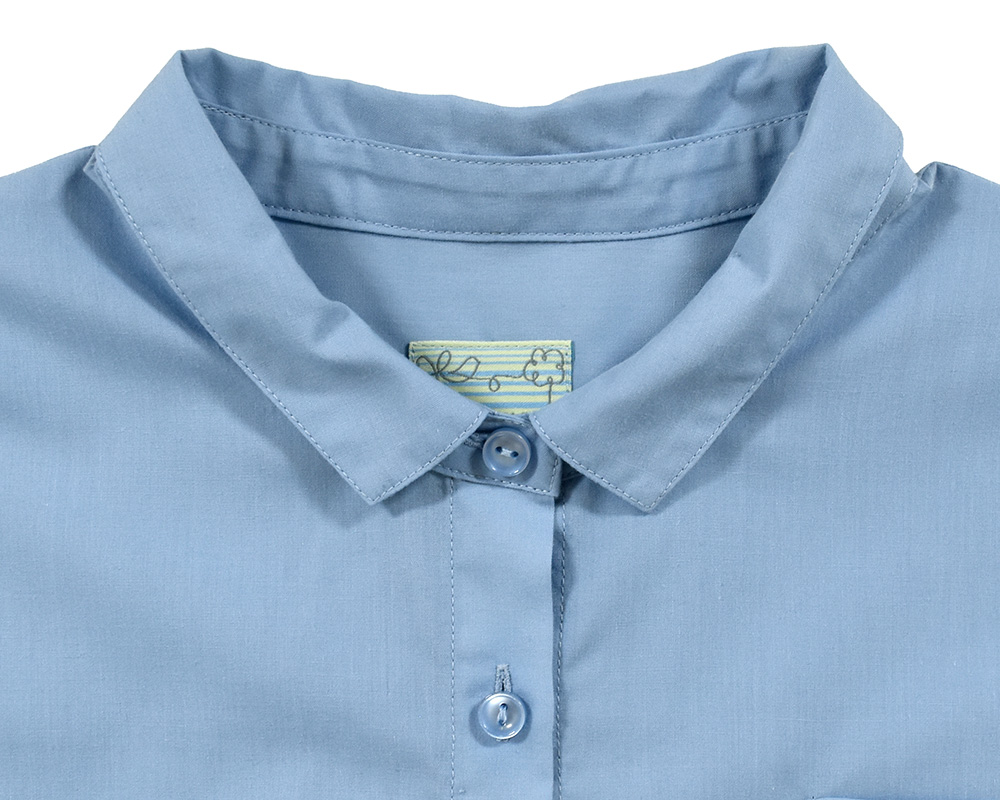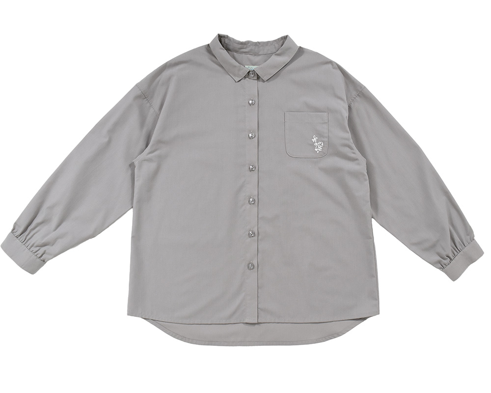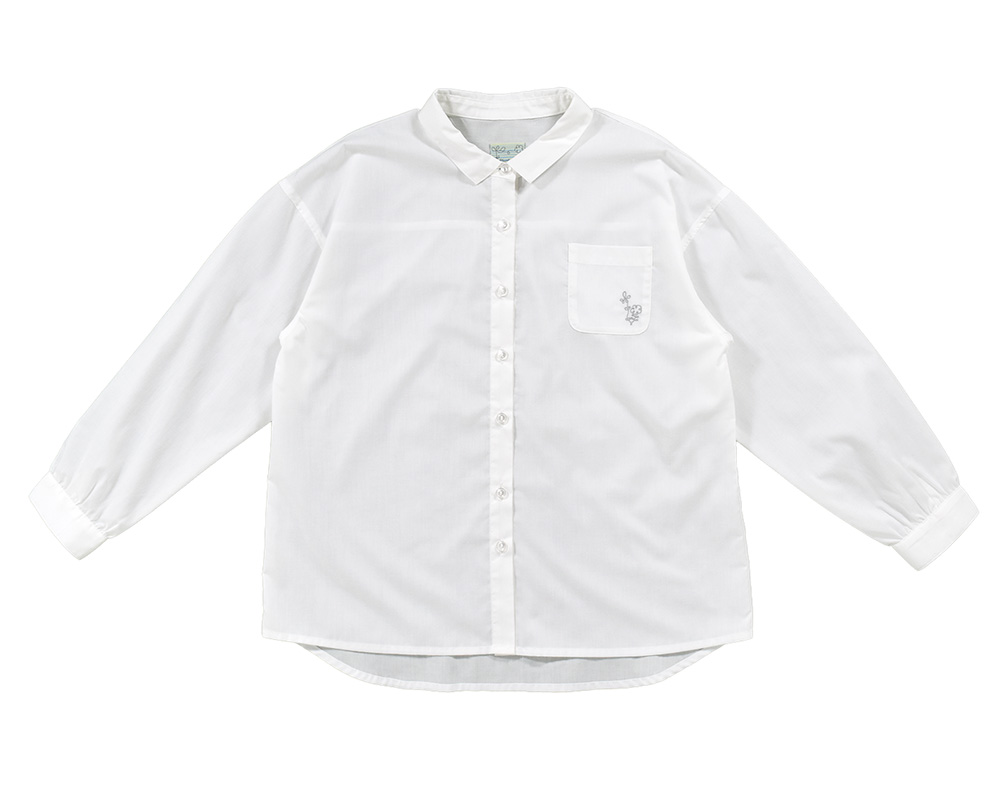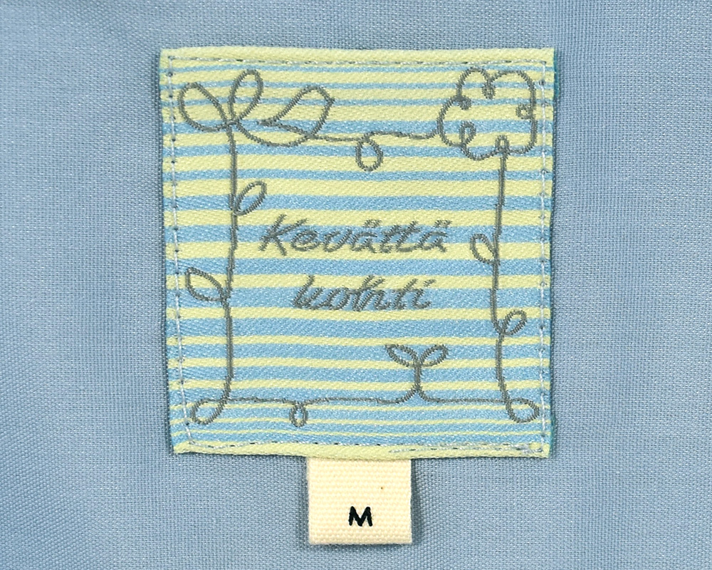 襟を小さめに仕上げたデザインで、ニットのインナーにも、一枚着にも使える便利なシャツです。お手入れしやすく、長く着られる綿混のポリエステル生地を使用。ブランドネームには、冬から春へ移り変わるイメージをグラデーションと植物や小鳥などで表現し、「春へ向かって」というフィンランド語のロゴを添えました。胸ポケットにはブランドネームとおそろいの線描きの植物刺繍入り。