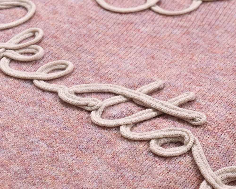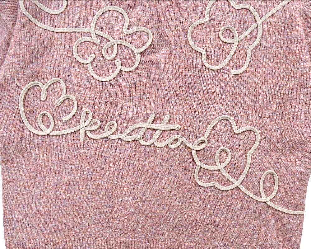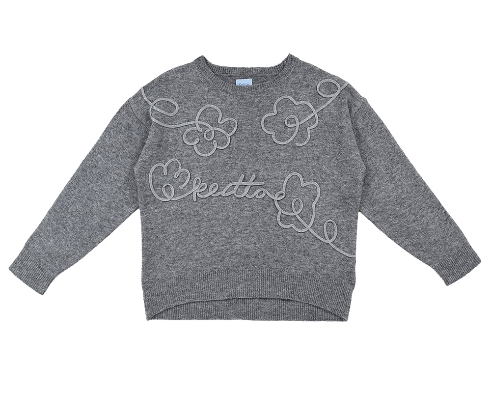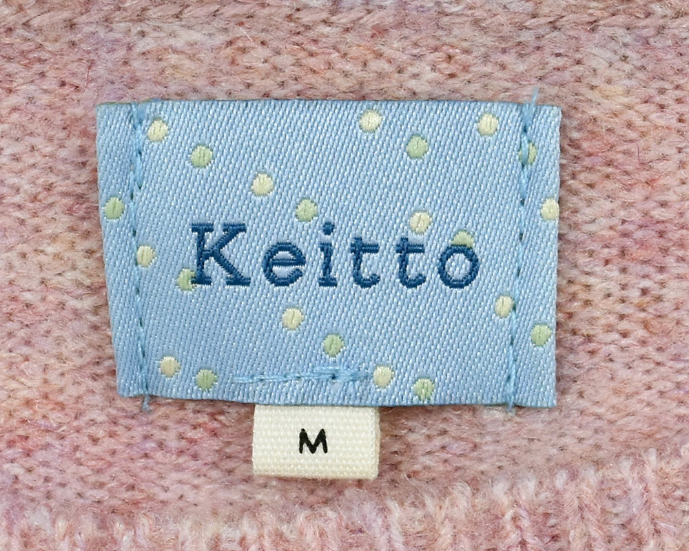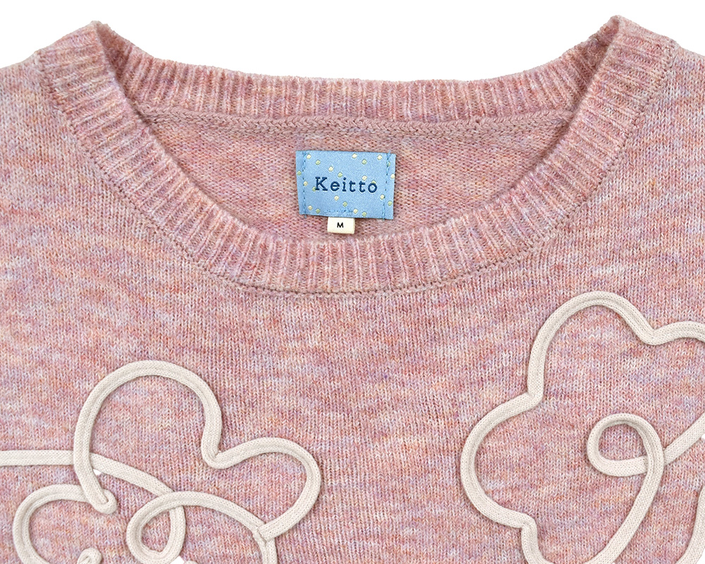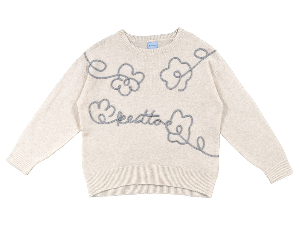4つのお花とKeittoロゴをコード刺繍であしらったニットプルオーバー。前後差のある丈感で腰まわりをカバーしてくれます。軽やかで肌当たりのある編地が特徴。抗ピル加工を施し毛玉になりにくいのもポイントです。春に向けて芽生える種をイメージしたドット柄のブランドネーム付き。