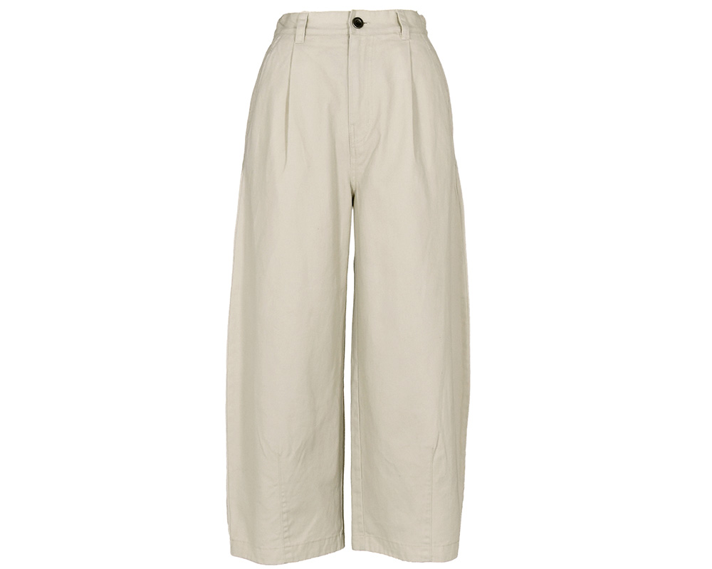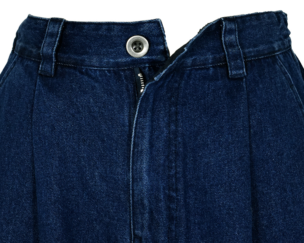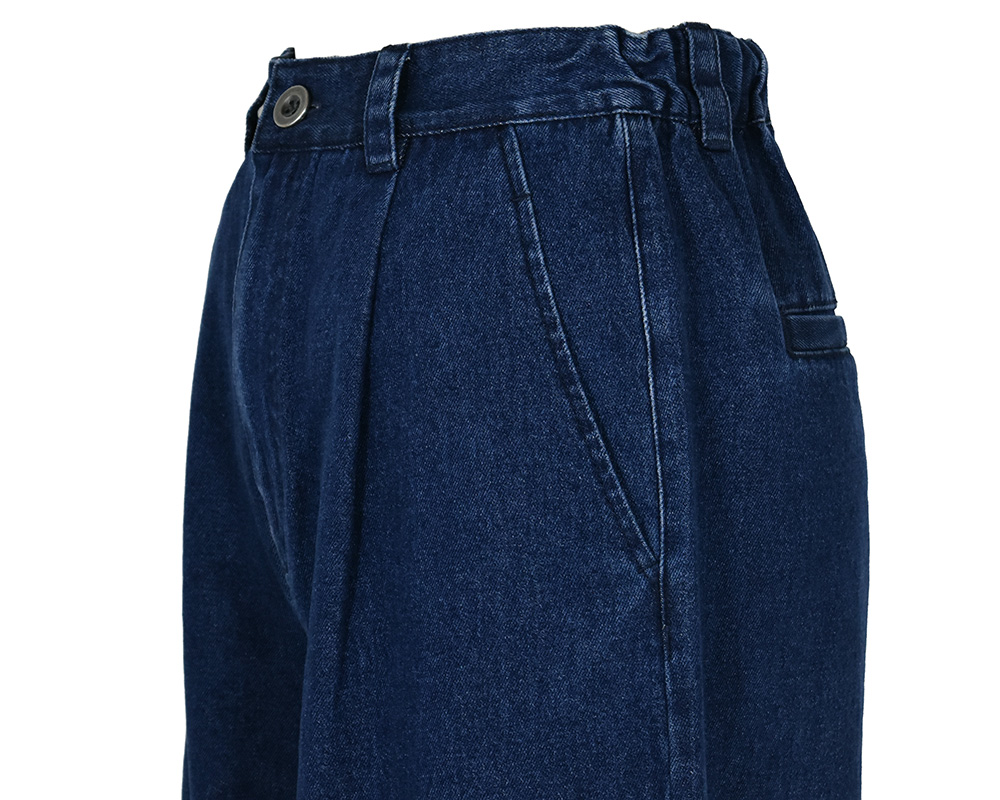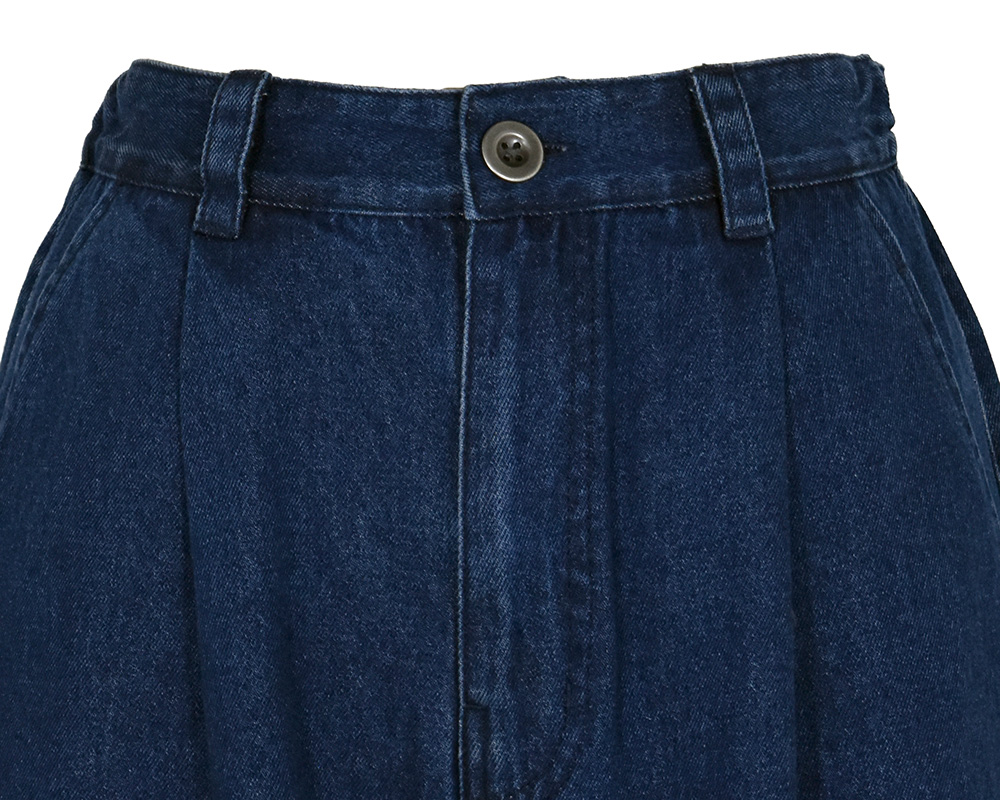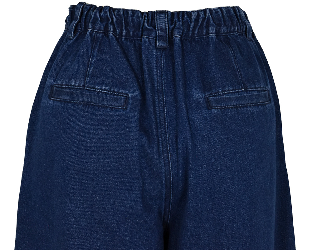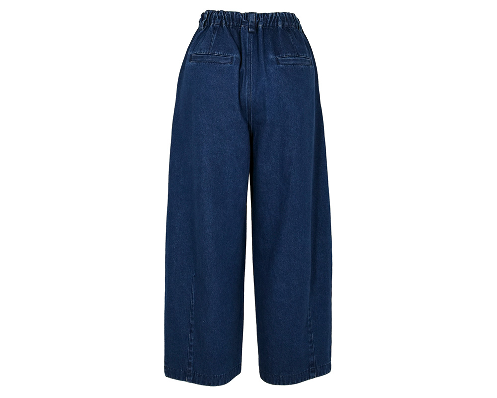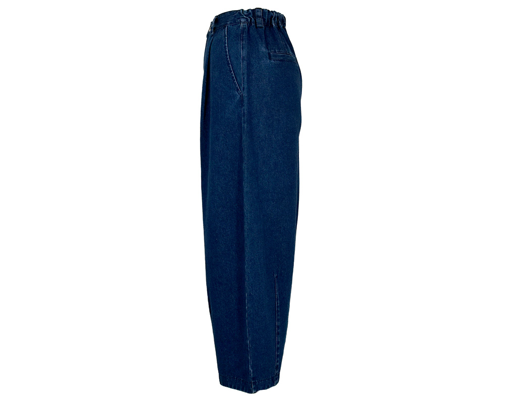程よい厚みのあるデニムを使用したパンツです。前・後裾にダーツを入れ、脇線をカーブに描いた立体的なバレル(樽型)パンツに仕上げています。前開き、後ろウエストはゴム仕様。両脇、後ろポケットあり。