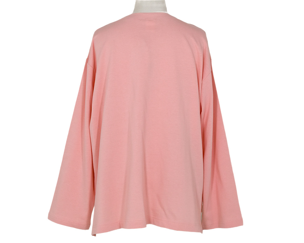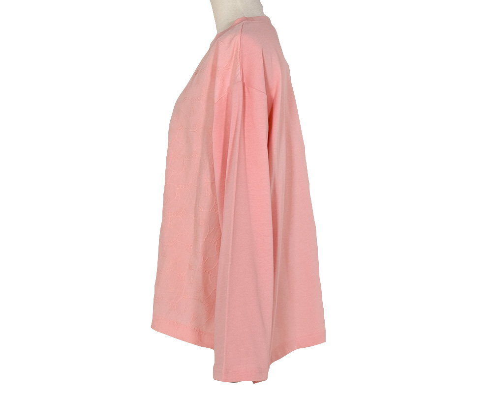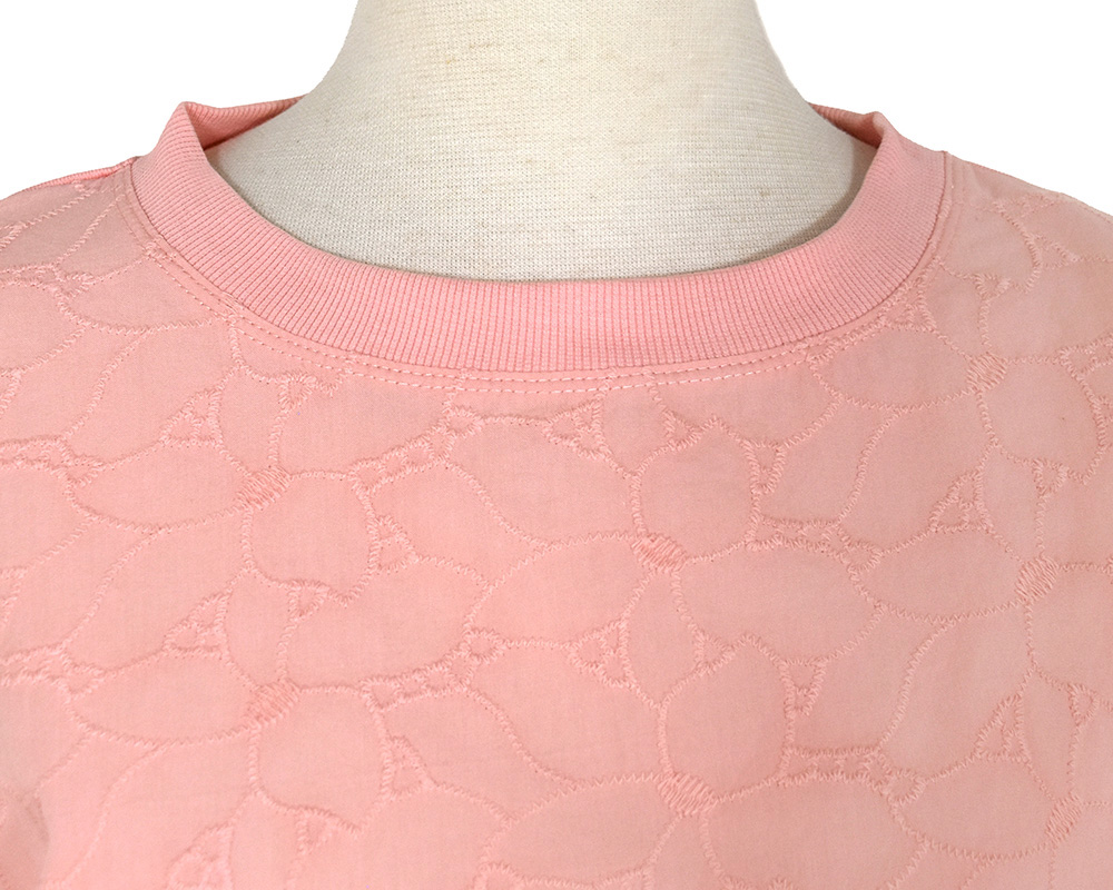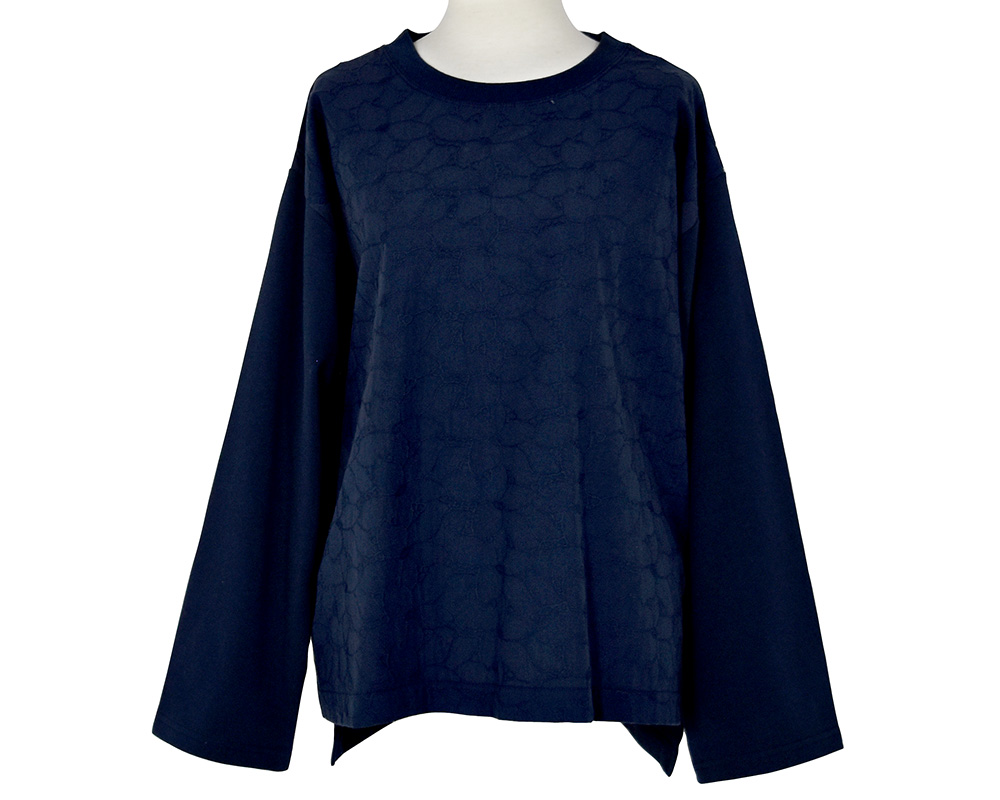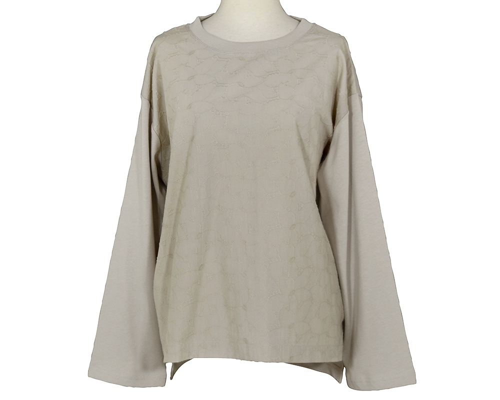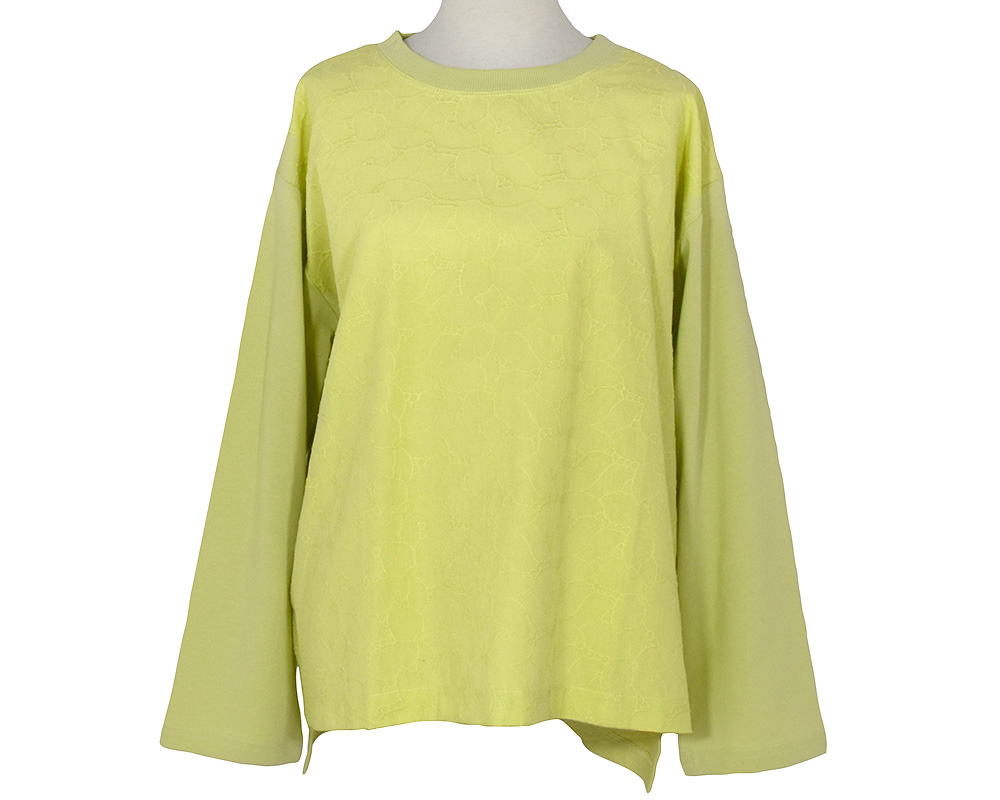 後ろ見頃と袖はカットソー、前見頃は花びら刺繍を施した布帛を使用したプルオーバーです。衿はリブ仕立てで、頭入れがしやすい仕様です。スイセンの花びらをイメージした刺繍柄です
