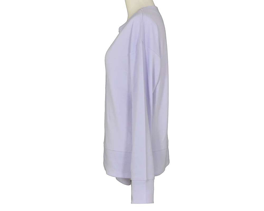 毎回好評のコットン接結天竺素材のクルーネックプルオーバーです。ドロップショルダーの身体に沿わない程よくゆとりのあるサイズ感で、袖口や裾のダブル巾が広めでしっかりしているので、1枚でも着用しやすいデザインです。ニットやベストのインナーに着るなど、春の重ね着に活躍する1枚です。