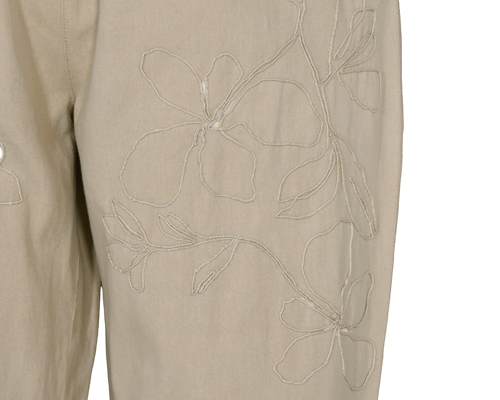 太番手糸で施したエンブロイダリーがニュアンスのあるテーパードパンツです。腰周りから裾にかけて、ゆったりしつつきれいなシルエットで、ラフ過ぎない大人のイージーパンツです。エンブロイダリーは菫をモチーフにしています。ベルトループ付き。両脇、後ろポケットあり。