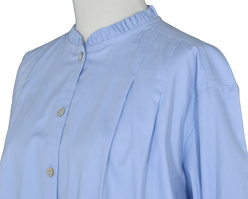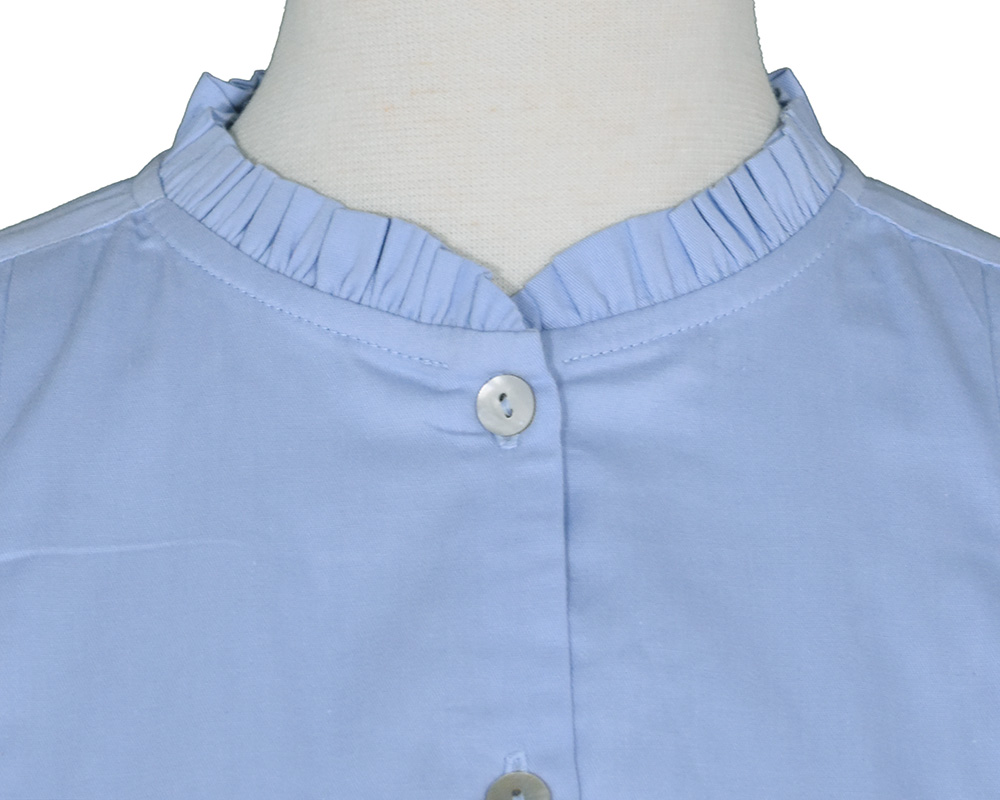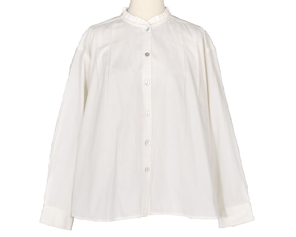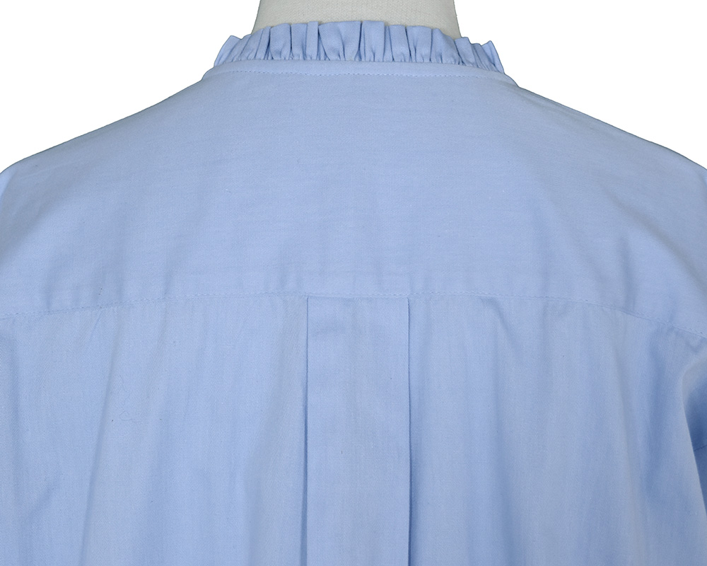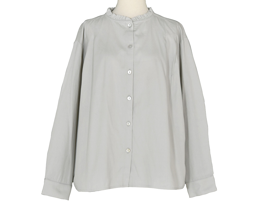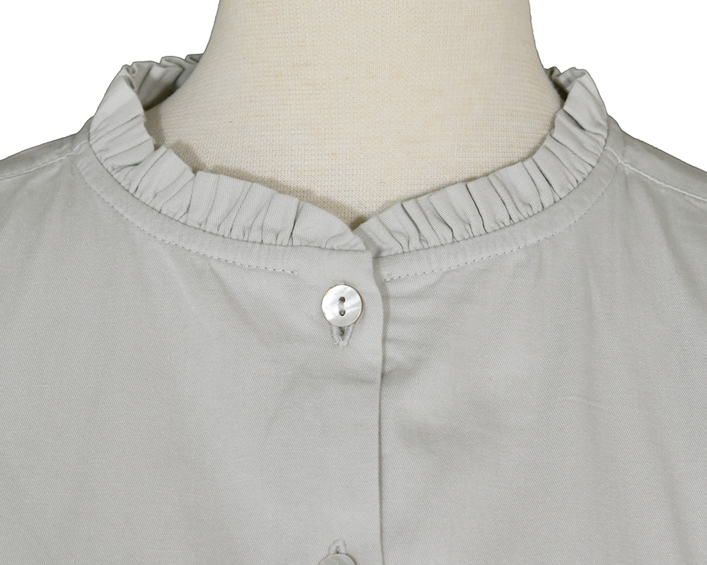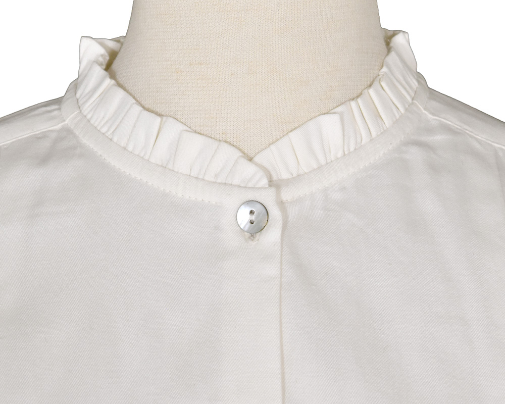 コンパクトなフリルカラーで甘さを控えた、クラシカルな印象のブラウスです。いつものニットやカーデにレイヤードすることで首元が華やかになり、コーディネートのアクセントになります。きれいめなONスタイルにもお使いいただけます。
