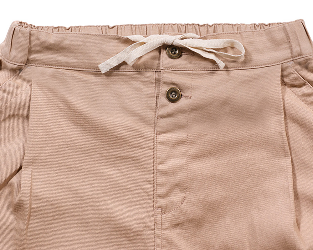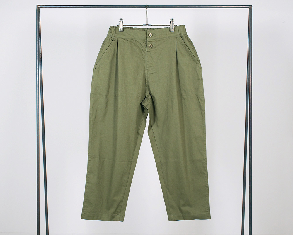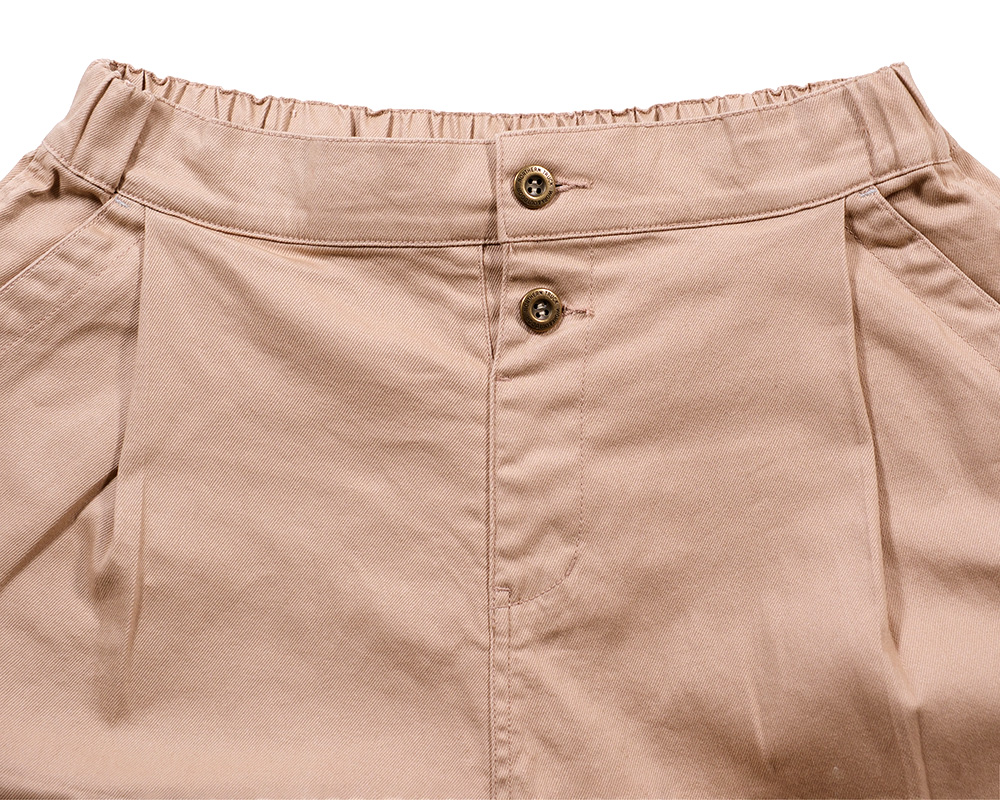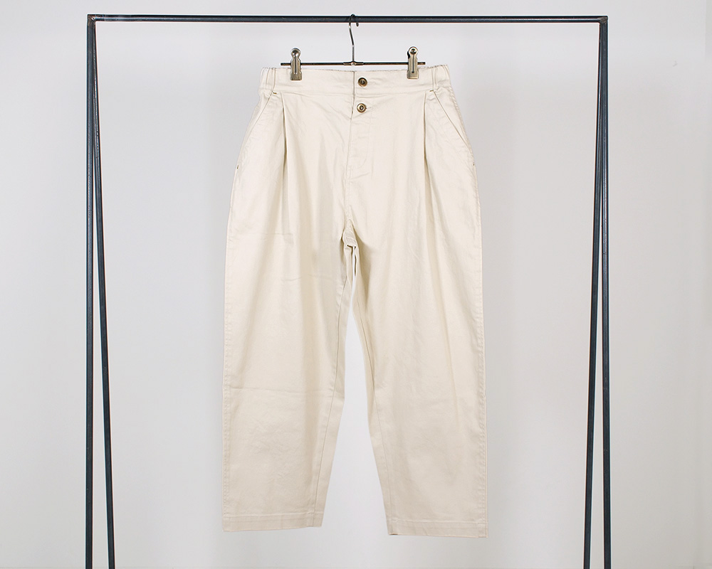 フロントにタックを入れ、程よくゆとりを持たせたリラックス感のあるパンツ。ウエストは後ろゴム仕様で、快適な穿き心地を実現しました。フロントのボタンデザインが程よいアクセントになり、トップスインのスタイルもきれいに決まります。ヒップポケットに付けたピスネームがさりげないポイント。デイリーに活躍するカジュアルな一本で、ブラウスやカットソーなど幅広いアイテムと好相性のパンツです。