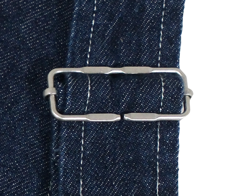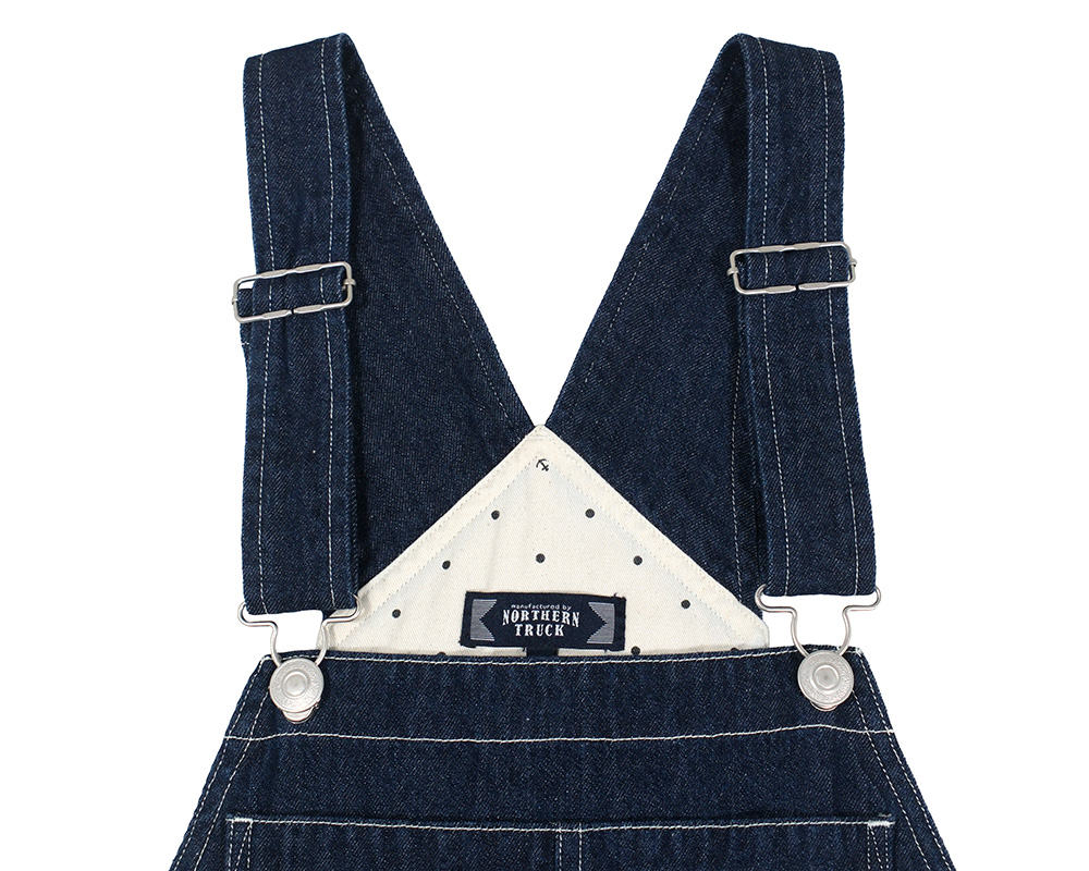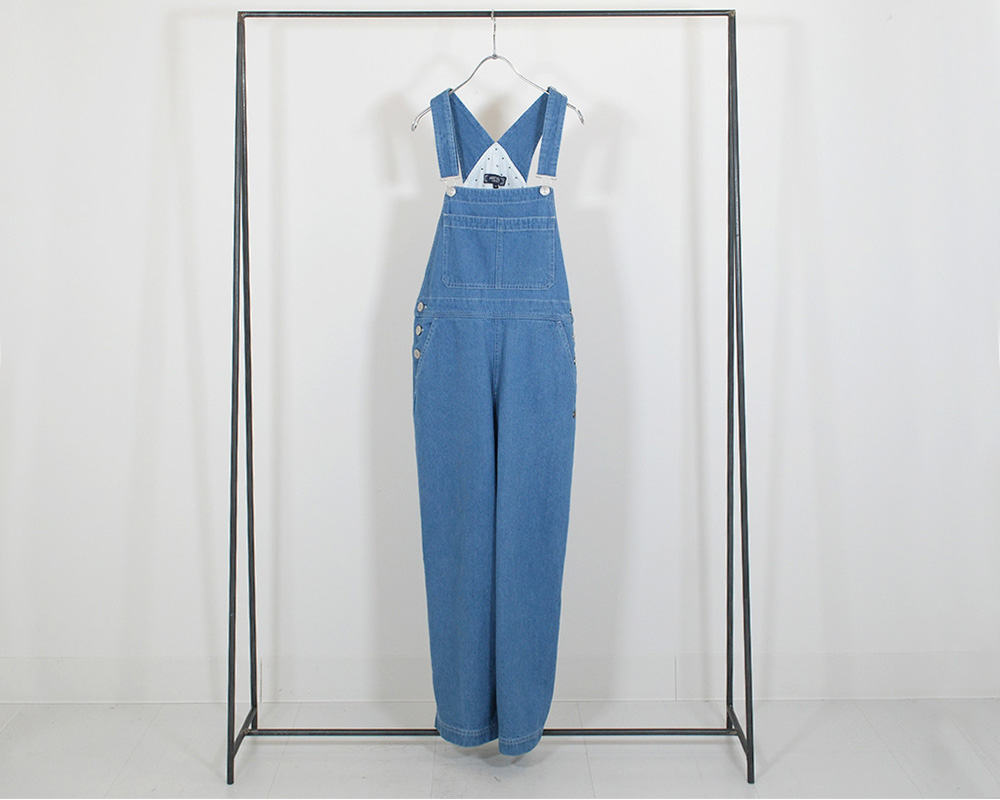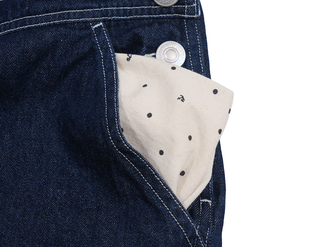 程よい厚みの9ozデニム&ツイル素材を使用したスタンダードなオーバーオール。胸当て部分のポケットや金属パーツなど、ワークウェアらしいディテールを取り入れつつ、ほどよいワイドシルエットでナチュラルに着こなせる一枚です。胸当て、背あて裏、ポケット袋布など、表から見えない箇所にオリジナルドットプリントのシーチング生地をあしらい、さりげなく個性を感じさせるデザインに。また、USA古着のプレートをイメージしたヴィンテージ風のオリジナル金属プレートがアクセントとして光ります。