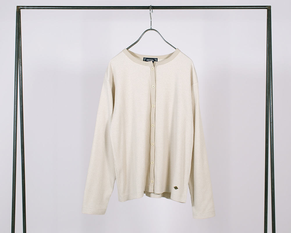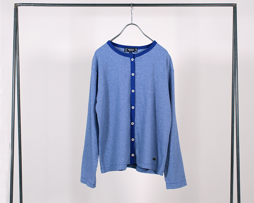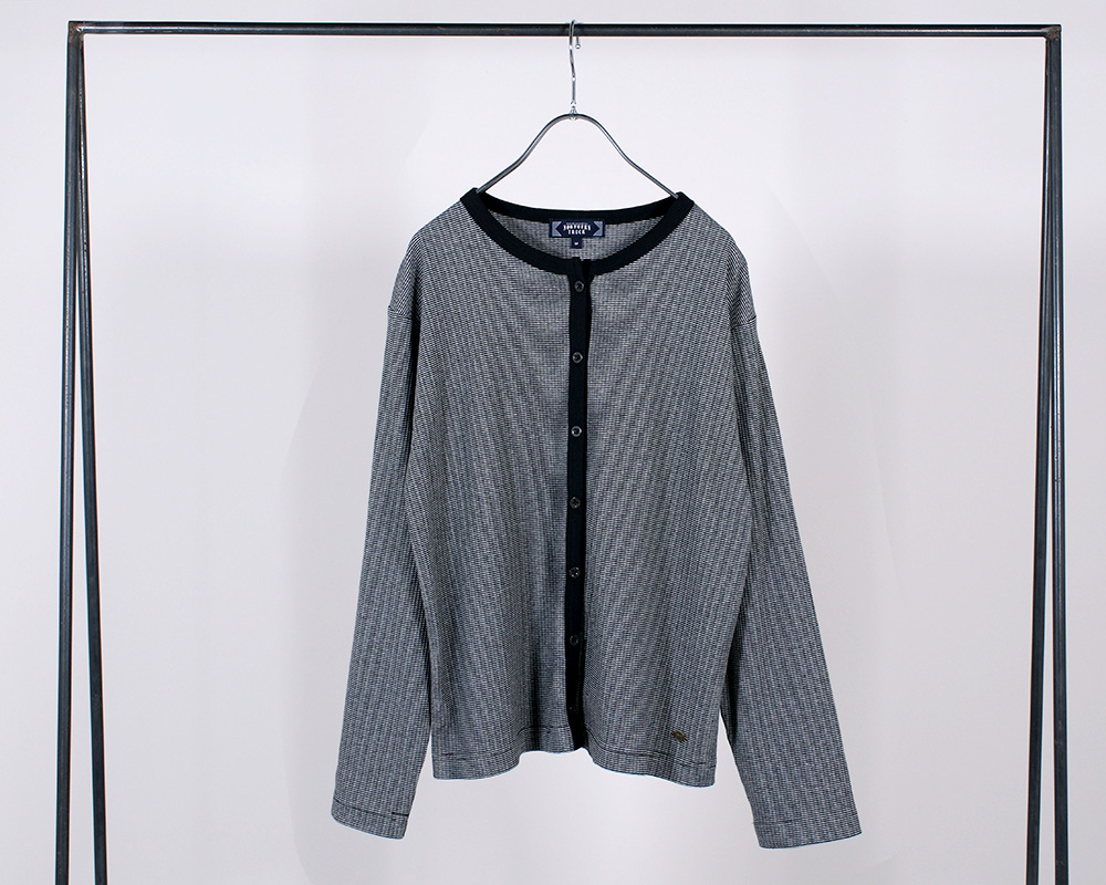 リブ編みのカットソー素材で仕上げた、柔らかな着心地のカーディガン。細い線が繰り返された微塵ボーダー柄で企画しました。主張しすぎず上品な印象を与え、カジュアルからきれいめまで幅広いスタイルに合わせやすいアイテムです。衿ぐりや前立てに無地を使用することで、すっきりと見せてくれ、アクセントにもなっています。裾には小さめのプレートを付けポイントをプラス。程よく身体に沿うシルエットで、同じ素材のインナーやシャツなどとの重ね着コーデに活躍する一着です。