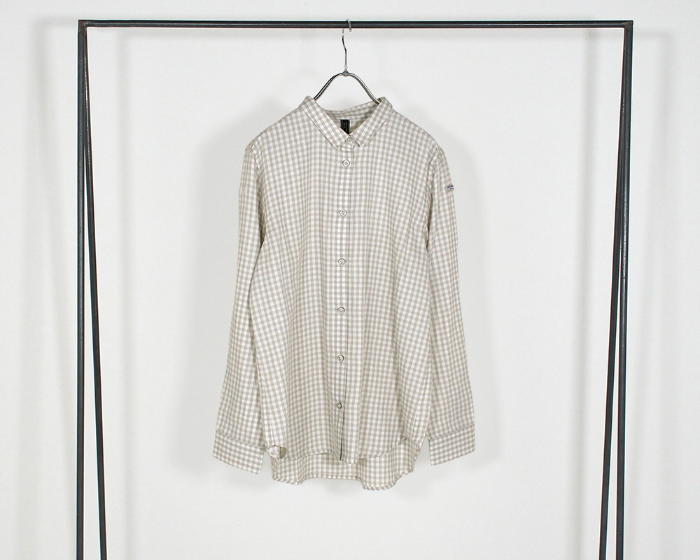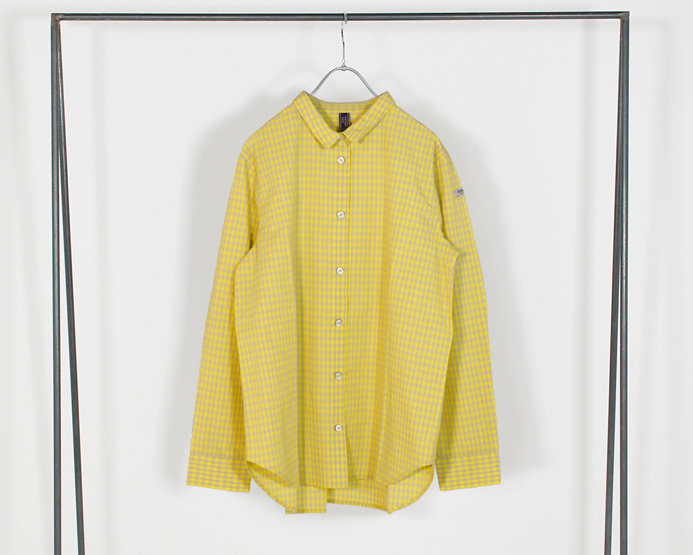 ベーシックなシルエットのシャツ。柔らかい印象のオフ×グレー、メリハリの聞いたオフ×ブラック、イエロー×グレーは少し落ち着いた春カラーになります。背中の綿テープがポイントになっているので1枚着としても着用しやすくなっています。