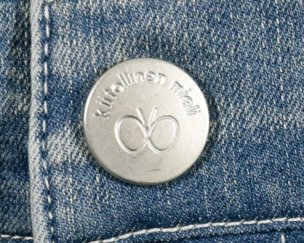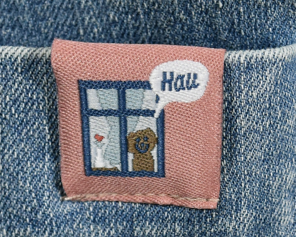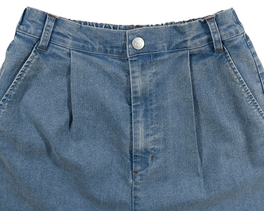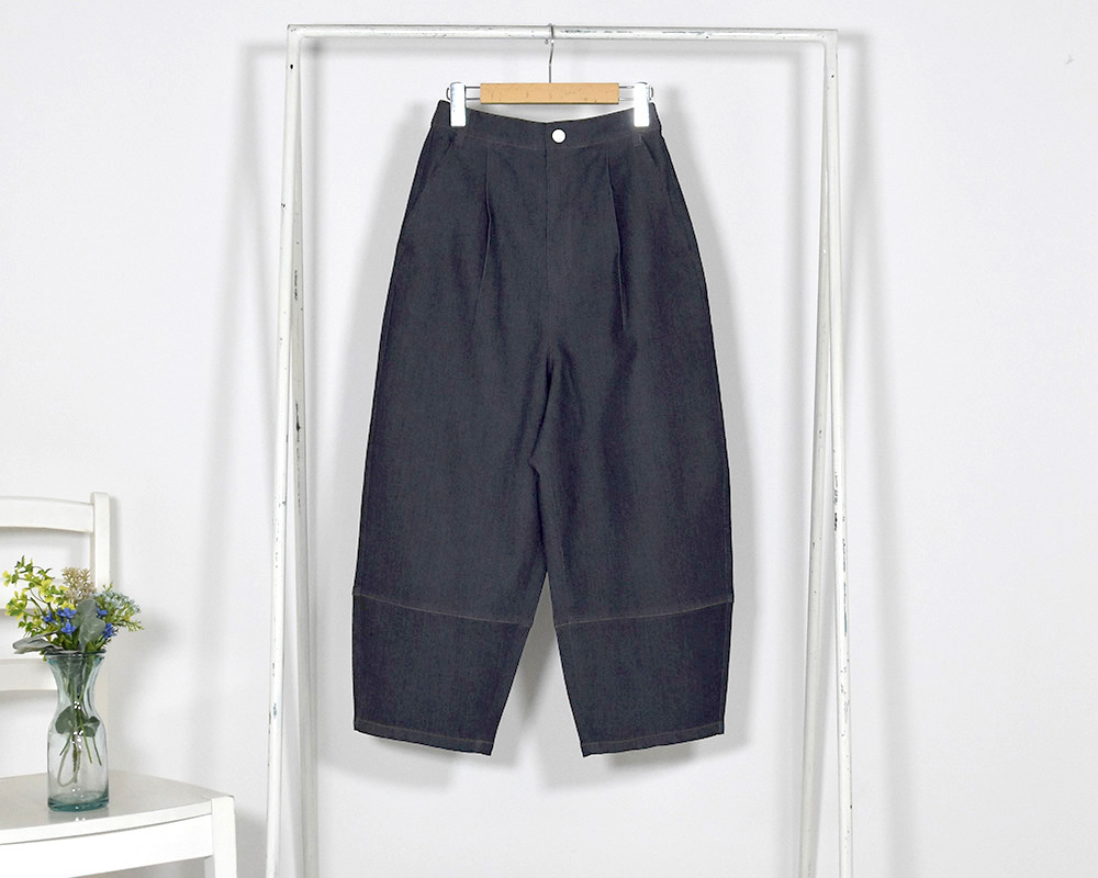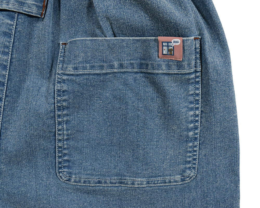 裾の切り替えで丸みを持たせた、コクーンシルエットのデニムパンツです。ストレッチ性のある生地を使い、動きやすさにもこだわりました。ウエストにはちょうちょの彫り柄入りスナップボタン、後ろポケットには窓辺からチャロが挨拶するピスネームを添えました。