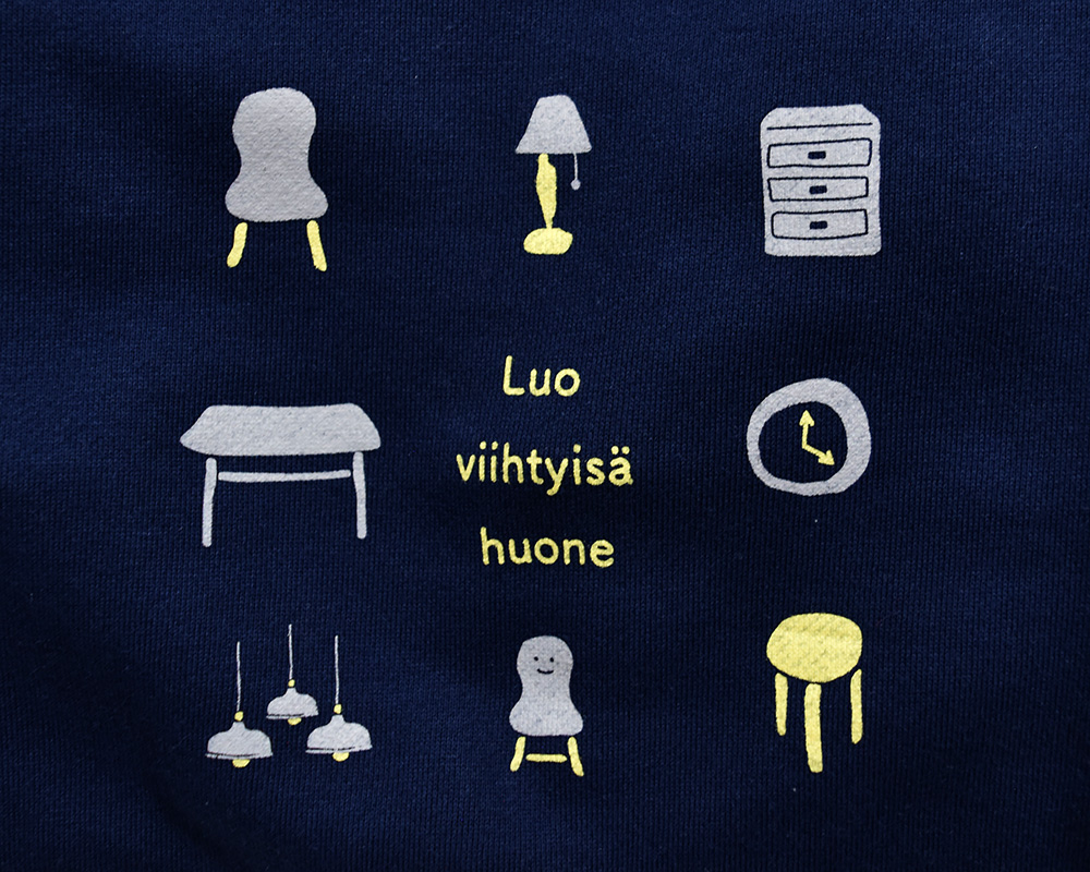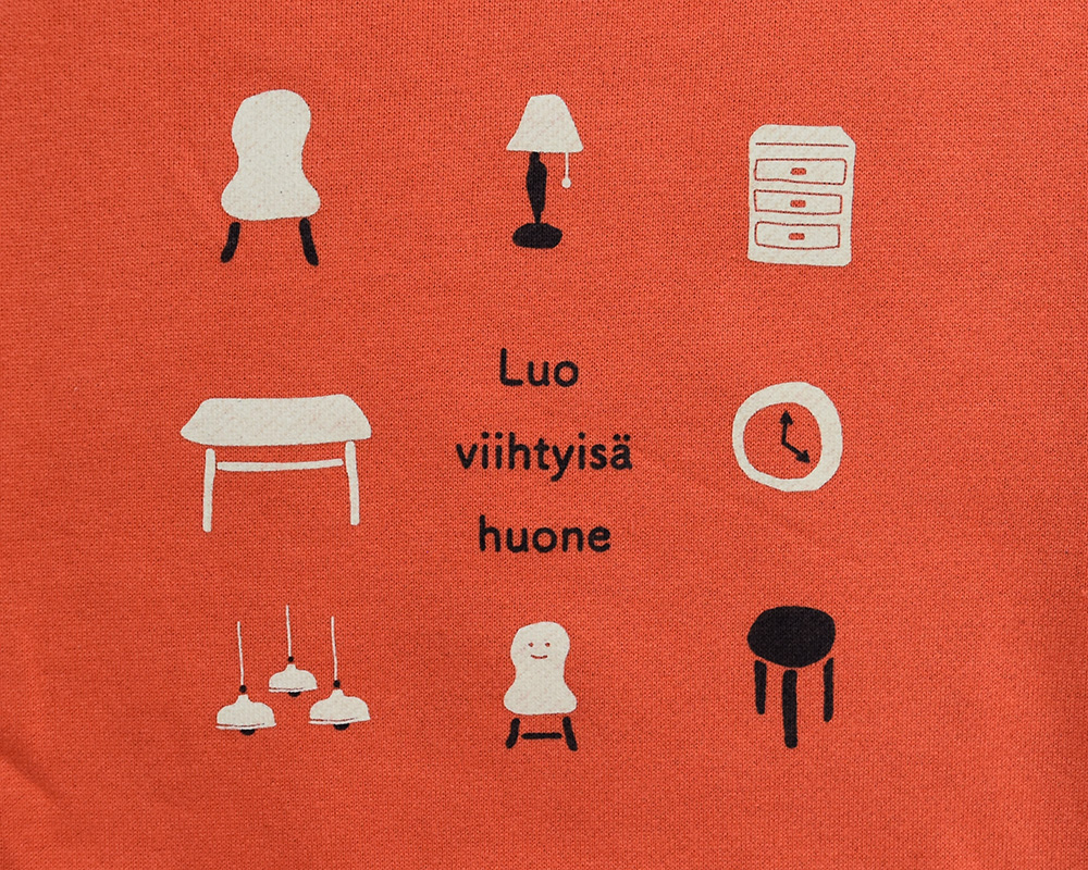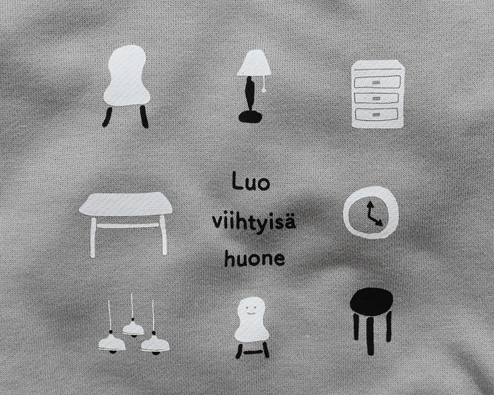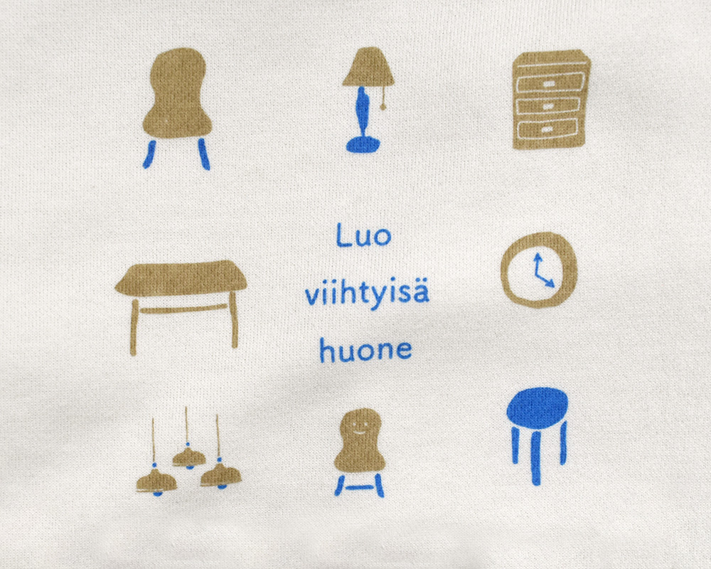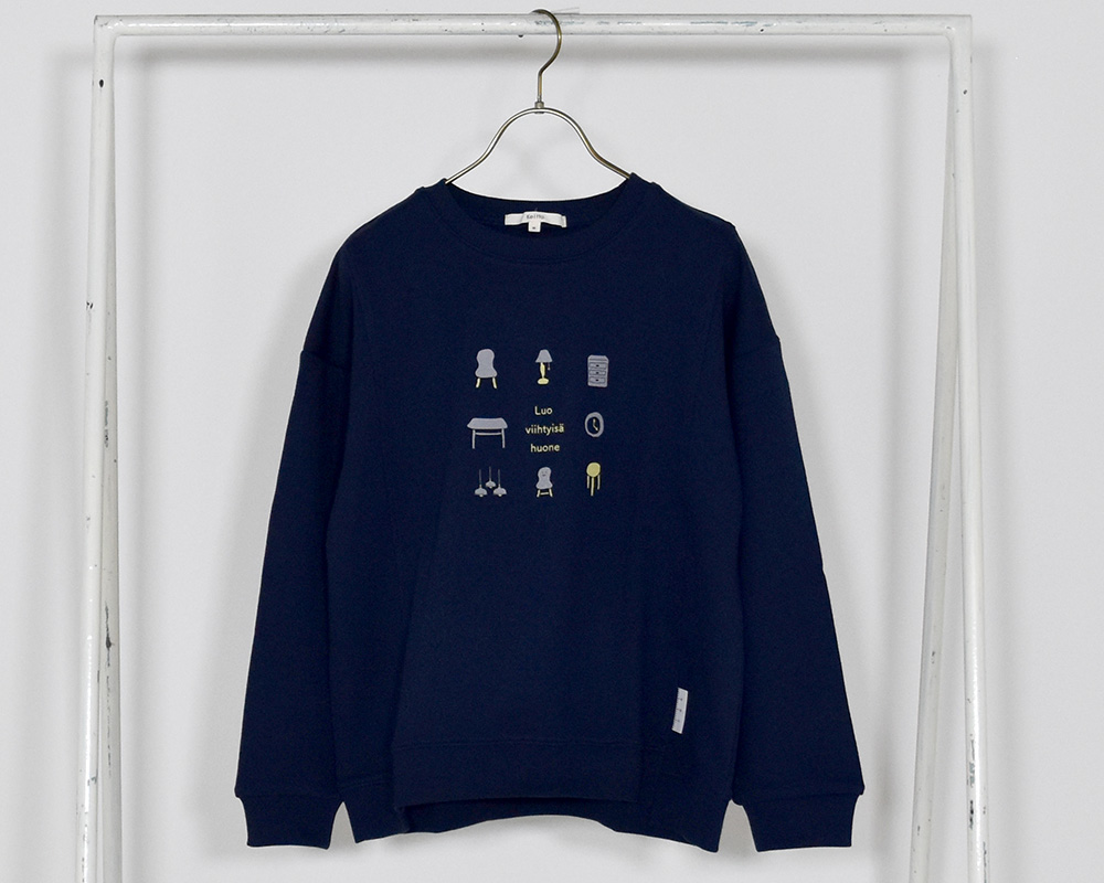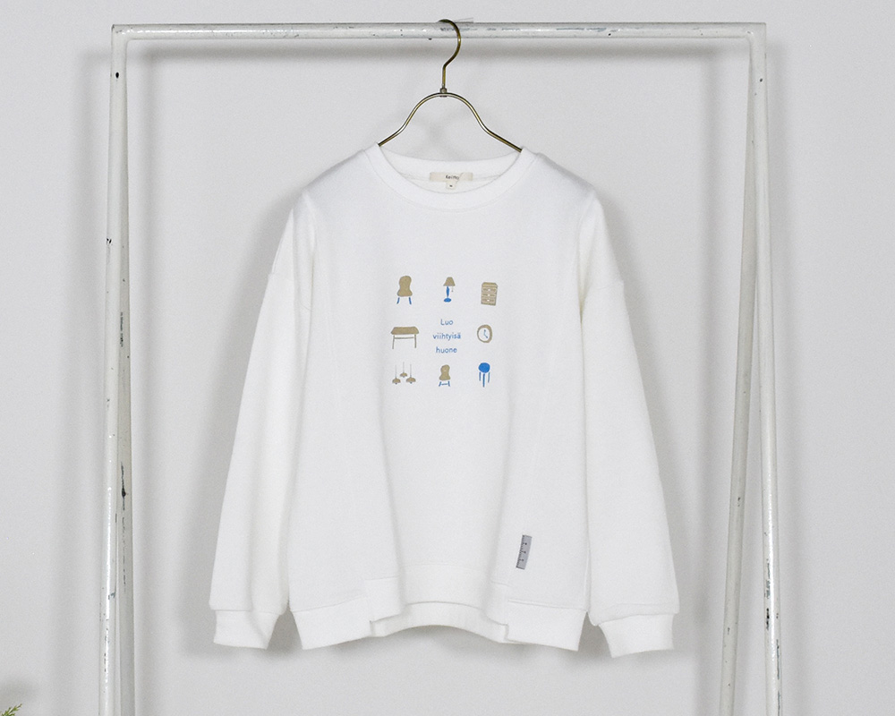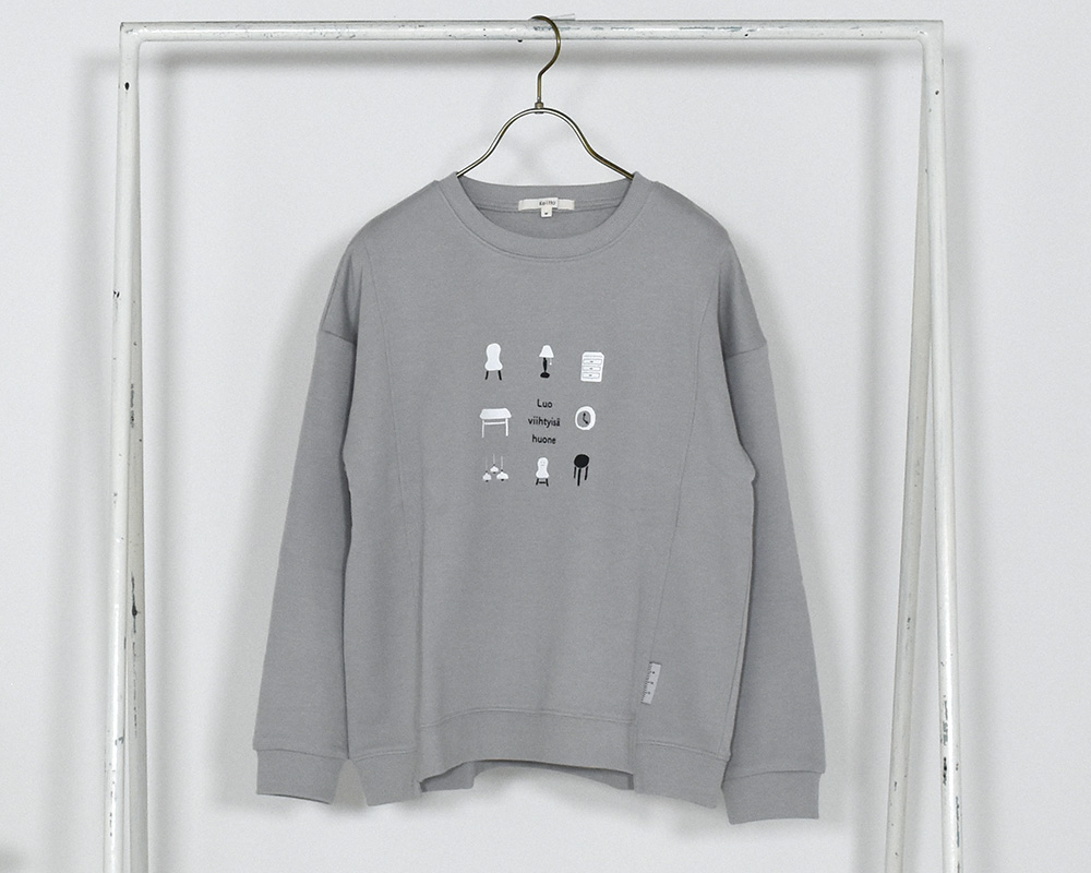 前身頃の両脇に切り替えを入れ、メリハリのあるシルエットに仕上げました。しっかり感がありつつも軽やかな裏毛素材です。親子の椅子やテーブル、掛け時計などをモチーフにしたインテリア柄のプリント。家具の配置を考えるのに欠かせない“メジャー”を表現したピスネームが、さりげないポイントです。