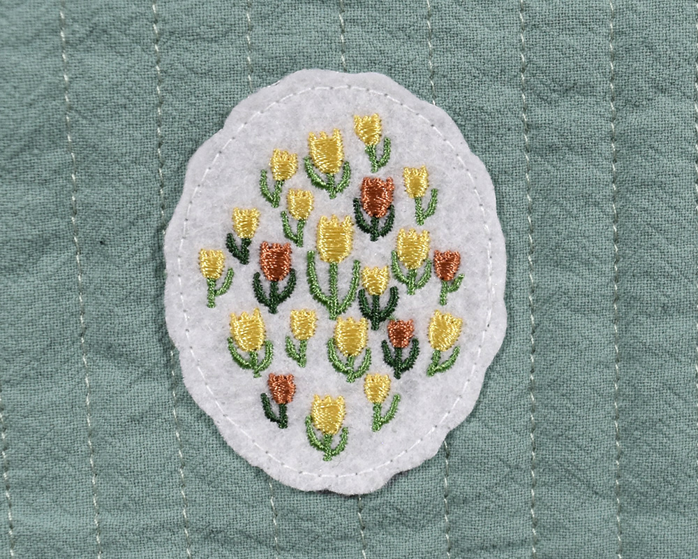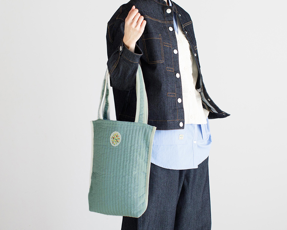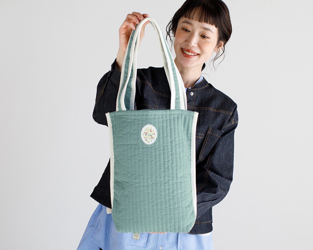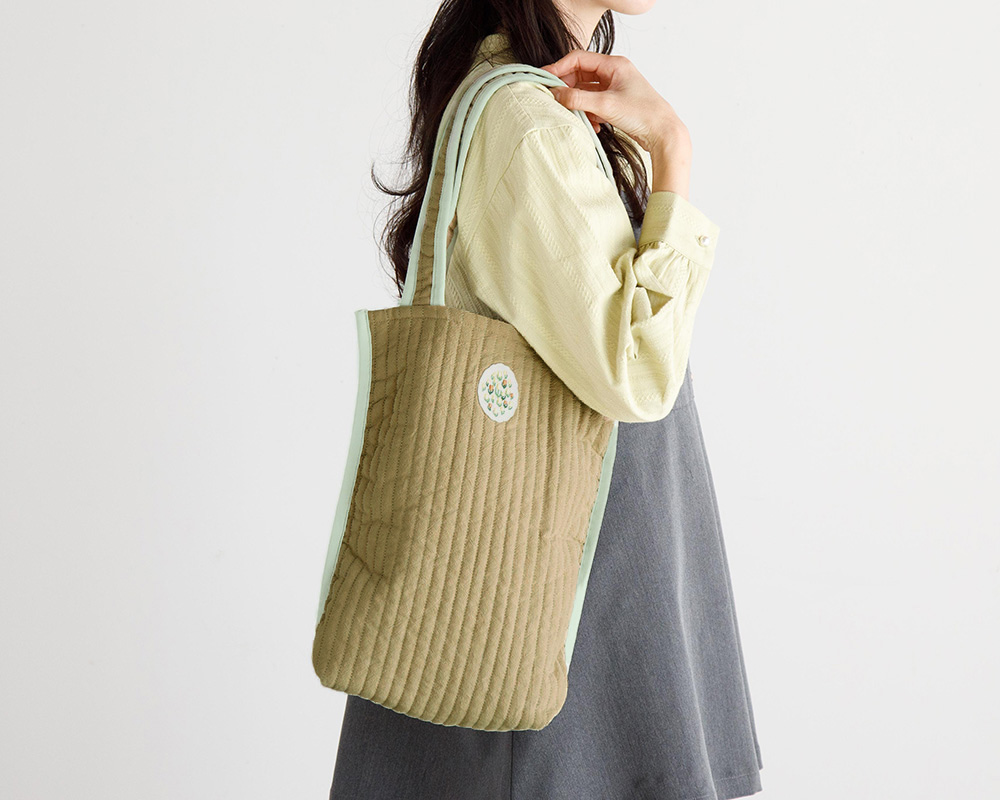配色のパイピングとワッペンがポイントになった、キルトトートバッグです。中わたを入れたストライプキルト生地を使用し、ふっくらとした仕上がりにしました。小さなチューリップをモチーフにしたワッペンが、やさしいアクセントを添えています。