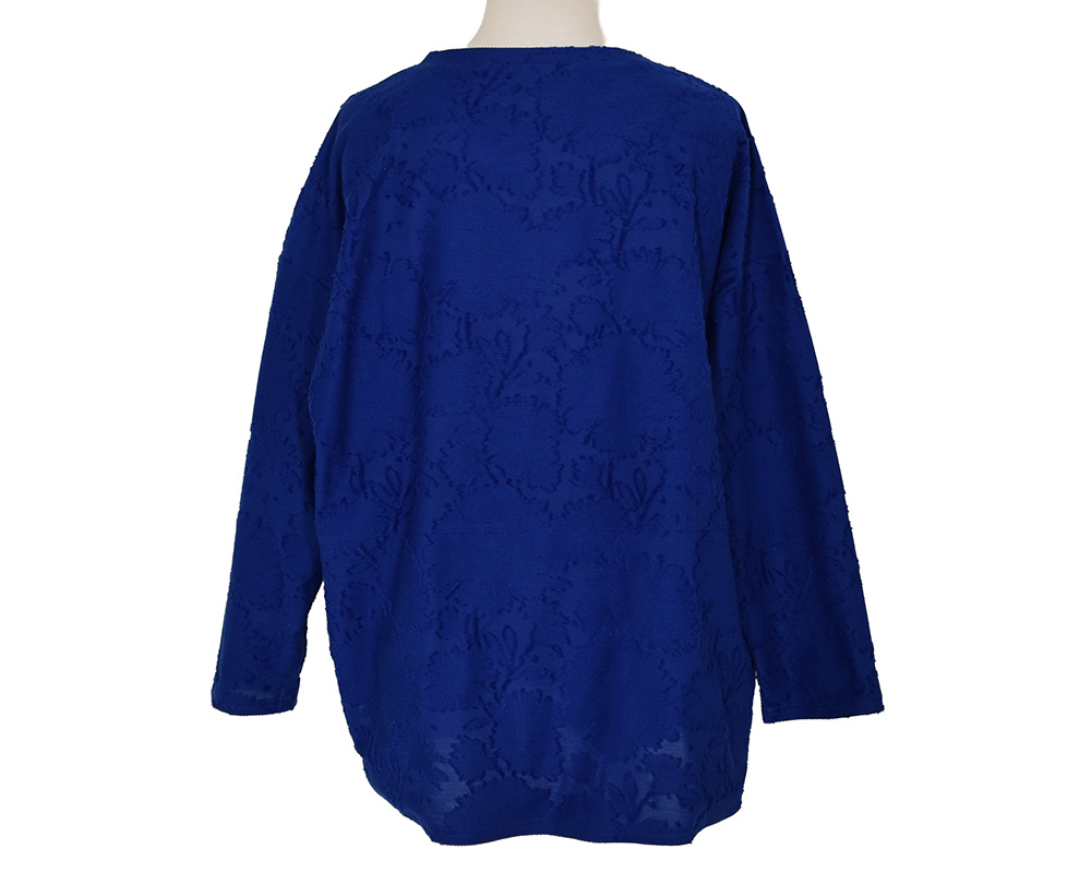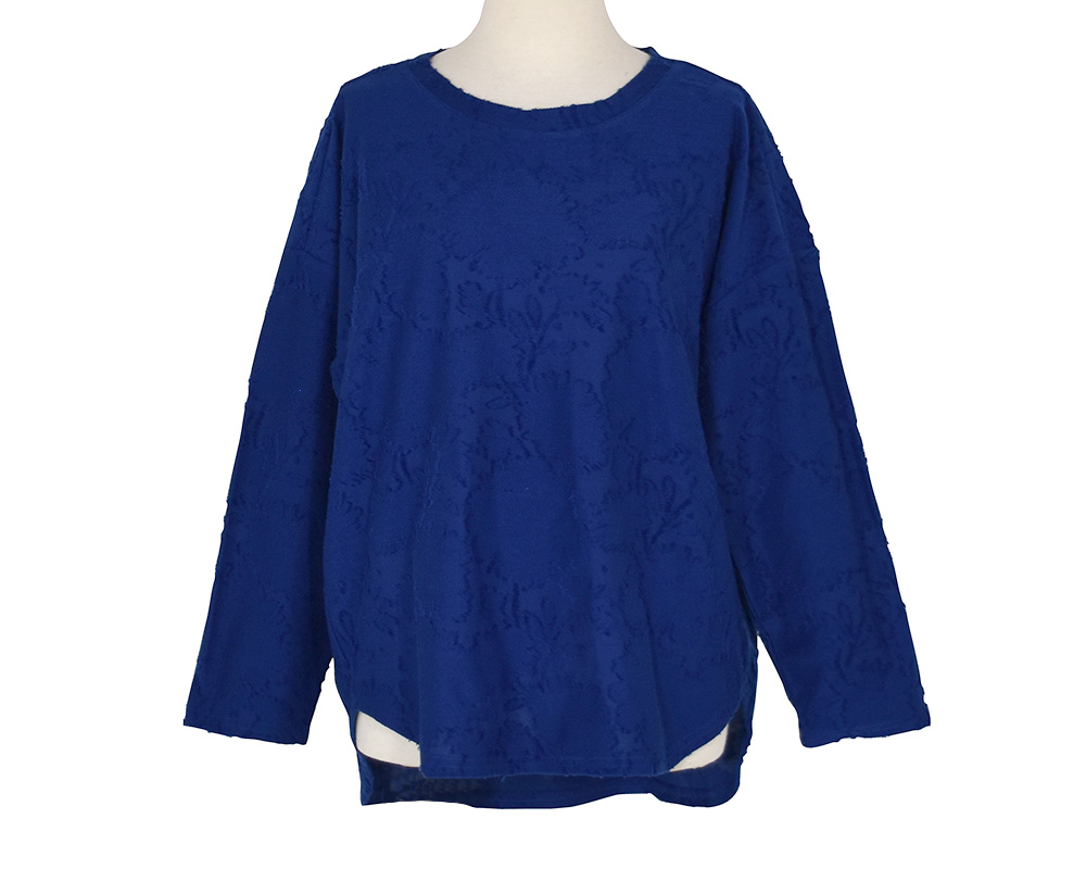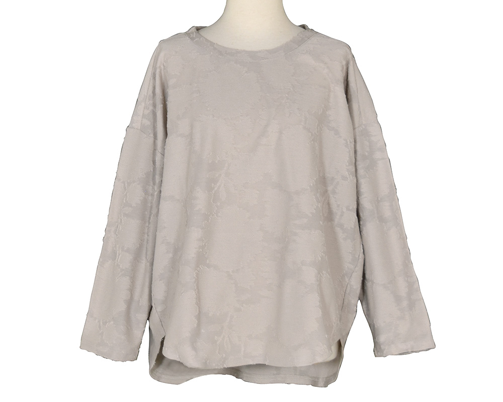 表情のある印象に仕上げたジャカードのロングTシャツです。ラインを拾いにくい程よいゆるさと、ラウンドヘムにより、一枚でも自然に着こなせるバランスに仕上げました。カジュアルからきれいめまで幅広いスタイリングに対応するアイテムです。