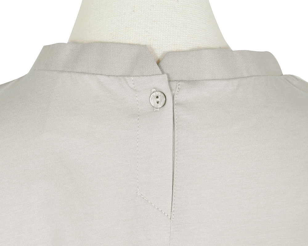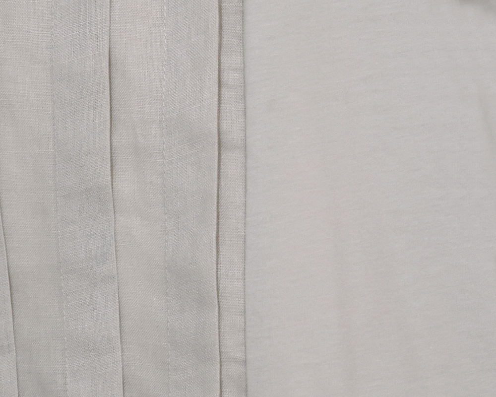 コットン100%で編み立てた、薄手でありながらコシとハリのある天竺素材です。シルケット加工で毛羽の少ないさらりとした風合いに仕上げています。フロント部分はリネンコットン布帛を使用しています。
