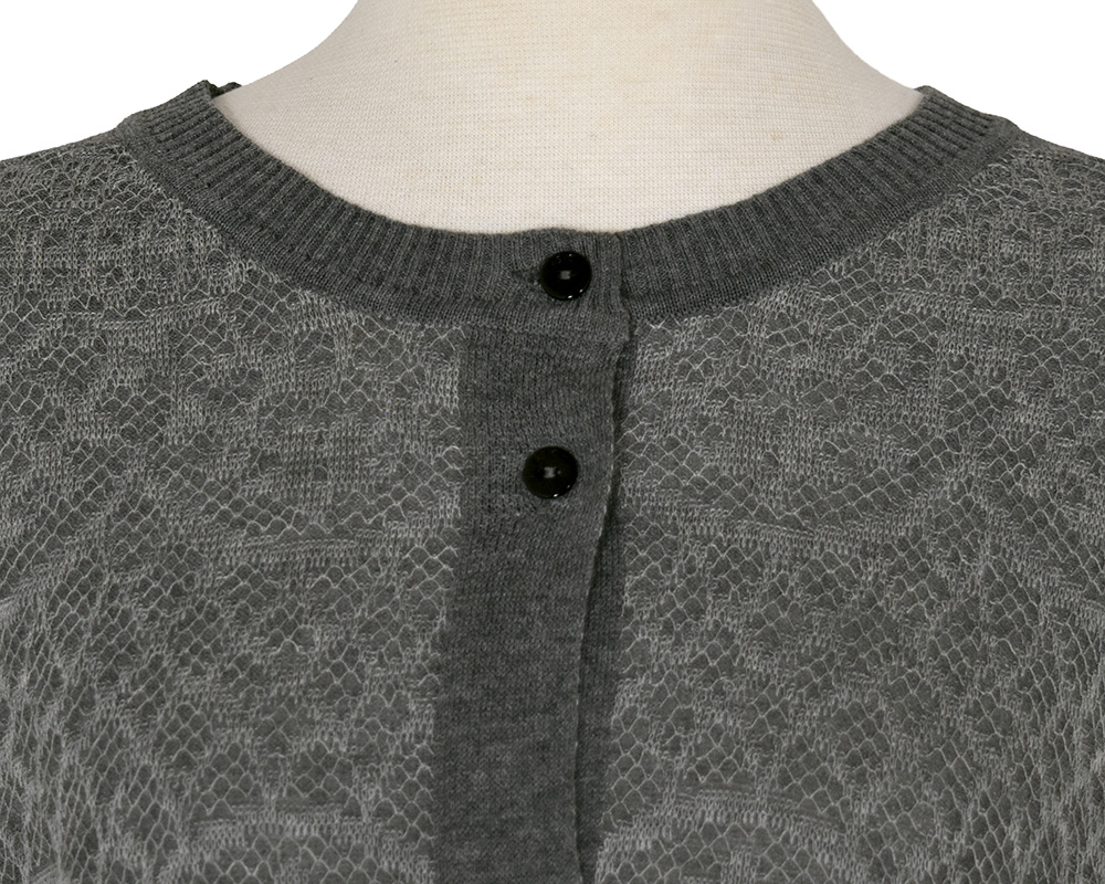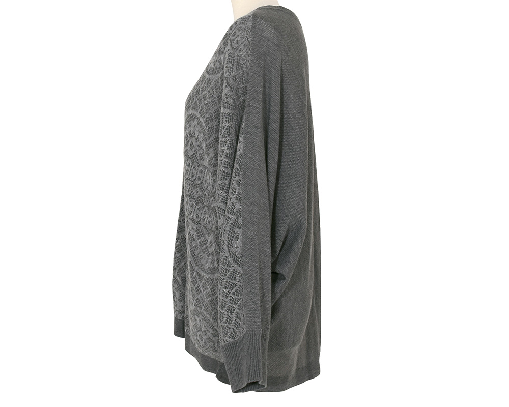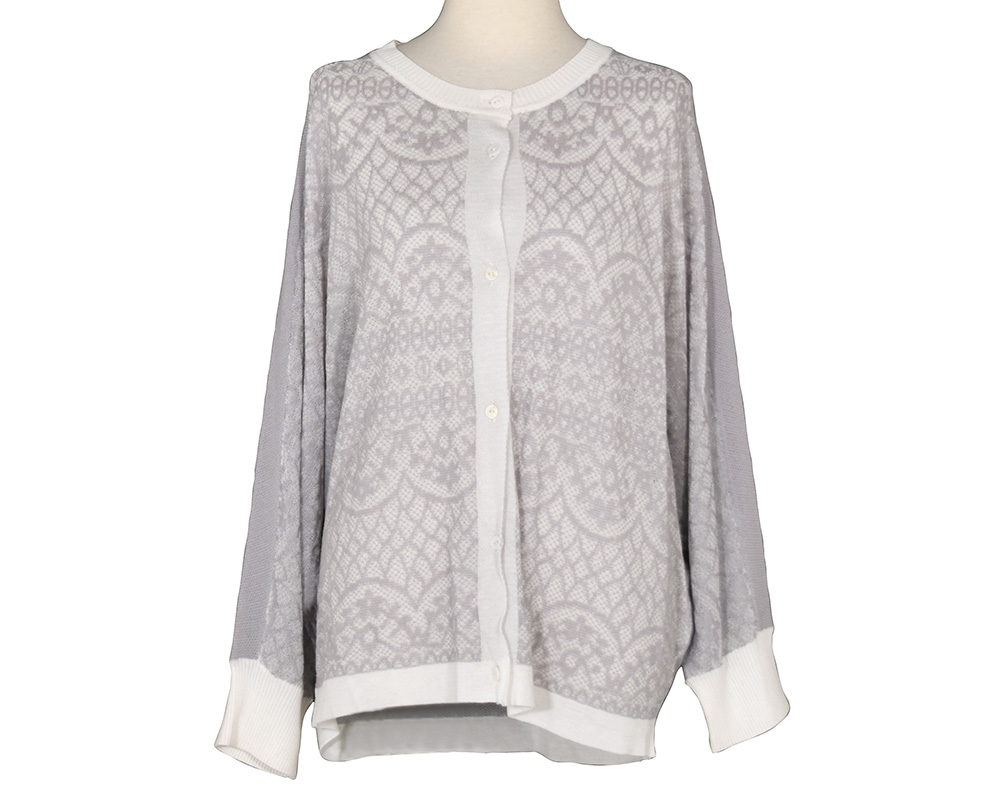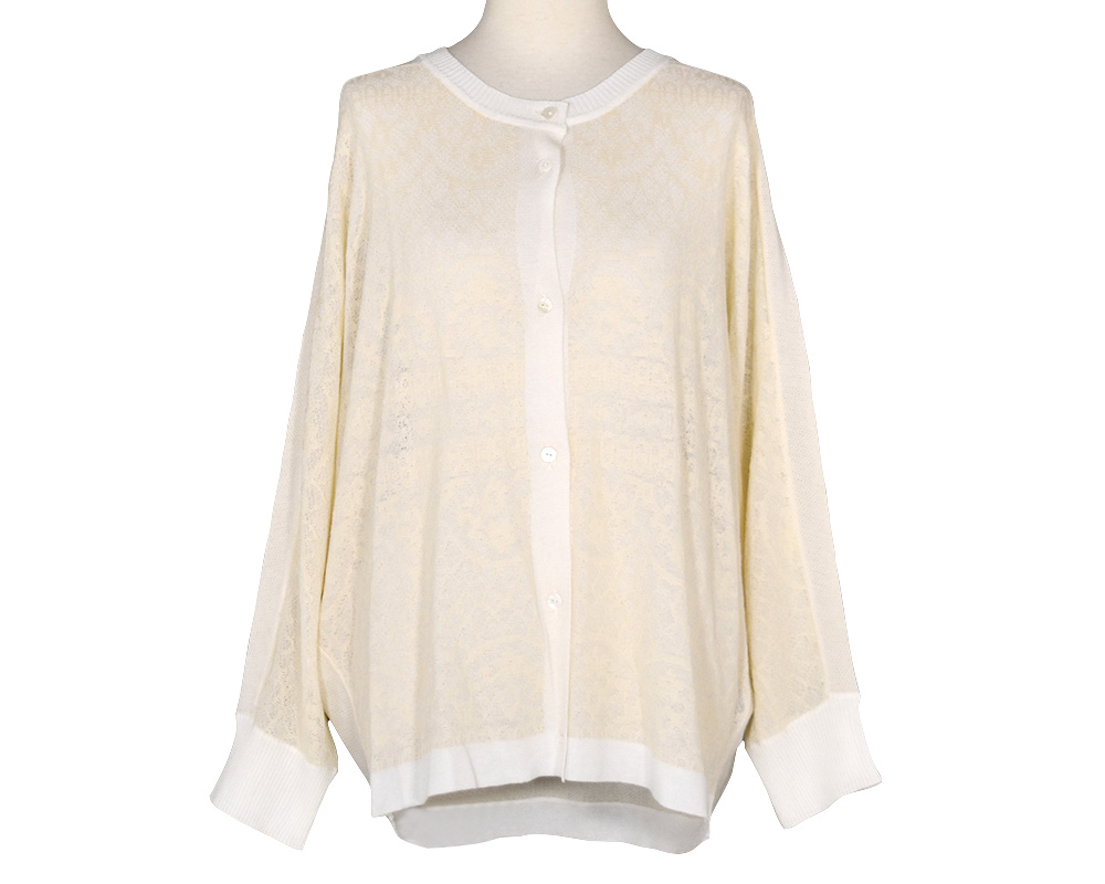 繊細なレースをジャカード柄で表現した、華やかな印象のドルマンカーディガンです。前後で異なる編地に切り替えることで表情に変化をつけ、ドルマンスリーブによりレイヤードしやすく、リラックスした着心地に仕上げています。