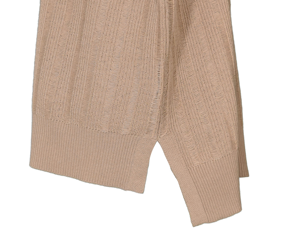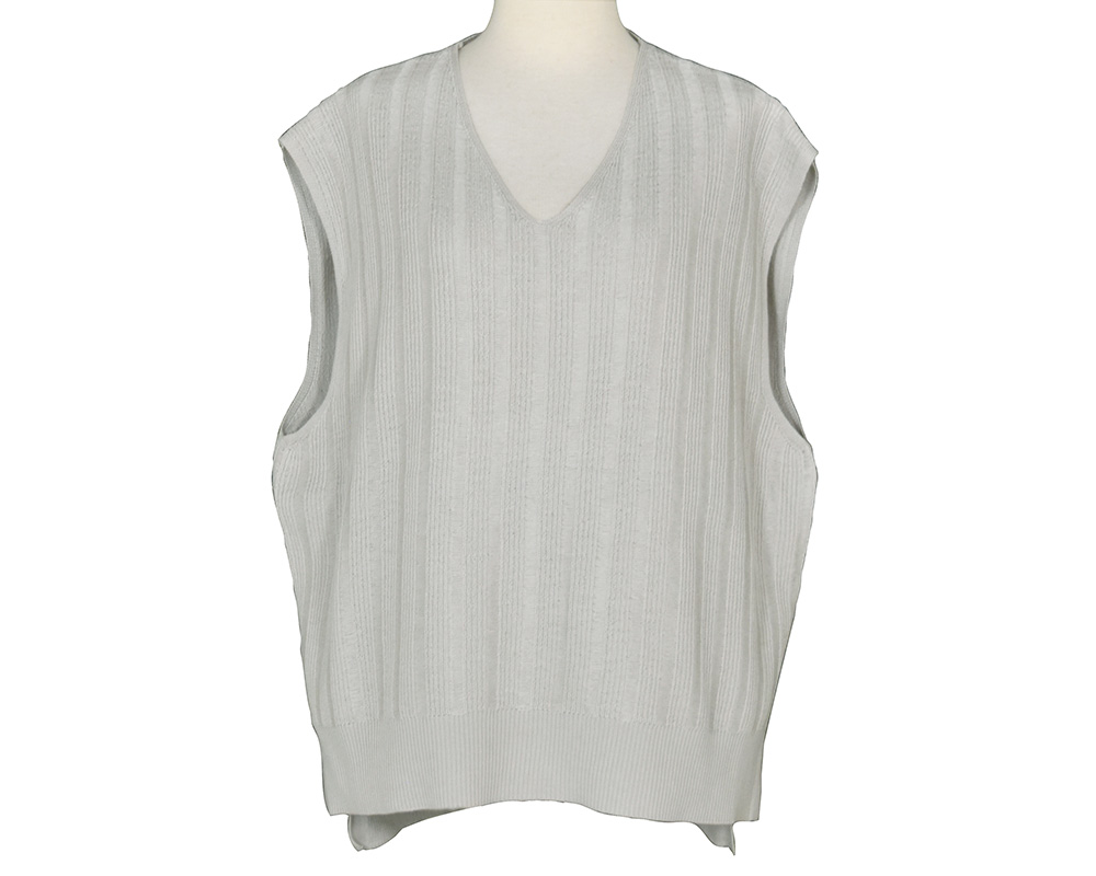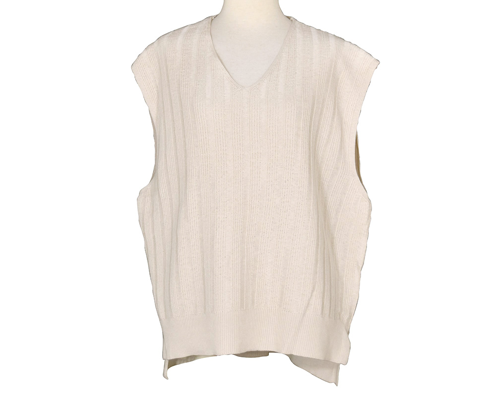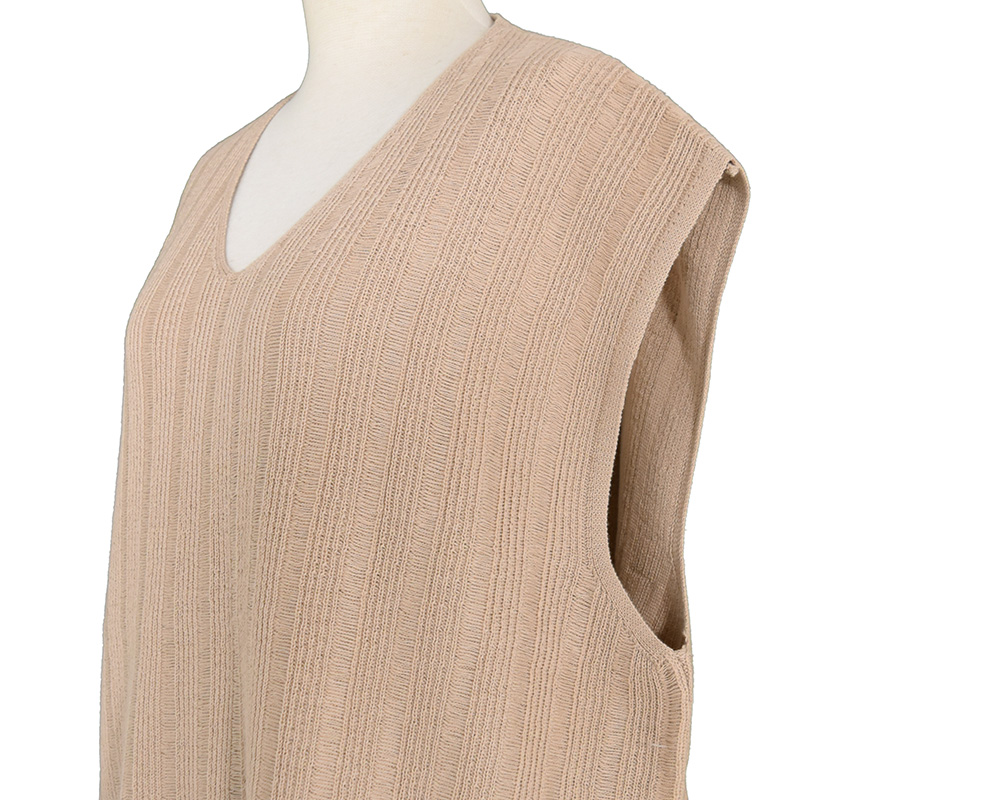フリンジ編みのループをカットせずに残した、表情のある編地のベストです。Tシャツやシャツなど、さまざまなアイテムとのレイヤードが楽しめます。シーズンレスで活躍してくれる一着です。